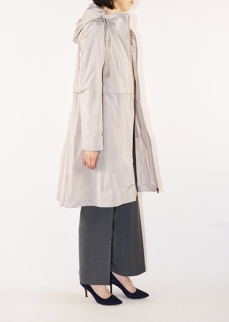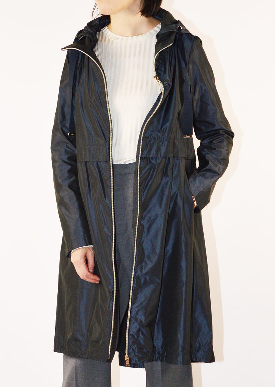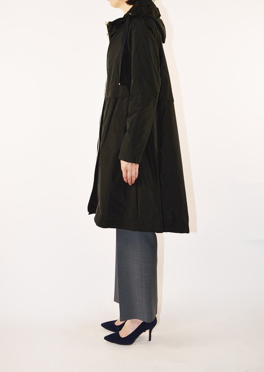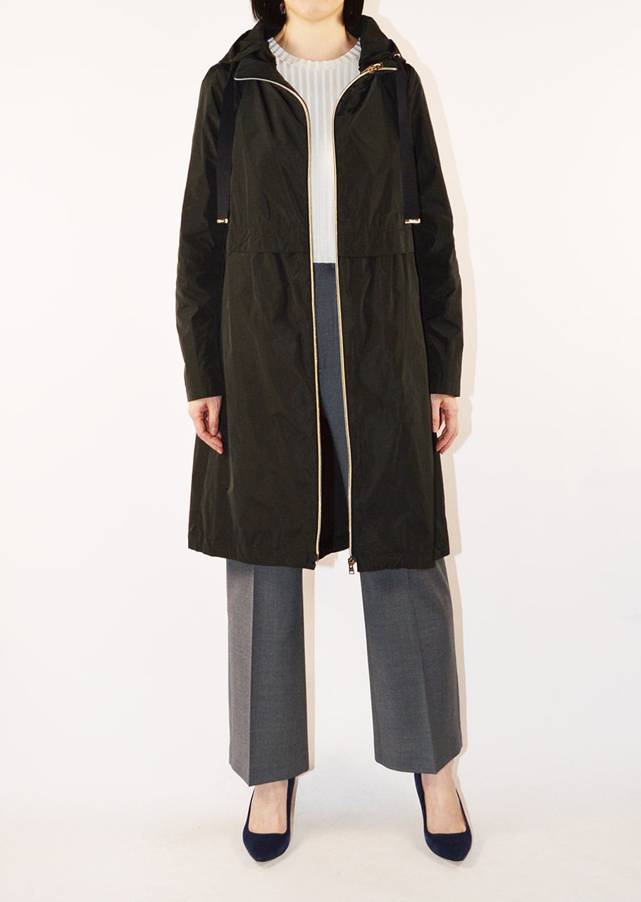 身頃に切り替えのデザインがあるフーデットロングコート。軽量ポリエステル素材を使用した、ハリと滑らかな生地感が特徴です。シンプルなフォルムで汎用性の高いデザイン。長年に渡り人気を継続している春夏シーズンのベストセラーモデルです。