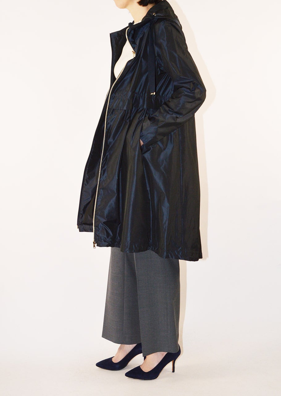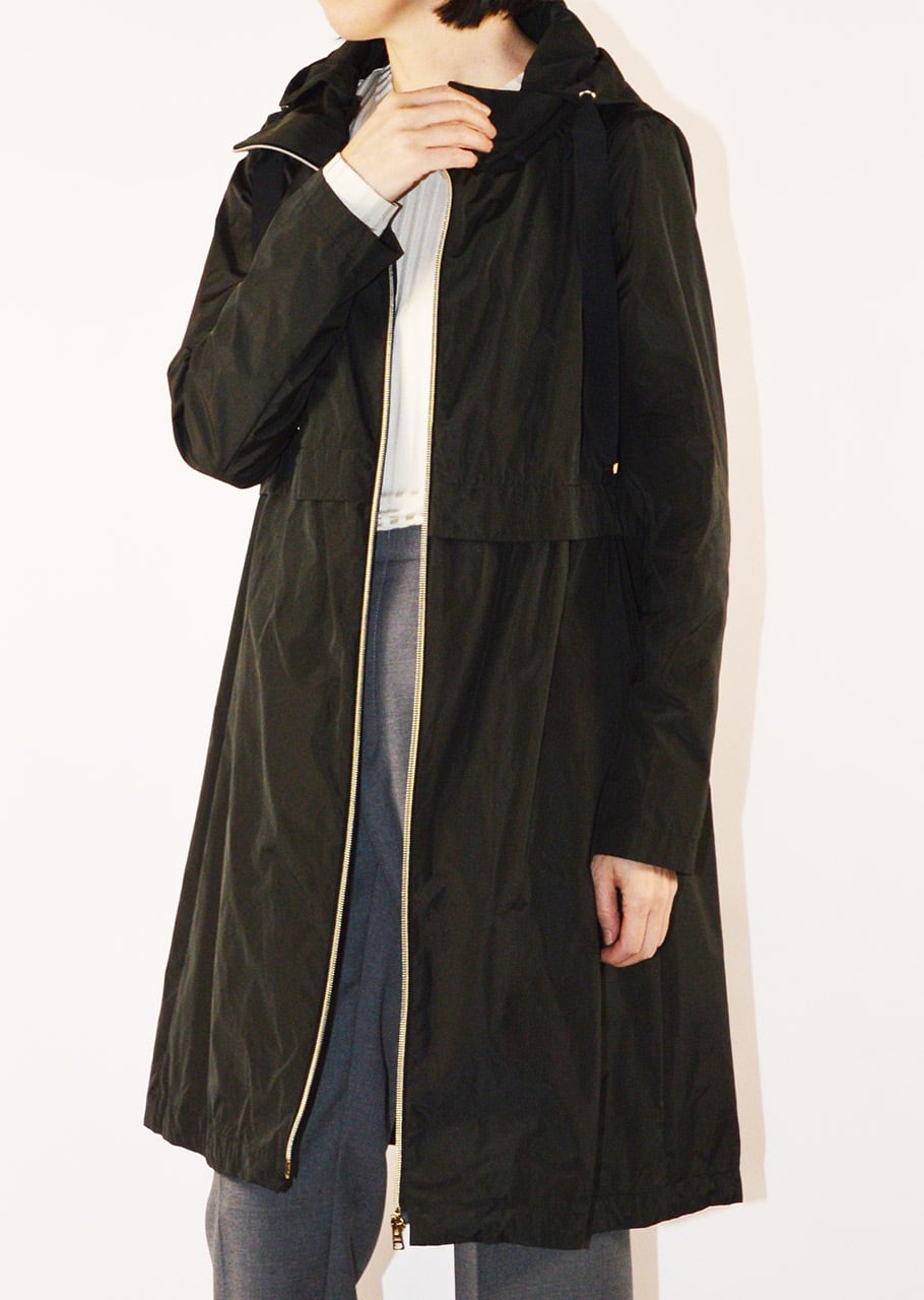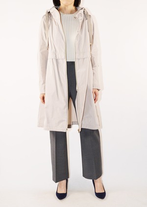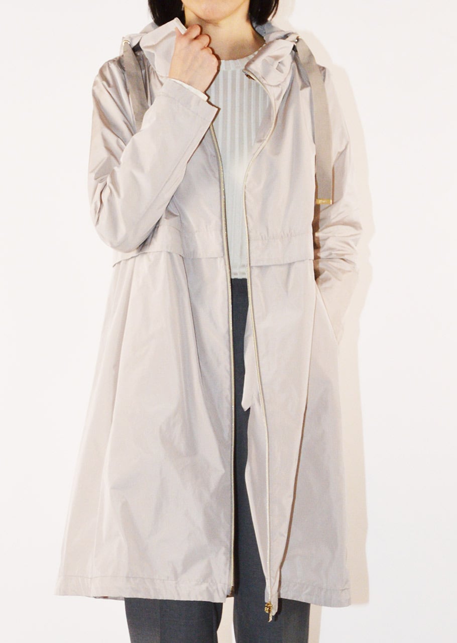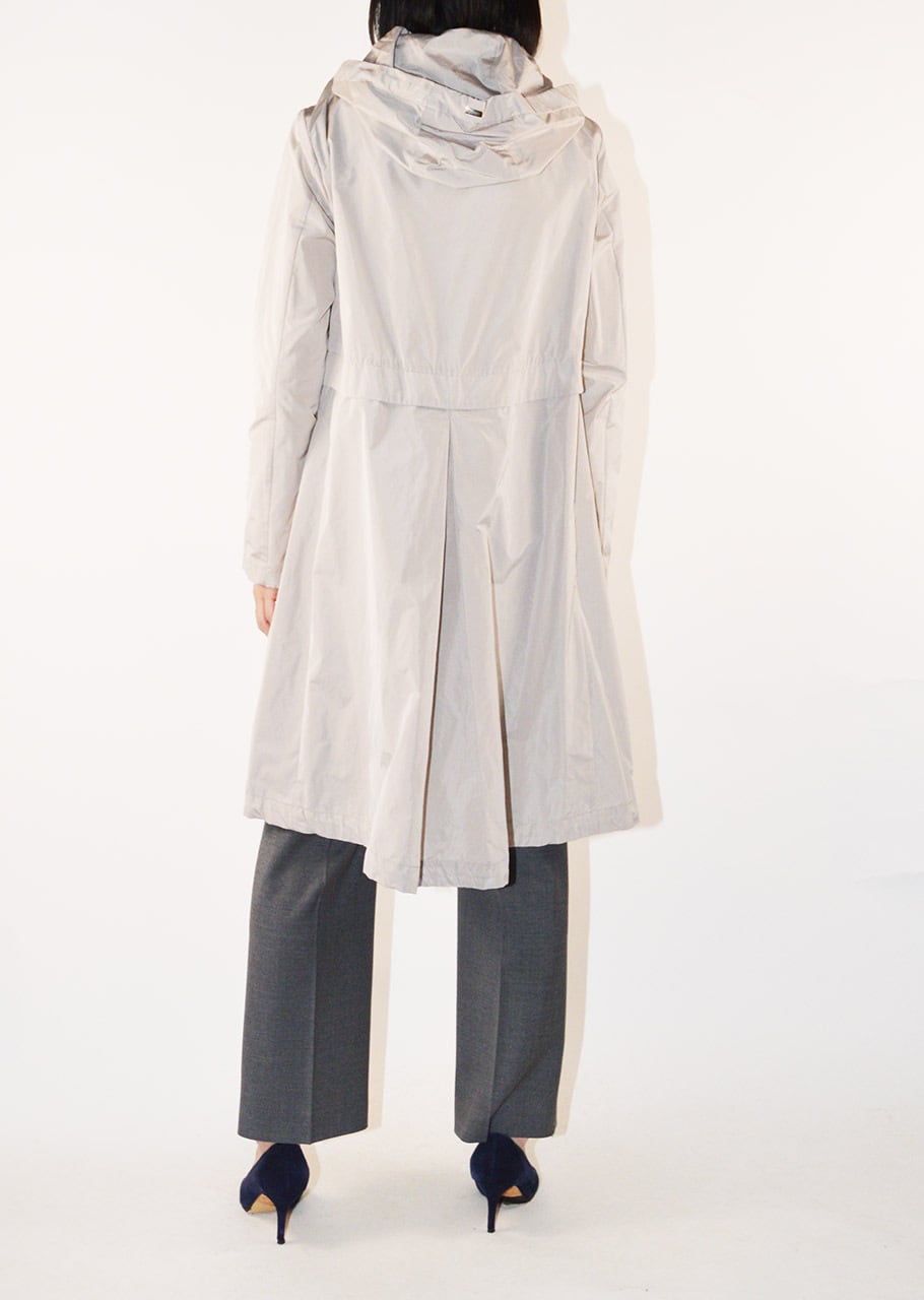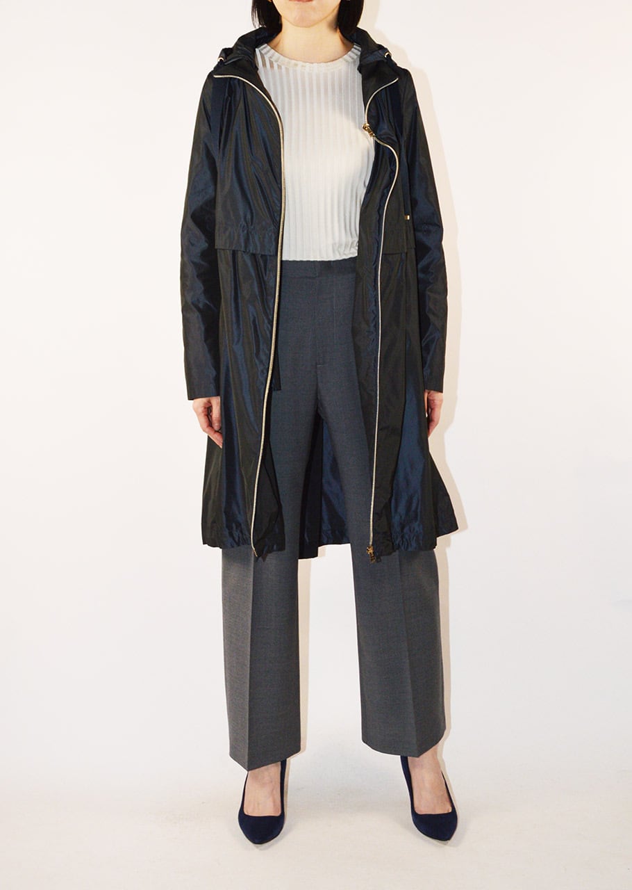 身頃に切り替えのデザインがあるフーデットロングコート。軽量ポリエステル素材を使用した、ハリと滑らかな生地感が特徴です。シンプルなフォルムで汎用性の高いデザイン。長年に渡り人気を継続している春夏シーズンのベストセラーモデルです。