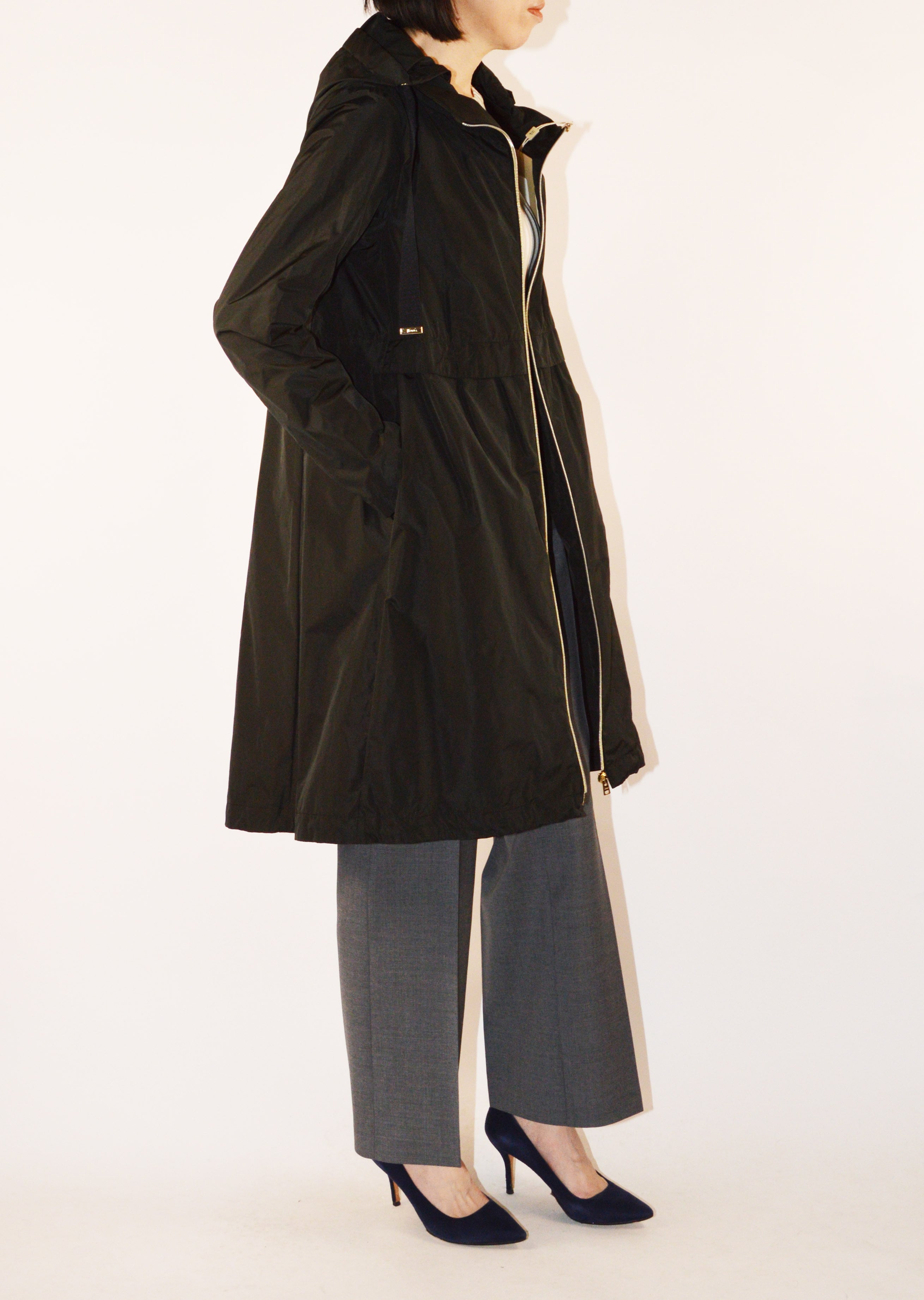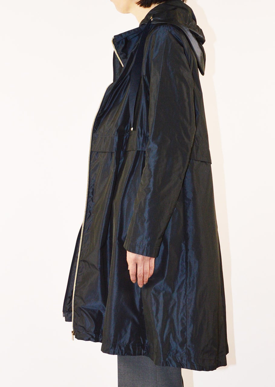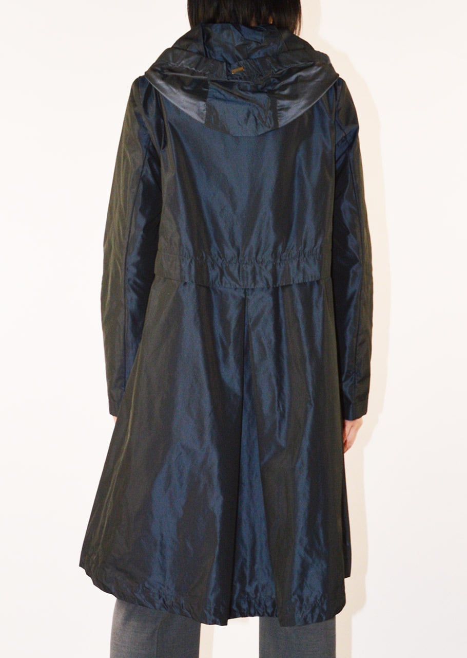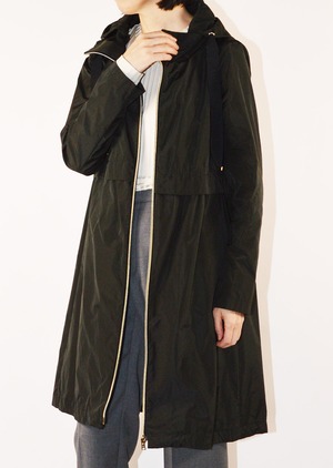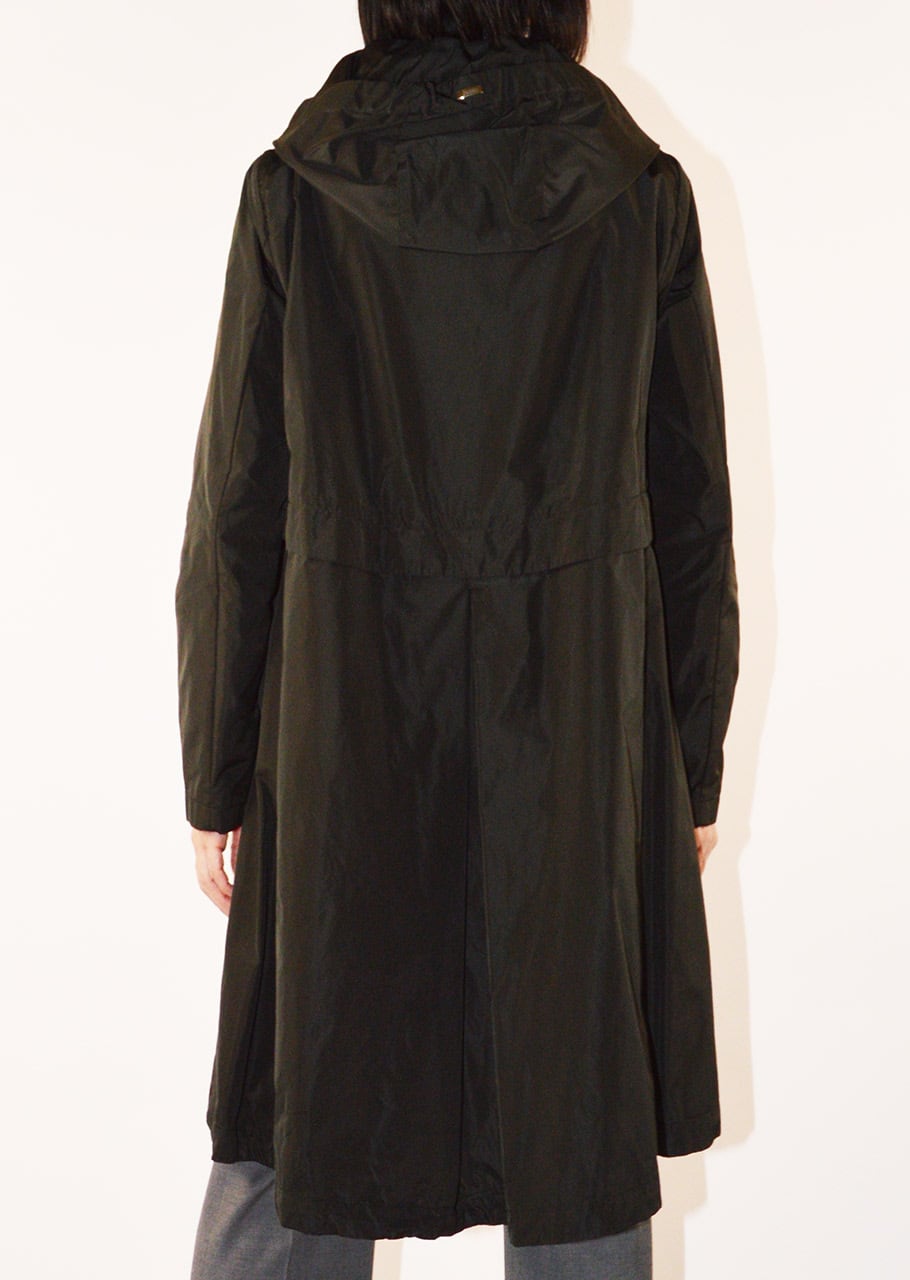 身頃に切り替えのデザインがあるフーデットロングコート。軽量ポリエステル素材を使用した、ハリと滑らかな生地感が特徴です。シンプルなフォルムで汎用性の高いデザイン。長年に渡り人気を継続している春夏シーズンのベストセラーモデルです。