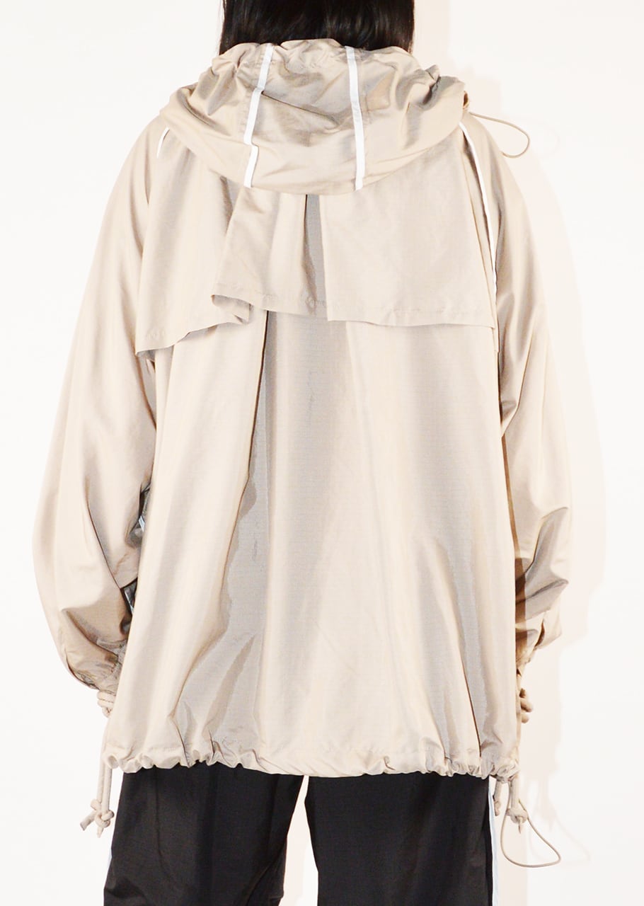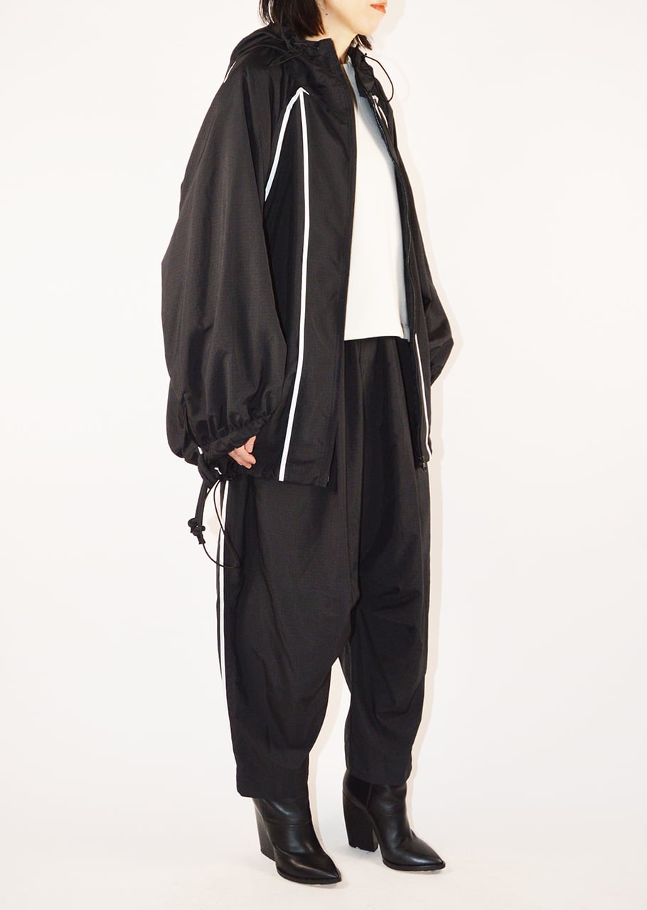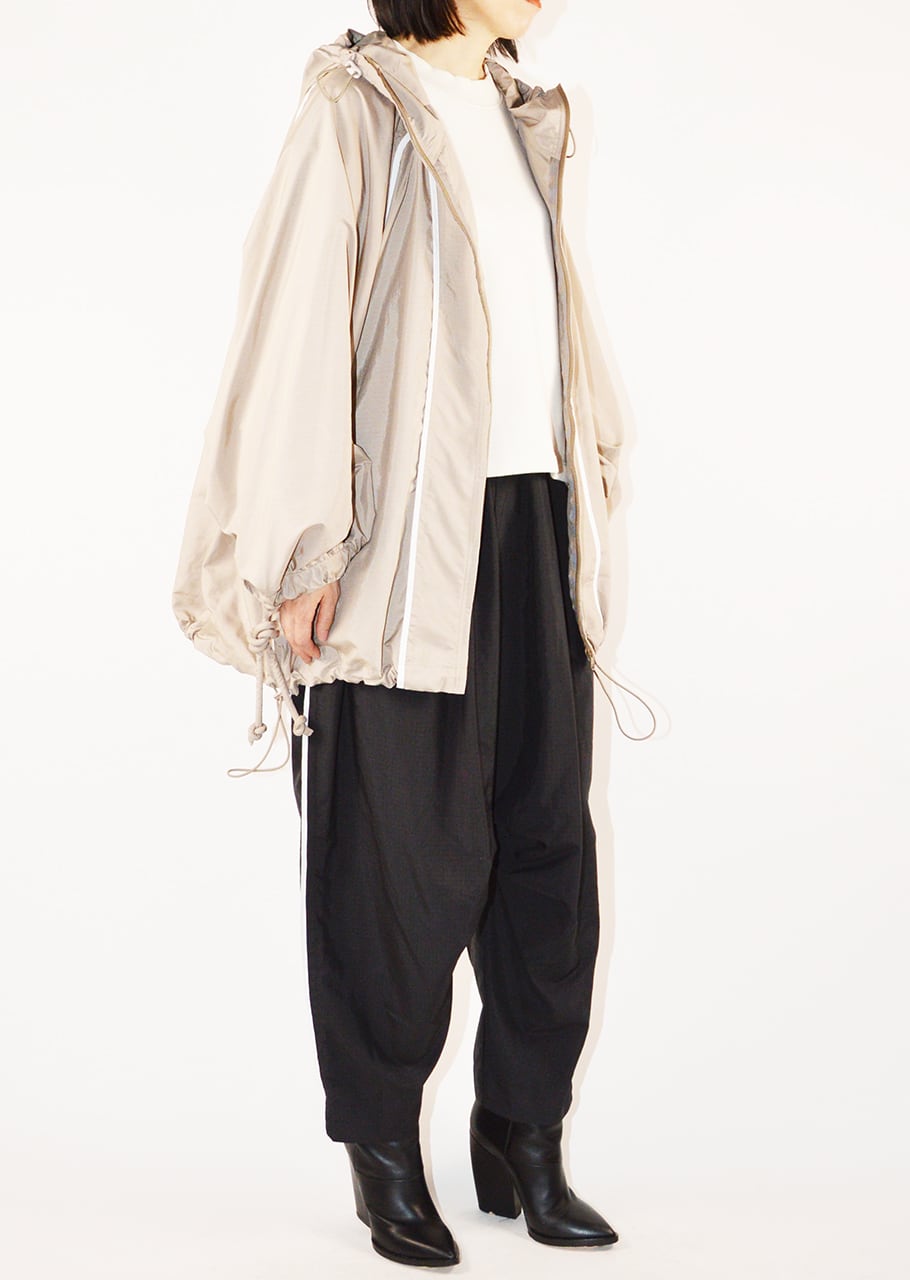 リサイクルポリエステル100%のファブリックを用いたブルゾンです。格子状に繊維が織り込まれた強度のある素材としてアウトドア用品に使用される事の多い素材で、リラックスして着られるボリューム感。裾元、袖元、フードには絞りがついていて、絞りの加減で様々なシルエットを楽しめます。袖口には太いコードで絞れる様になっている他、ラグランスリーブ切替・身頃両サイド・フードに施されたパイピングがアクセントなっています。