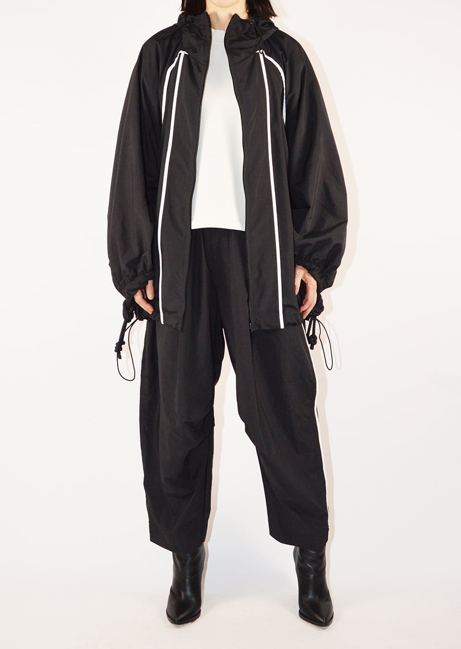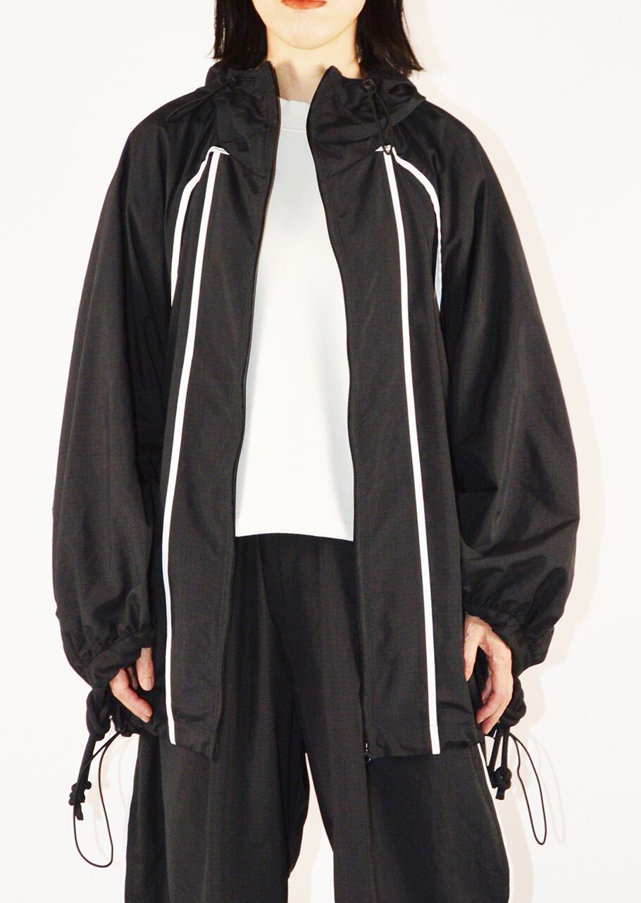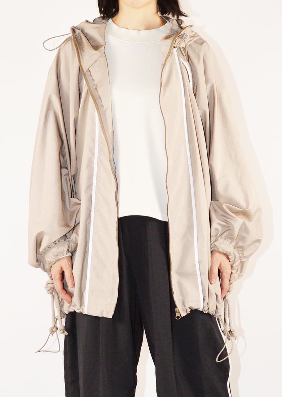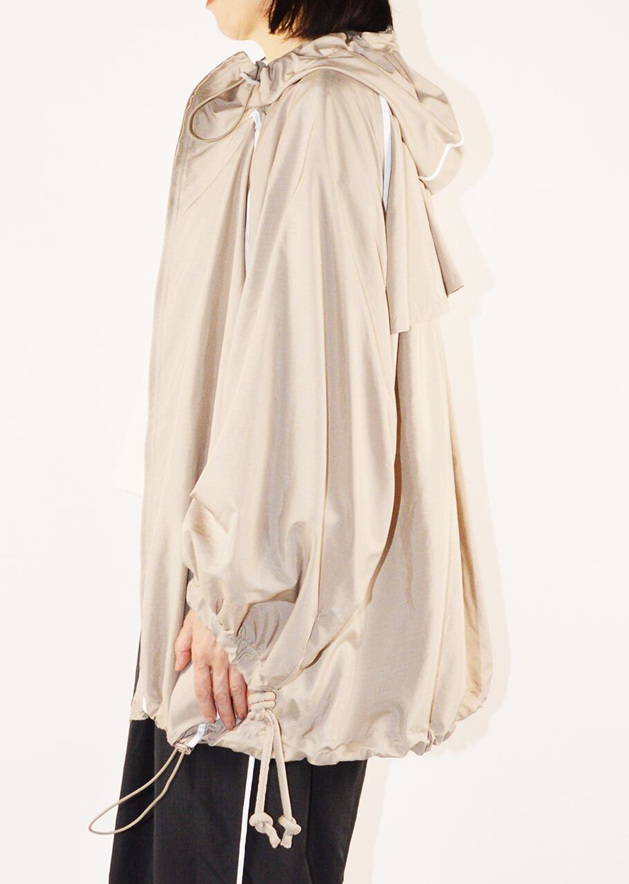 リサイクルポリエステル100%のファブリックを用いたブルゾンです。格子状に繊維が織り込まれた強度のある素材としてアウトドア用品に使用される事の多い素材で、リラックスして着られるボリューム感。裾元、袖元、フードには絞りがついていて、絞りの加減で様々なシルエットを楽しめます。袖口には太いコードで絞れる様になっている他、ラグランスリーブ切替・身頃両サイド・フードに施されたパイピングがアクセントなっています。