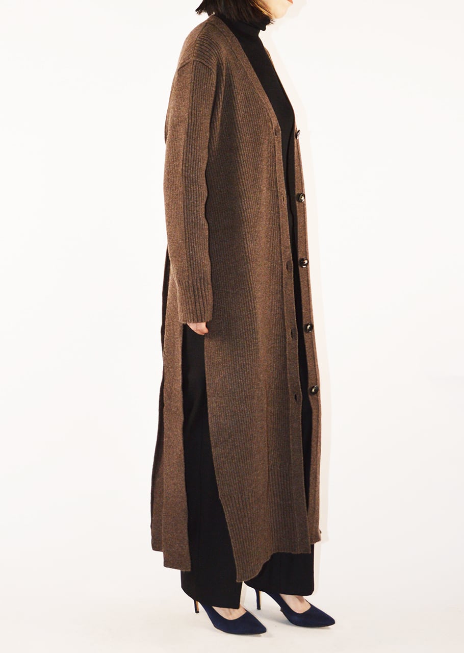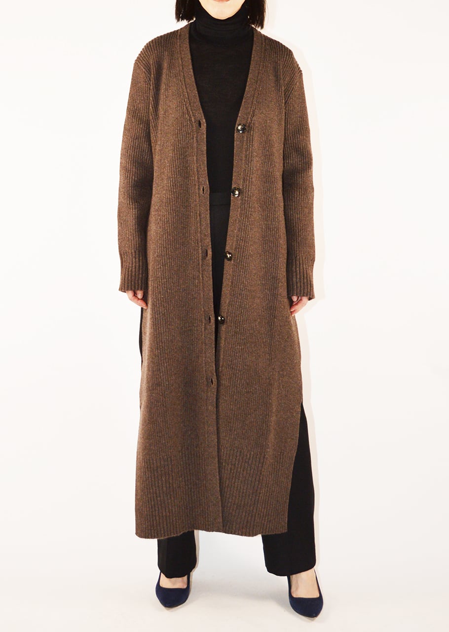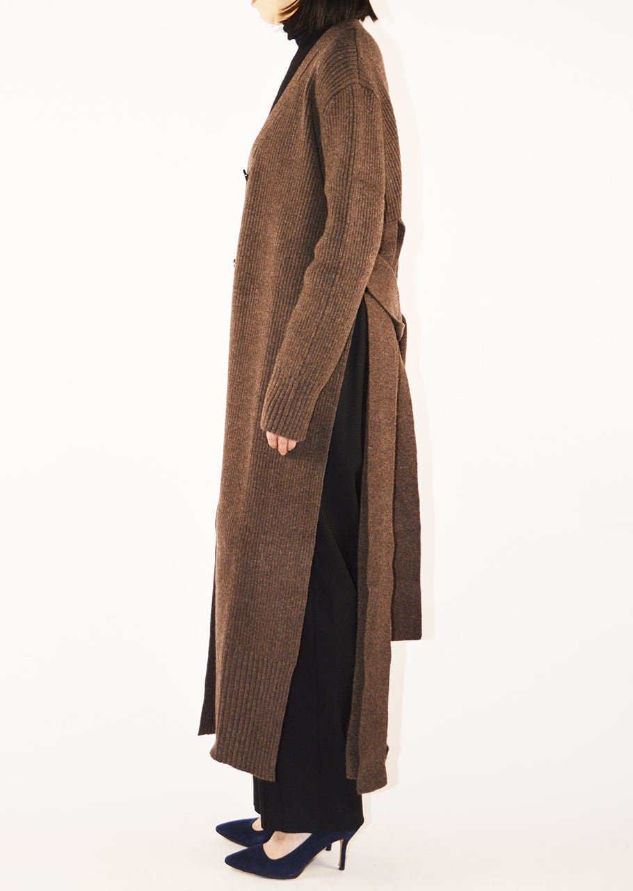 バックディテールが新しいニュアンスを生み出すロングニットカーディガン。上質なウールベース素材で編み立てられ、ミニマルでありながら個性的なバランスを持ったカーディガンです。