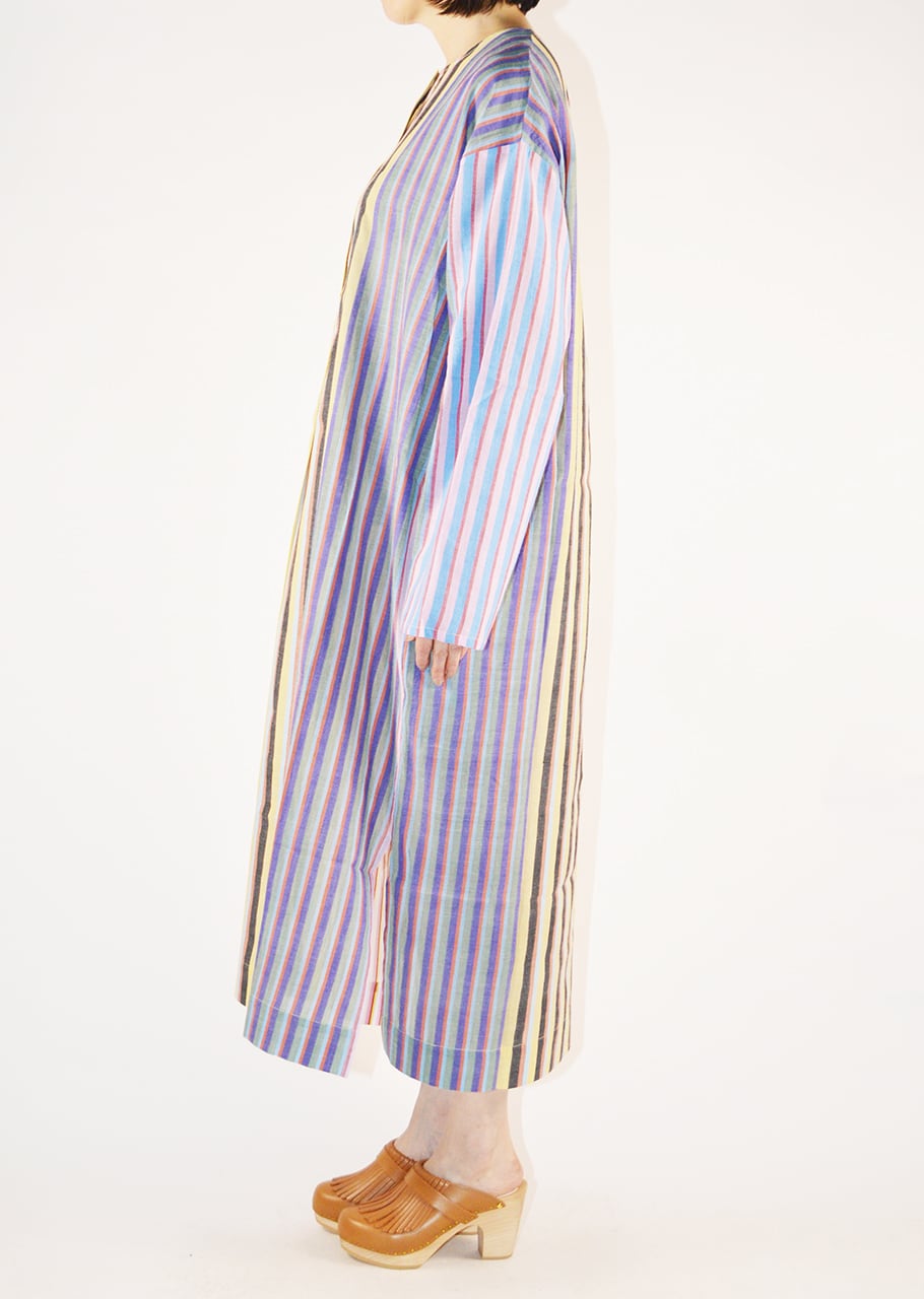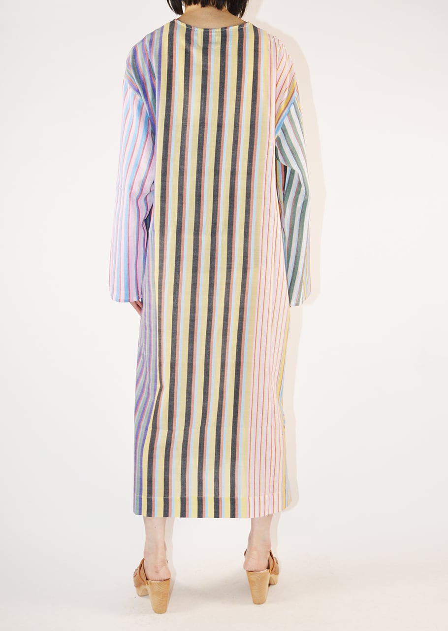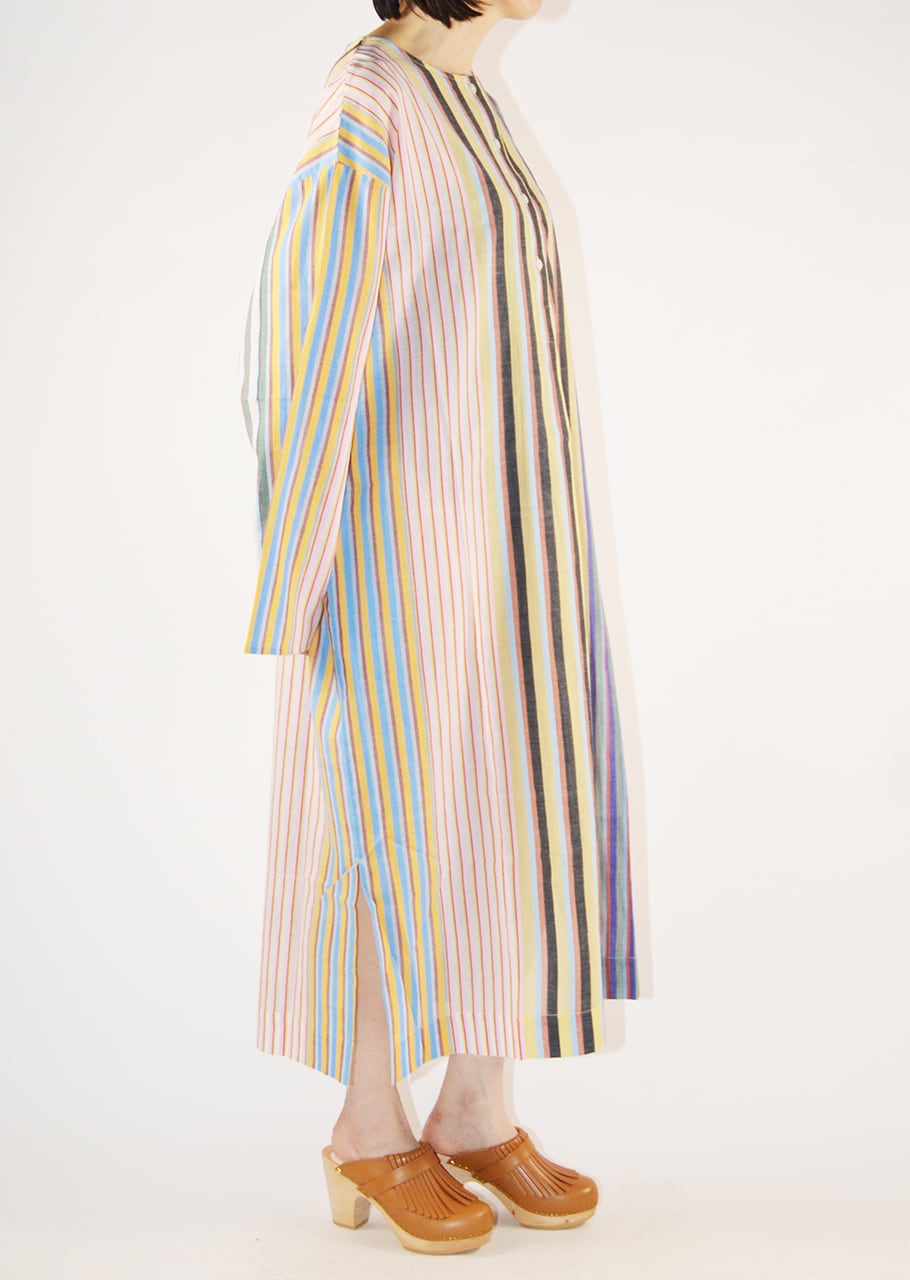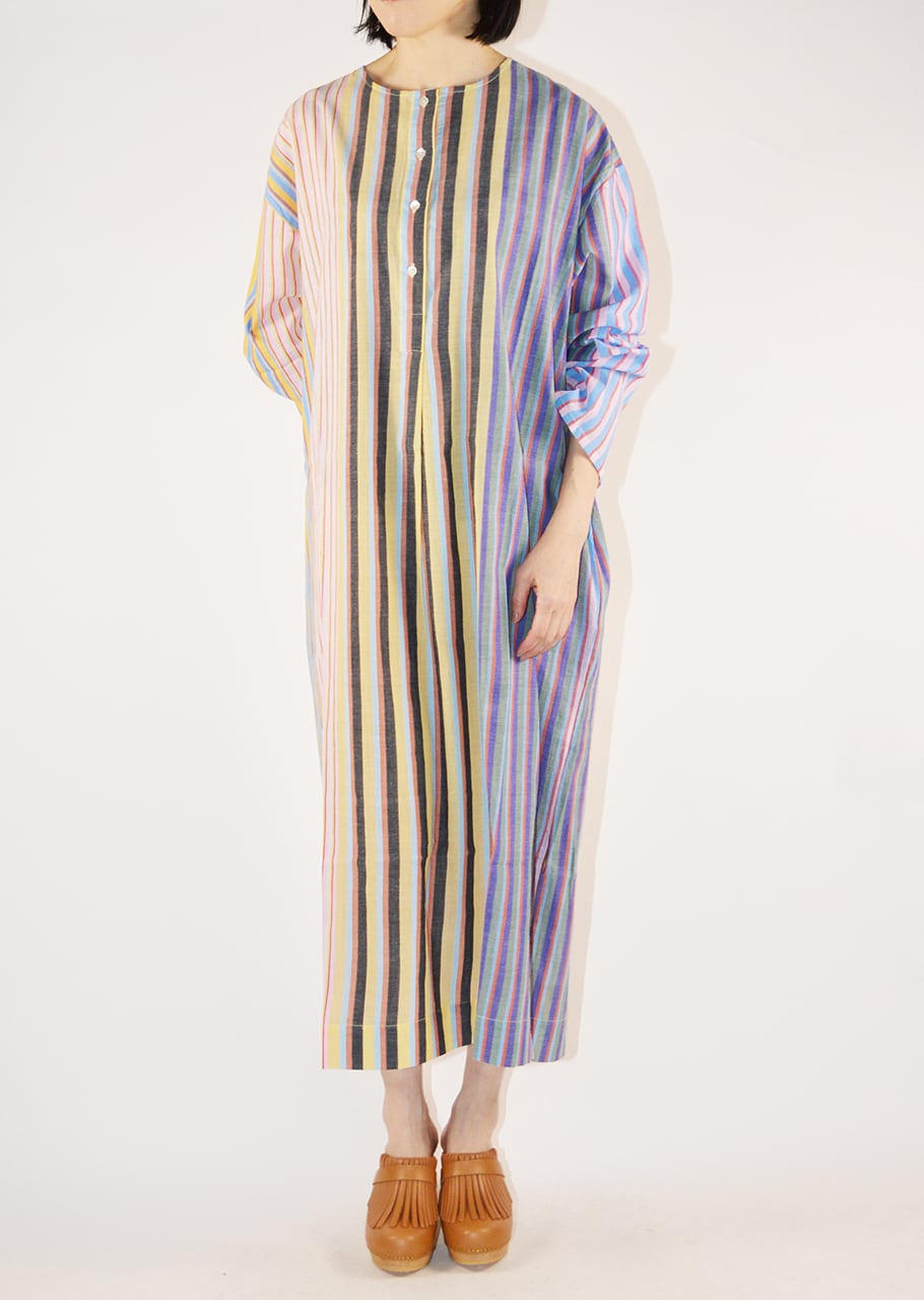 コットン100%のロングスリーブドレス。たっぷりとしたボディラインで、マルチストライプは南フランスにインスパイアされたもの。鮮やかでありながらどこかシックなカラーリングで、大人の女性も取り入れやすい。