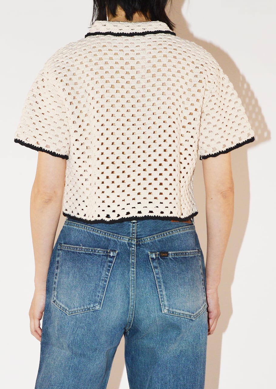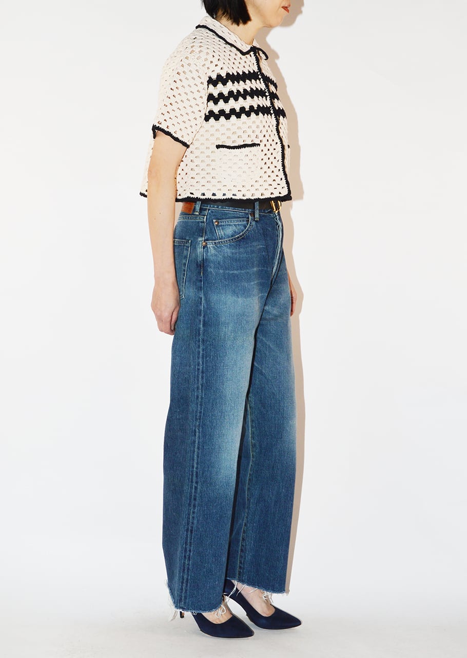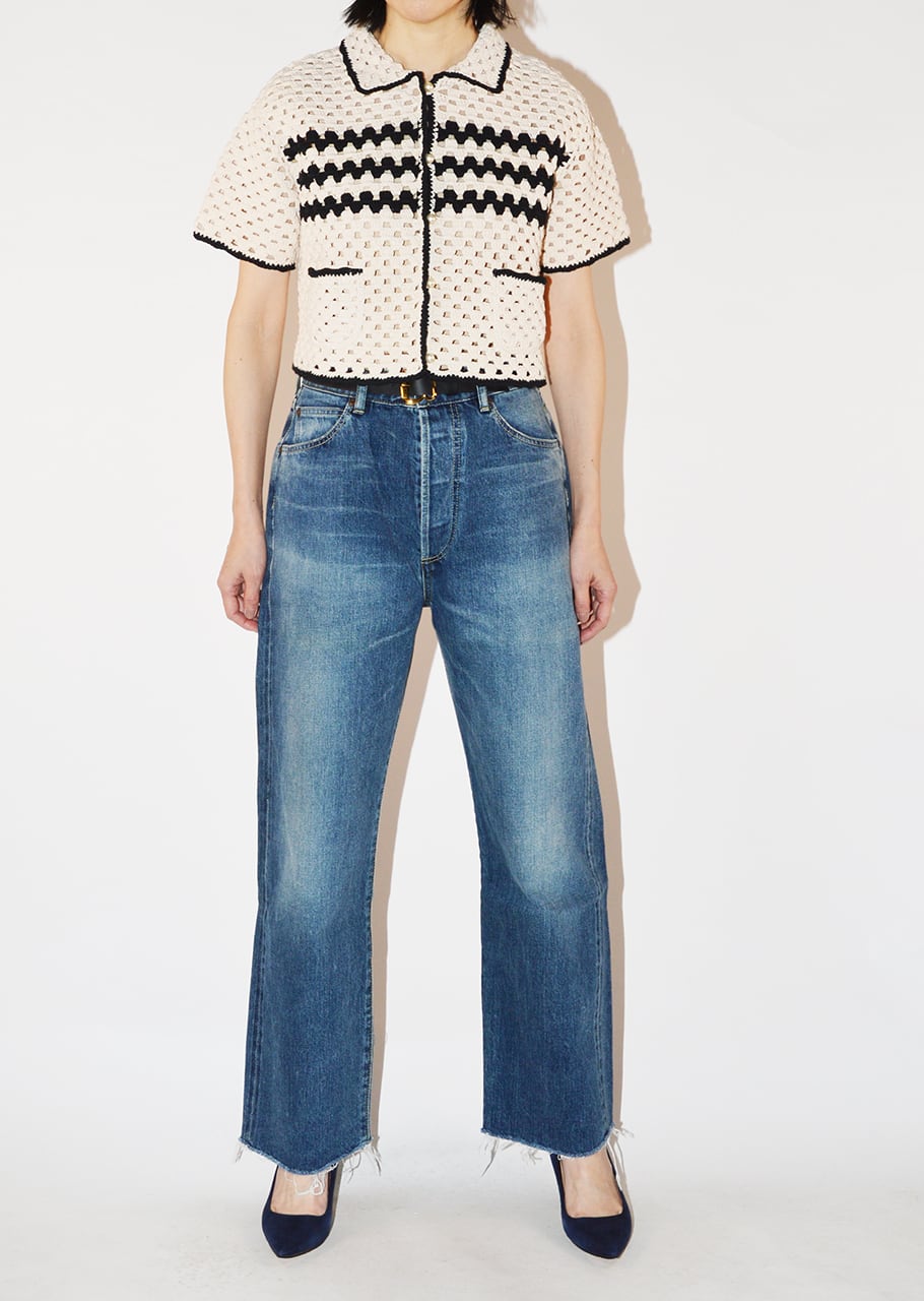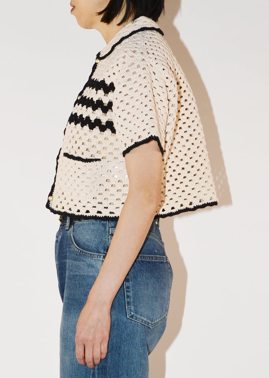 丁寧なハンドメイドならではのぬくもりと抜け感ただようニットジャケット。丸みのある襟もとやコンパクトなショートレングスが女性らしく、ワイドパンツやボリュームスカートとも相性抜群。バイカラーのトリミングがカジュアル過ぎない大人っぽさを演出。