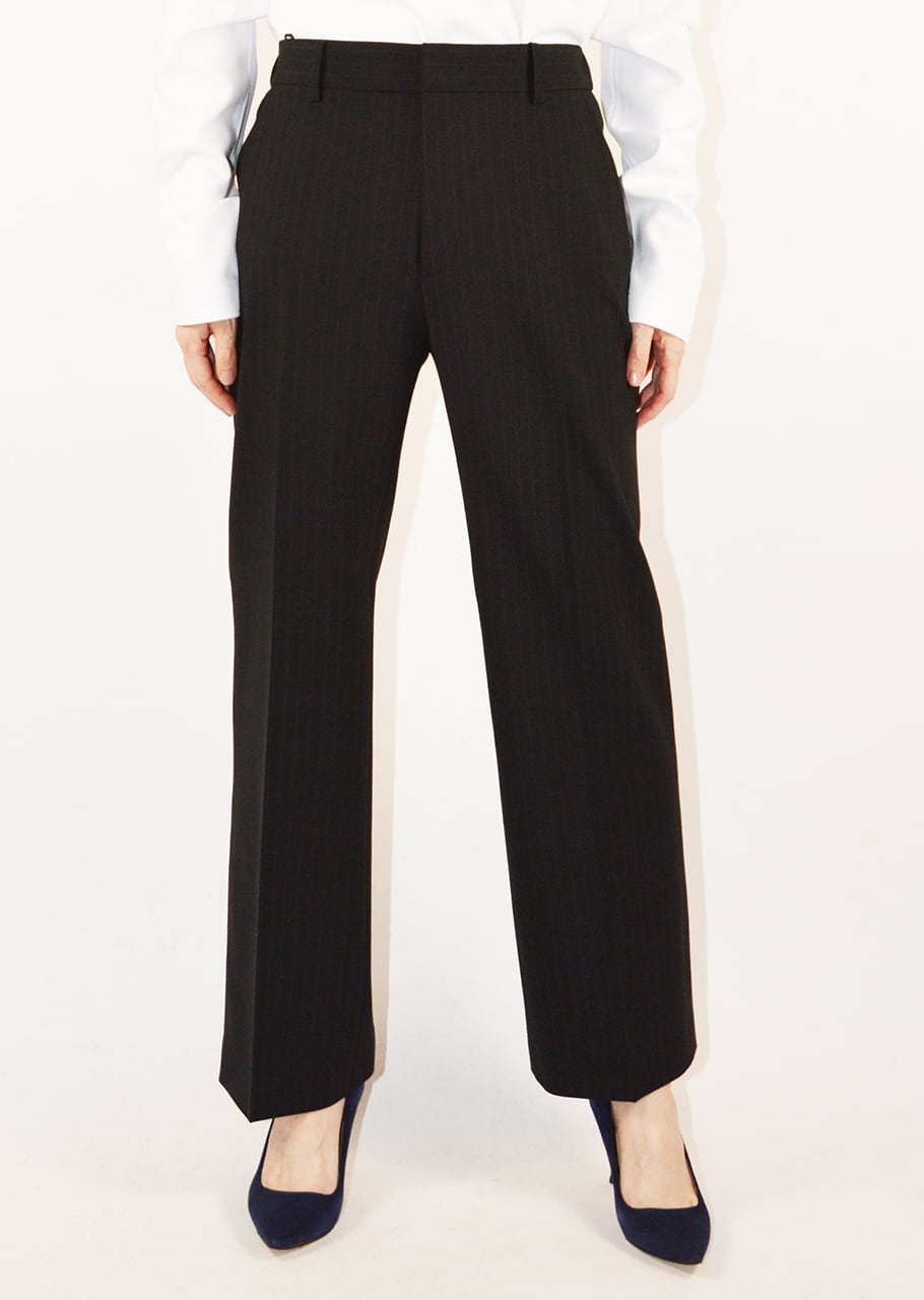 さりげないピンストライプがアクセントに。着ると必ずプロポーションが美しく見えるシルエットにぜひトライして!
