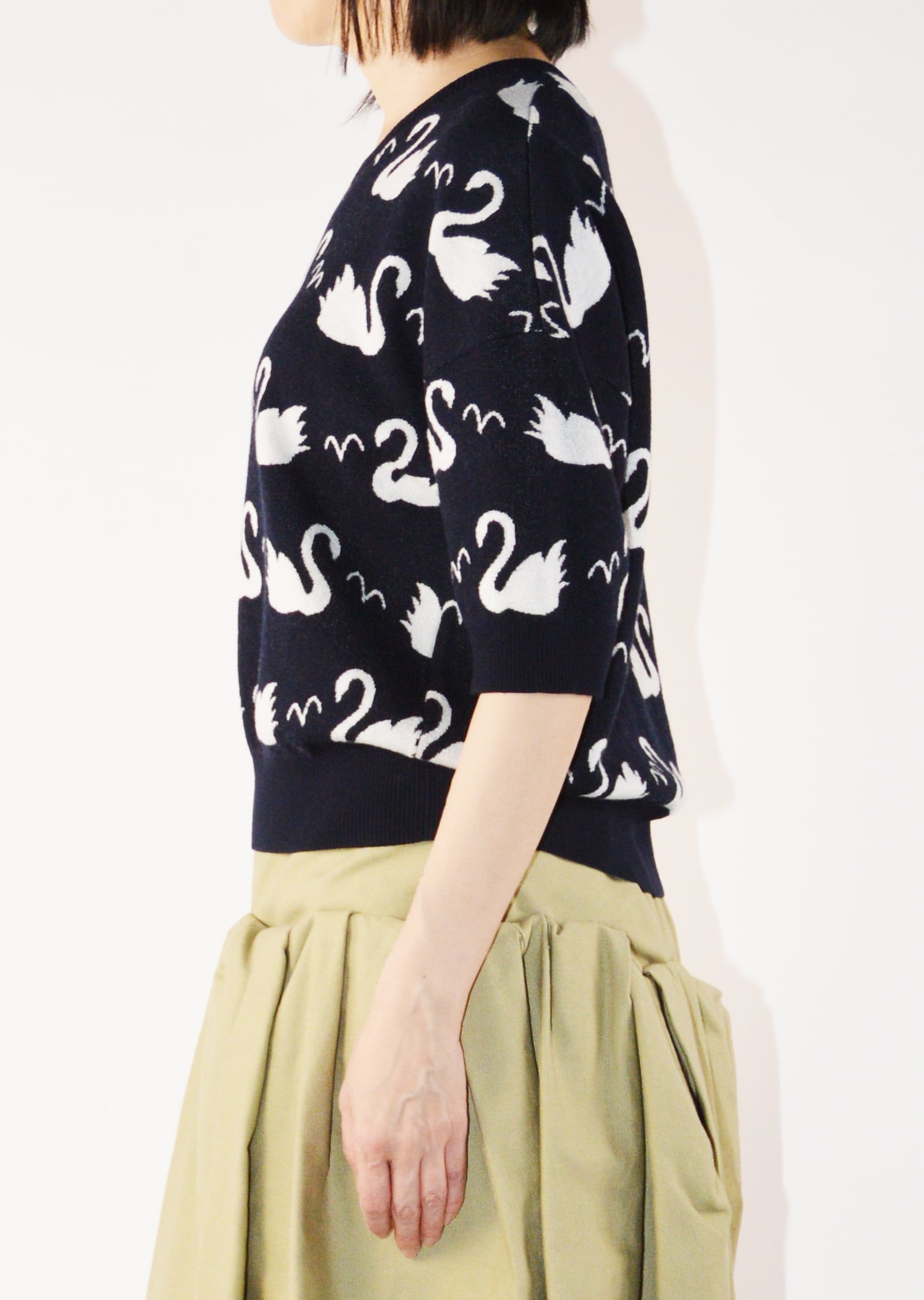 シンプルなラウンドネックニットにスワンモチーフをあしらい、ユニークな可愛らしさを感じさせるニットです。これをスタイリングに取り入れるだけで、明るく華のあるた趣きに。デニムに合わせてはもちろん、フェミニンなスカートを合わせてのコーディネートもおすすめです。