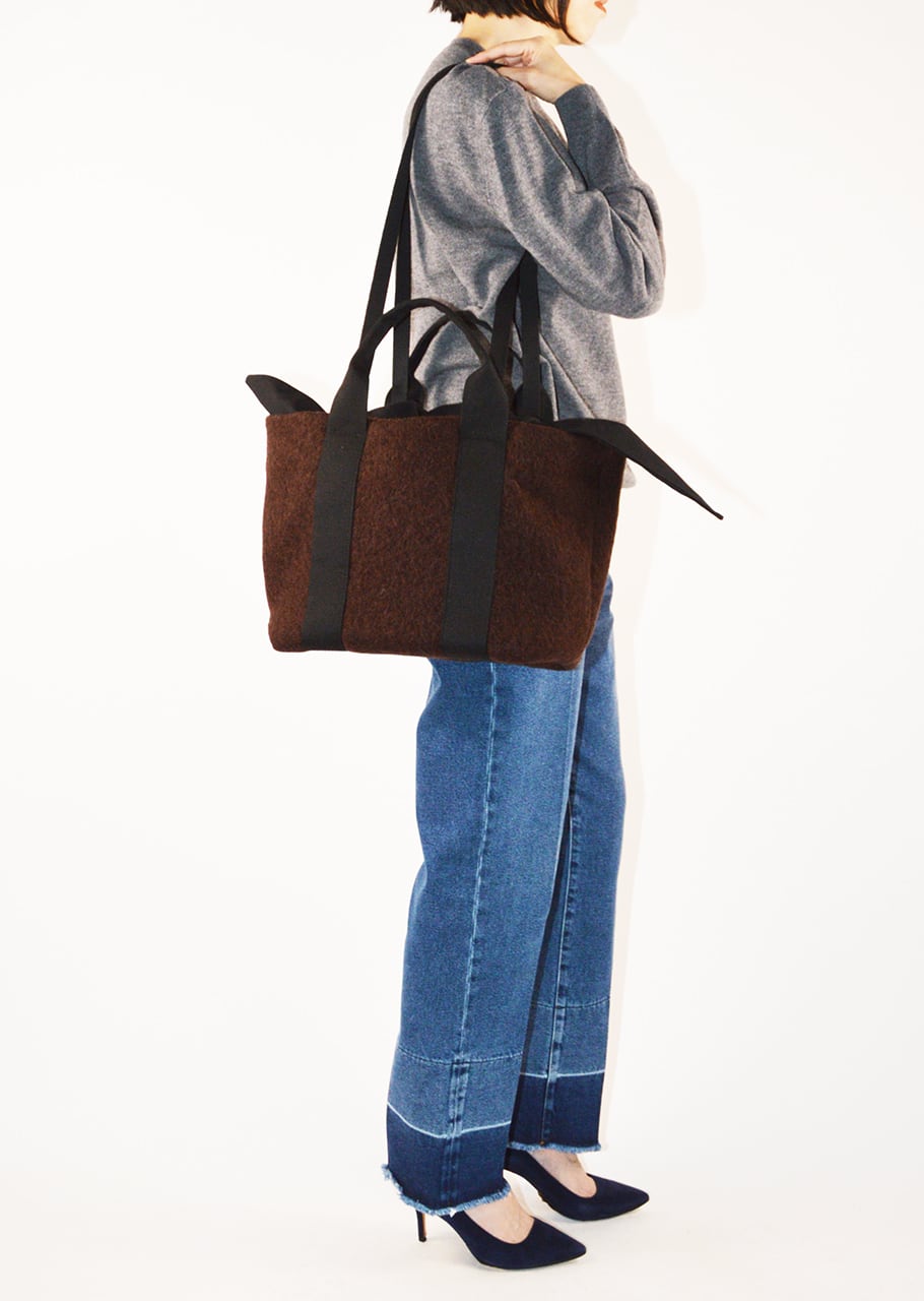 ウール素材を用いたトートバッグ。ウールならではのウォーム感ある質感が印象的です。A4サイズの書類も入るサイズ感でビジネスシーンでも活躍してくれます。バッグのトップ部分は裏地とつながったリボンを縛る仕様。秋冬らしい季節感をバッグでいち早く取り入れるのもおすすめです。