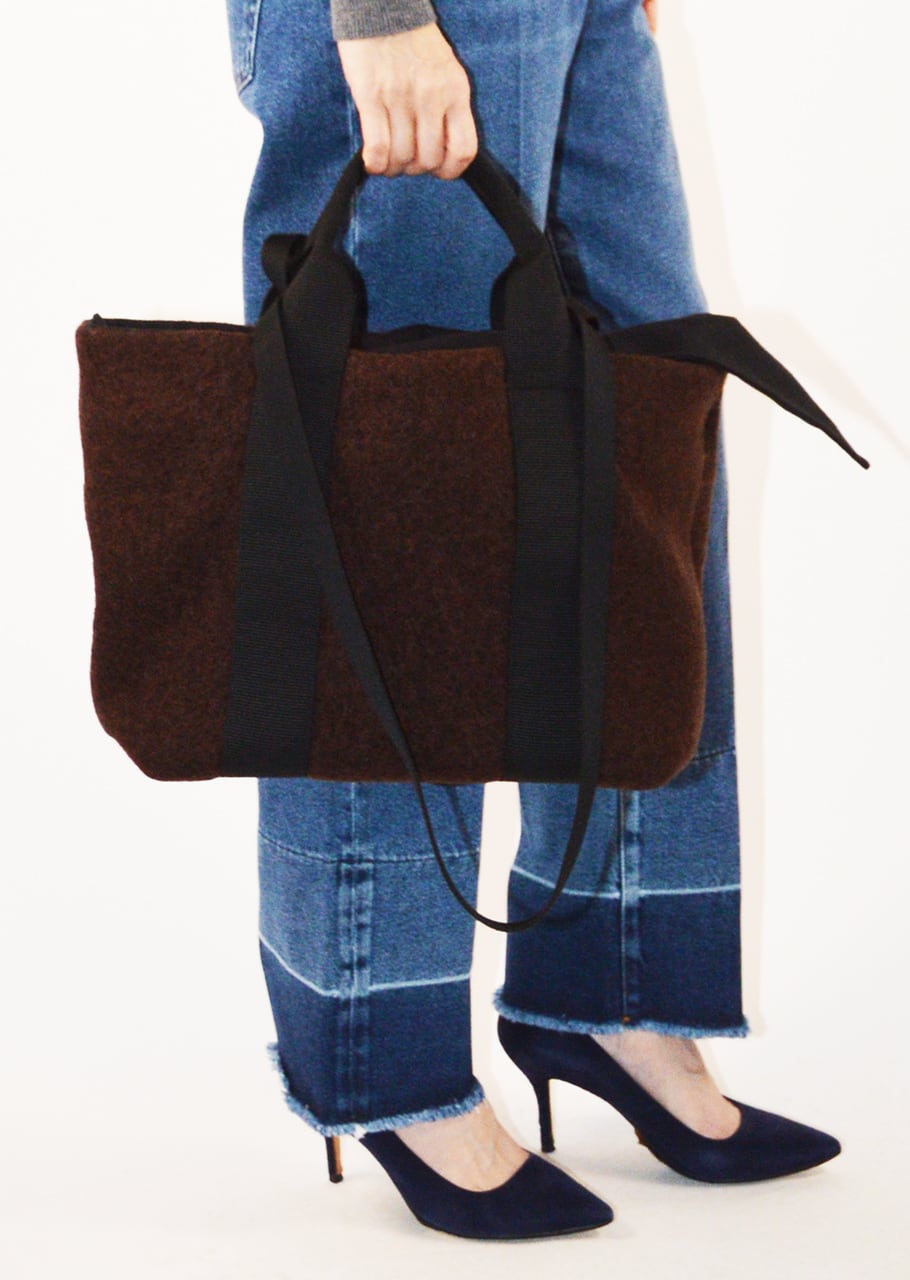 しっかりとしたウール素材なのにとても軽量で持ち運びやすいのが魅力。ウェアの素材に合わせて季節感あるバッグでスタイリングを完成させたい。