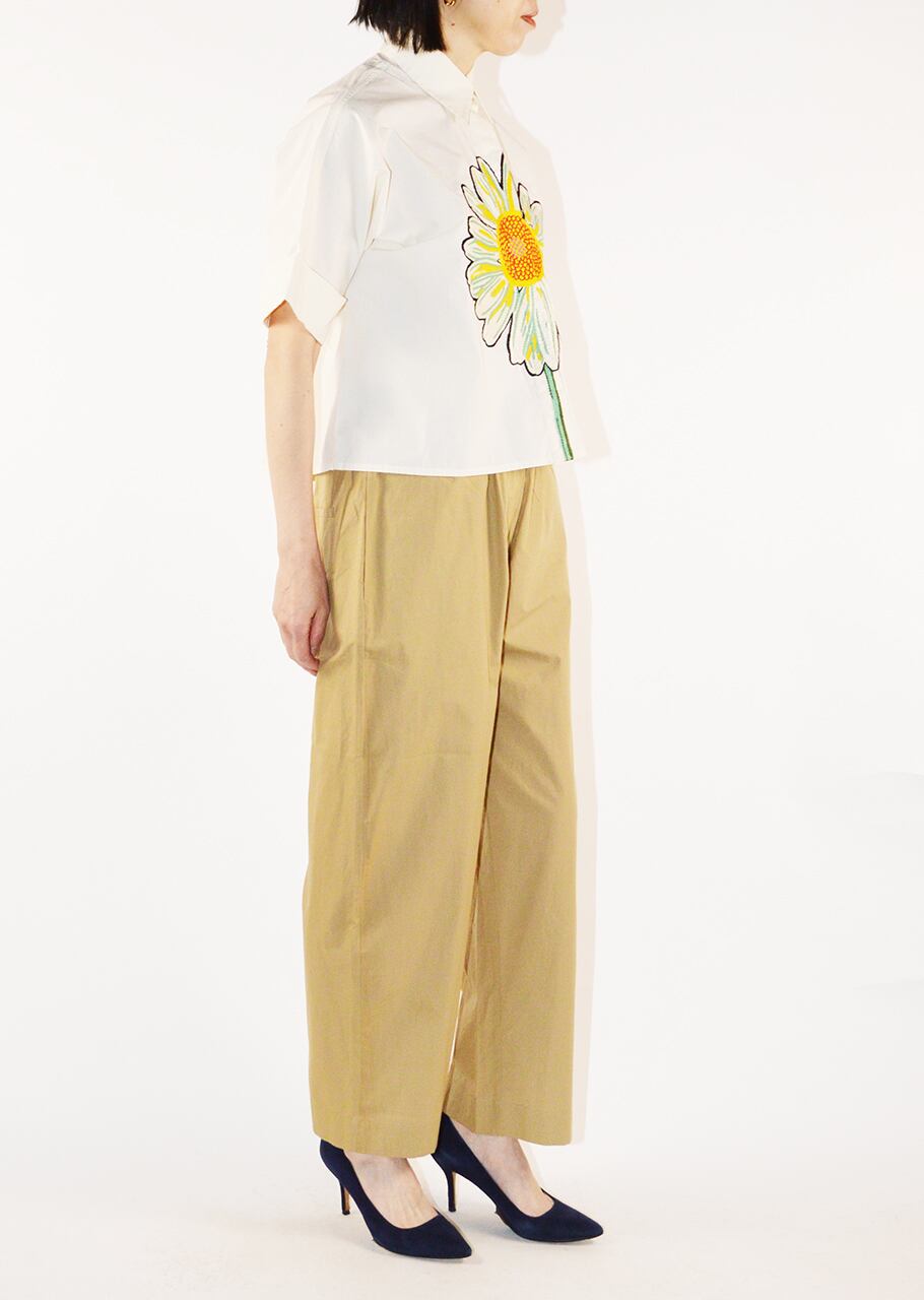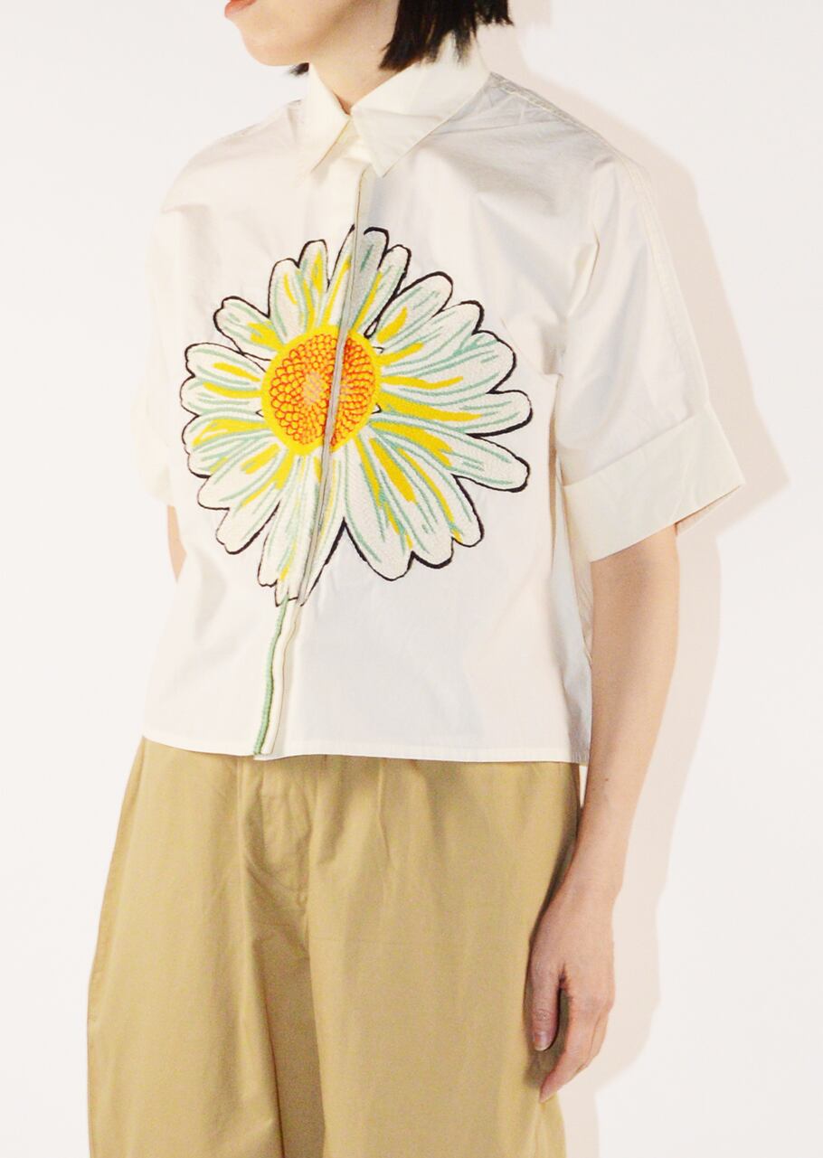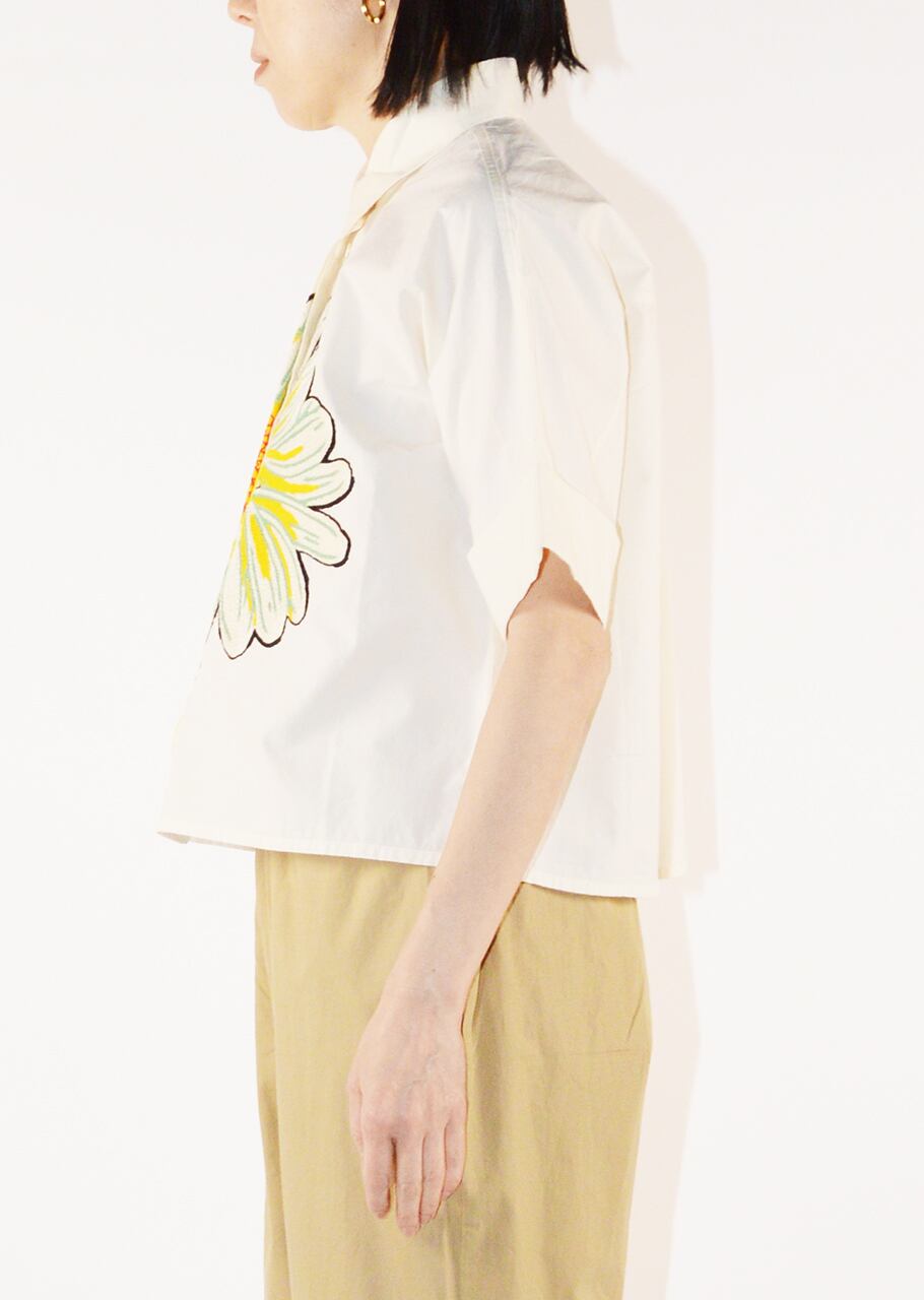コットンポプリン素材を使用したショートスリーブブラウス。比翼仕立てのフロントにあしらわれた大きなフラワーモチーフが印象的でひとつひとつ丁寧に手刺繍されています。MII (ミー)ならではの温かみのあるクラフトワークを楽しめる一着です。