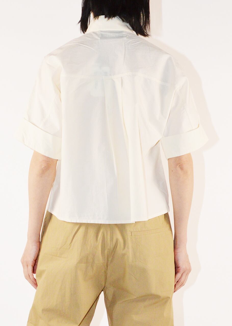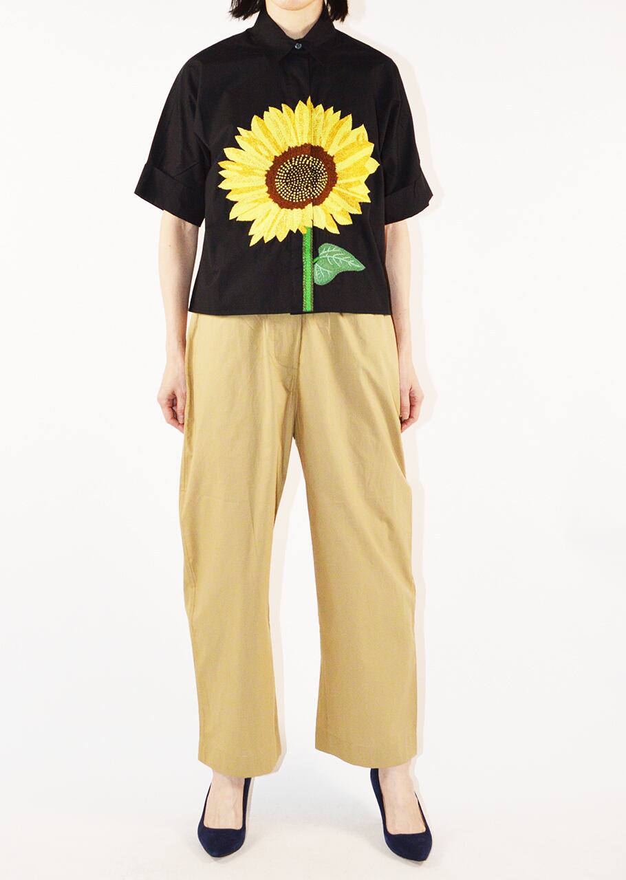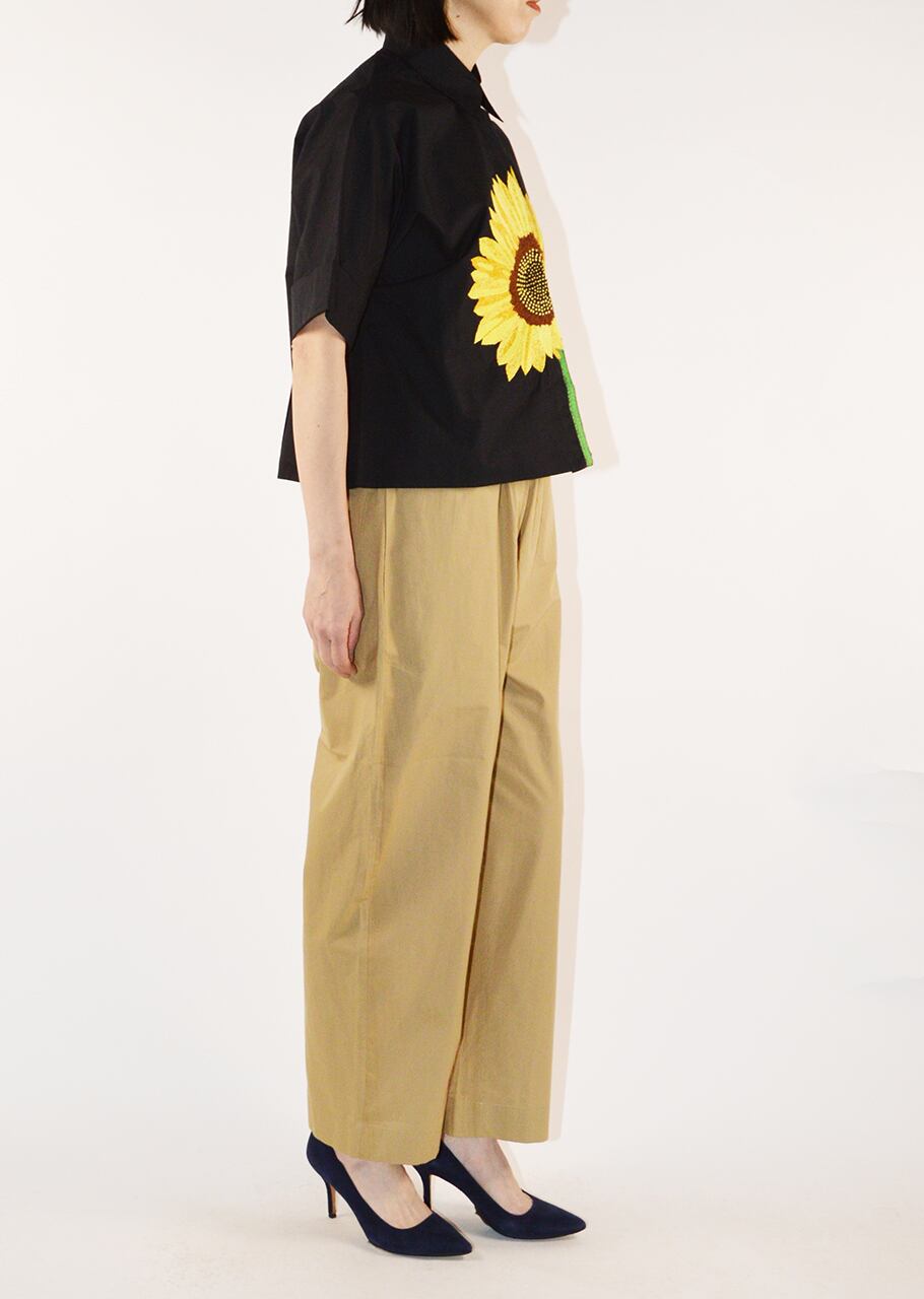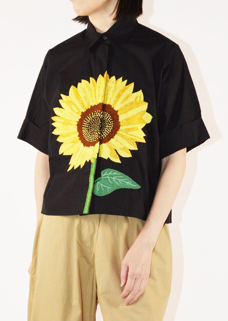 コットンポプリン素材を使用したショートスリーブブラウス。比翼仕立てのフロントにあしらわれた大きなフラワーモチーフが印象的でひとつひとつ丁寧に手刺繍されています。MII (ミー)ならではの温かみのあるクラフトワークを楽しめる一着です。