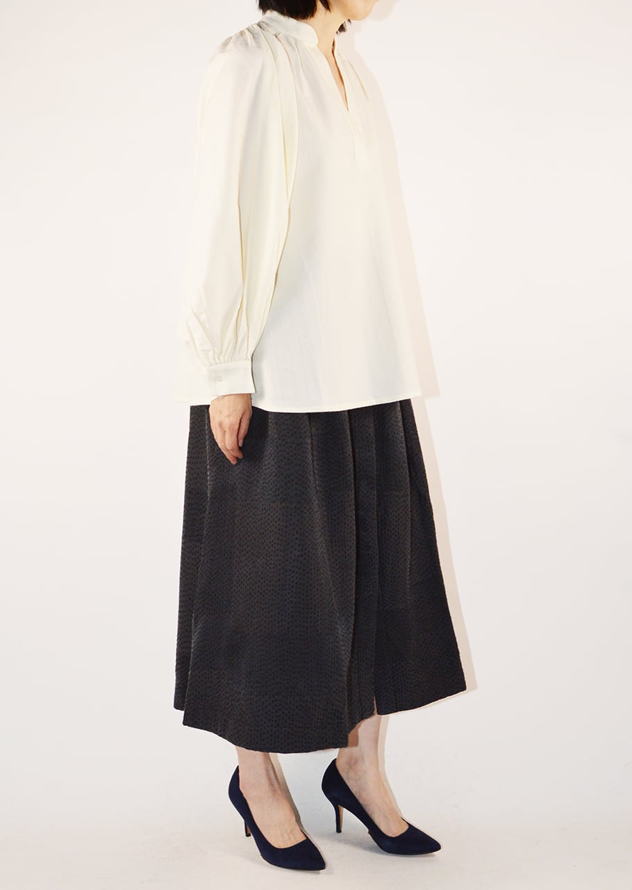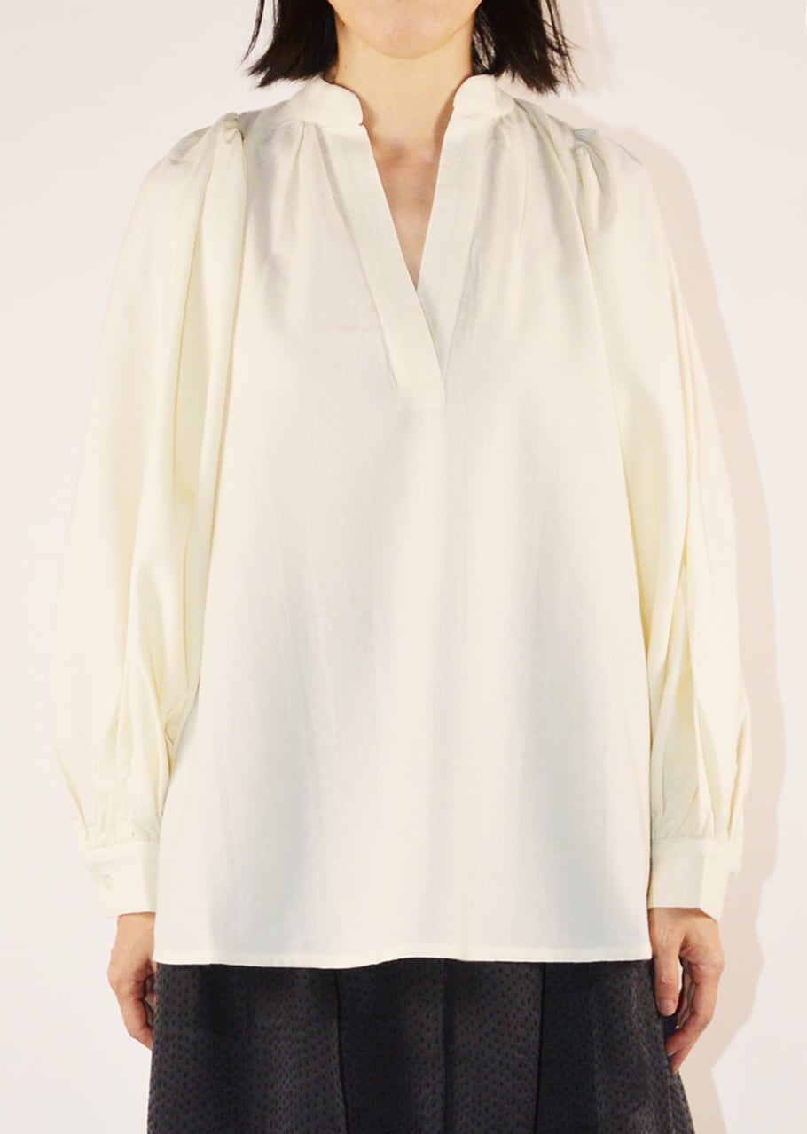 スリットネックのプルオーバーロングスリーブブラウス。肩周りと袖口にたっぷりとあしらわれたギャザーによってうまれるボリュームスリーブのフォルムがとても華やかな印象。ウール100%の素材となっているので一枚でもウォーム感ある着こなしが可能です。秋冬でもシャツを着こなしたい気分を満たしてくれるアイテムです。
