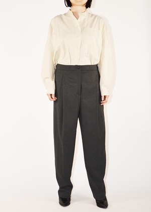 腰回りにタック入りでゆとりのあるシルエット。肉感がありながらも落ち感があり、すっきり見えるパンツです。伸縮性があり、なめらかな表面感のポンチ素材を使用。カジュアルにはもちろん、ジャケットを合わせてお仕事スタイルにもおすすめです。