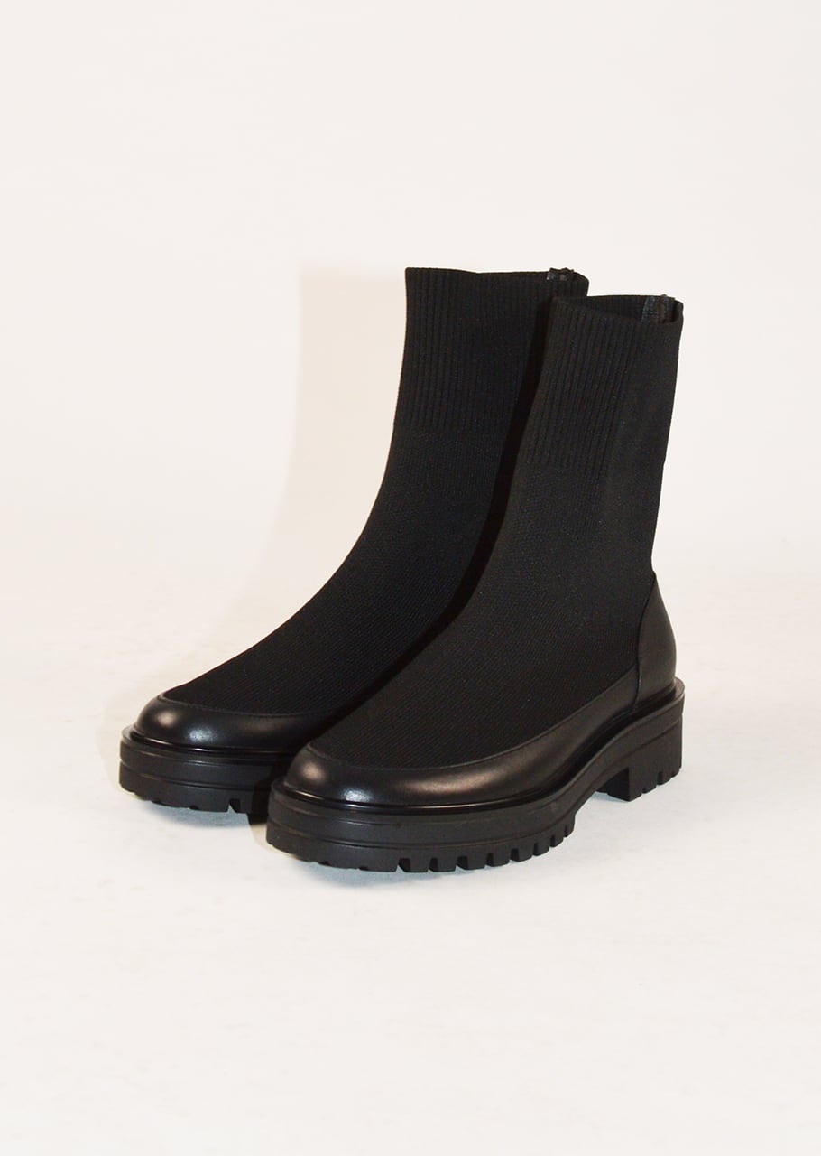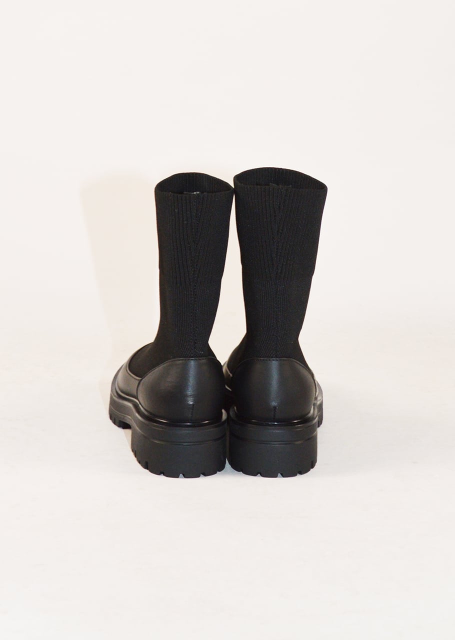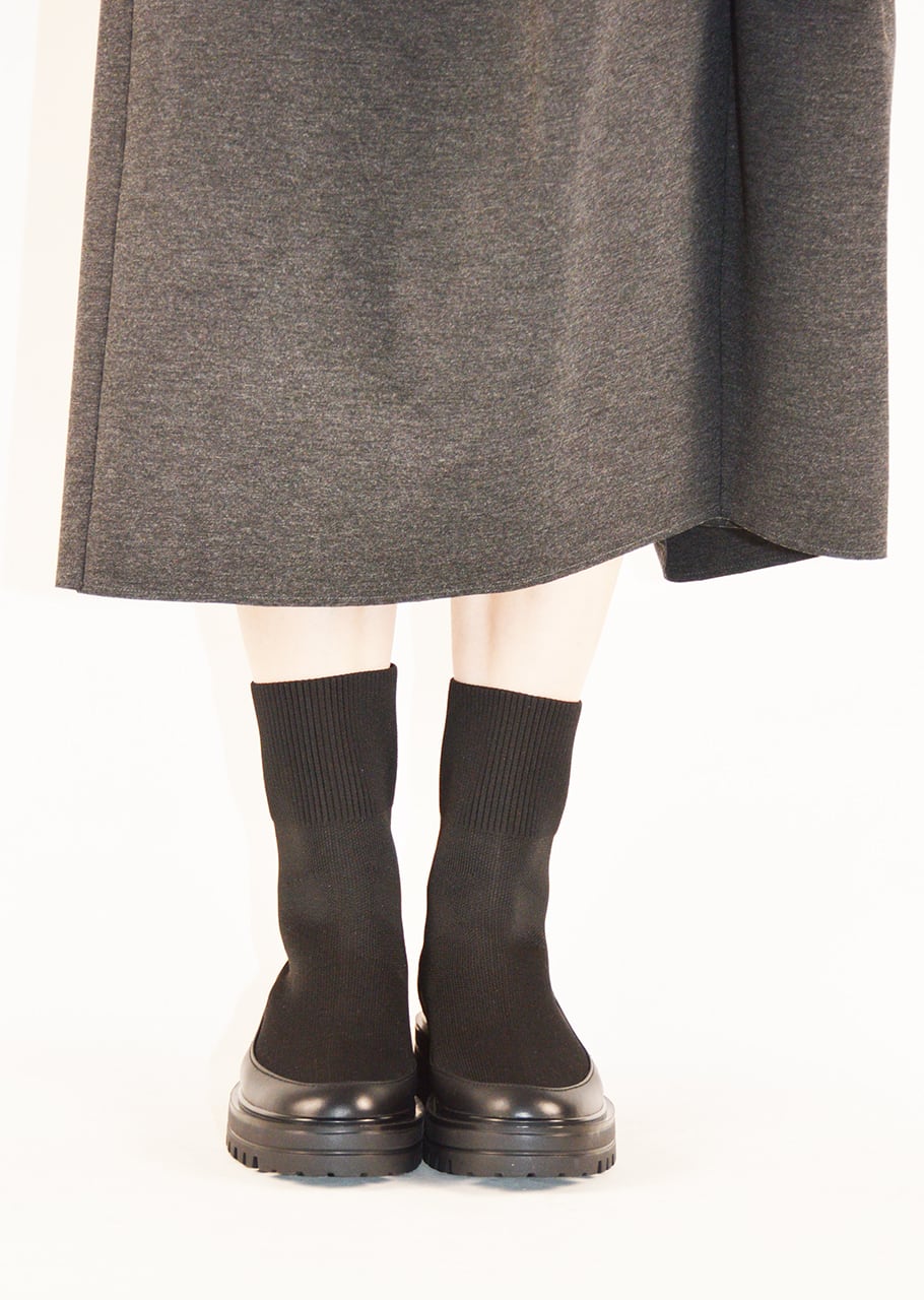 レザーとニットのコンビネーション素材のショートブーツ。ニット素材が足元にフィットし、きれいなすっきりとしたラインを見せて着こなすことができるデザイン。ブーツをみせてはけるスカートからパンツまで、幅広いボトムで楽しめるデザインです。