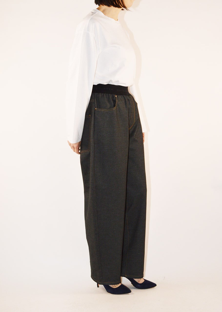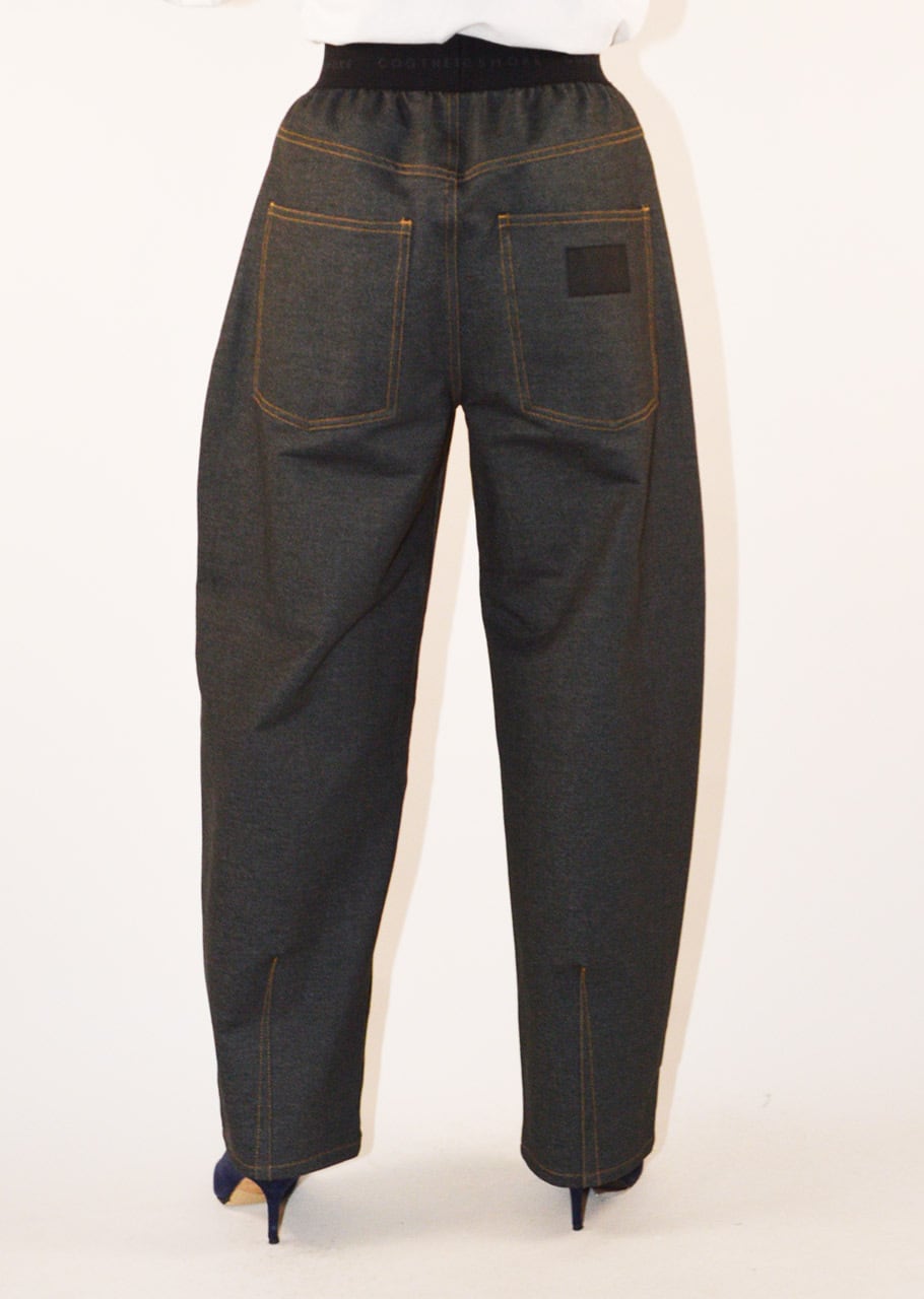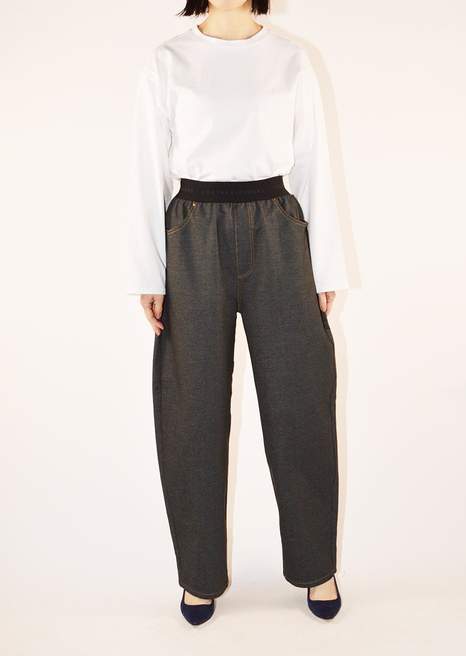 デニムのステッチやリベット、ヨークやポケットのディテールを再現したバレルシルエットのパンツ。とても軽くて全方向に伸びるストレッチを備えたコットンブレンドのジャージ素材。素材や着心地は快適に、ウエストはゴムの仕様でリラックスしたフィット感に仕上げています。裾脇の緩やかなカーブと、後ろ裾に入れた深めのダーツが立体感のある丸みを帯びたシルエットを生み出しています。