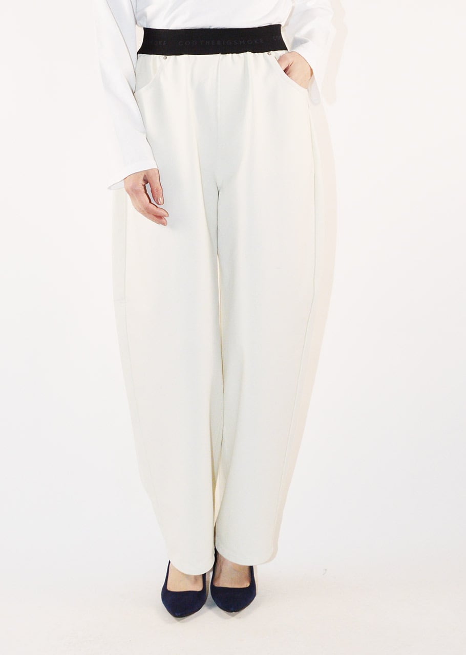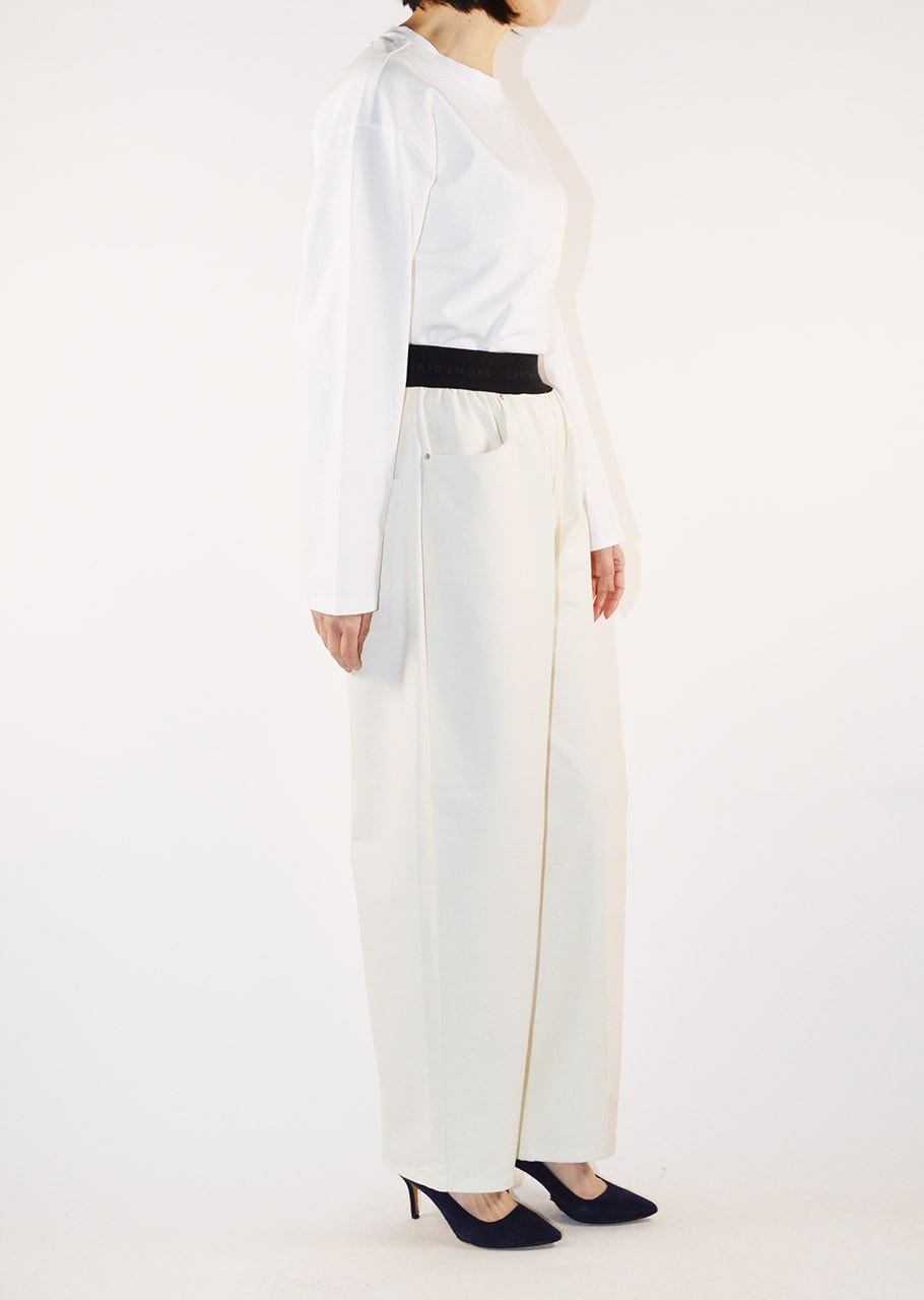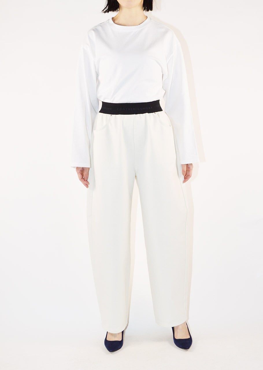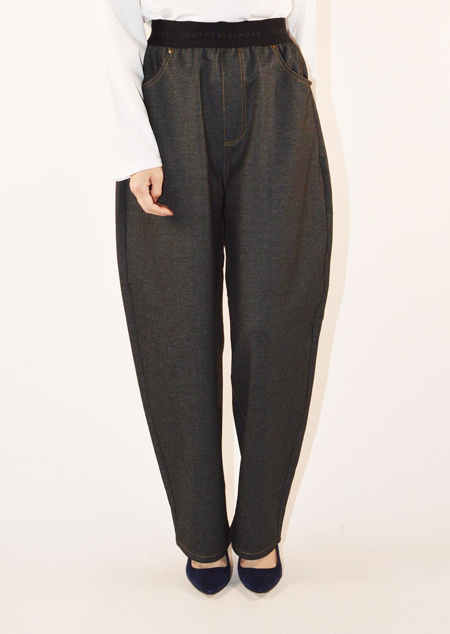 デニムのステッチやリベット、ヨークやポケットのディテールを再現したバレルシルエットのパンツ。とても軽くて全方向に伸びるストレッチを備えたコットンブレンドのジャージ素材。素材や着心地は快適に、ウエストはゴムの仕様でリラックスしたフィット感に仕上げています。裾脇の緩やかなカーブと、後ろ裾に入れた深めのダーツが立体感のある丸みを帯びたシルエットを生み出しています。