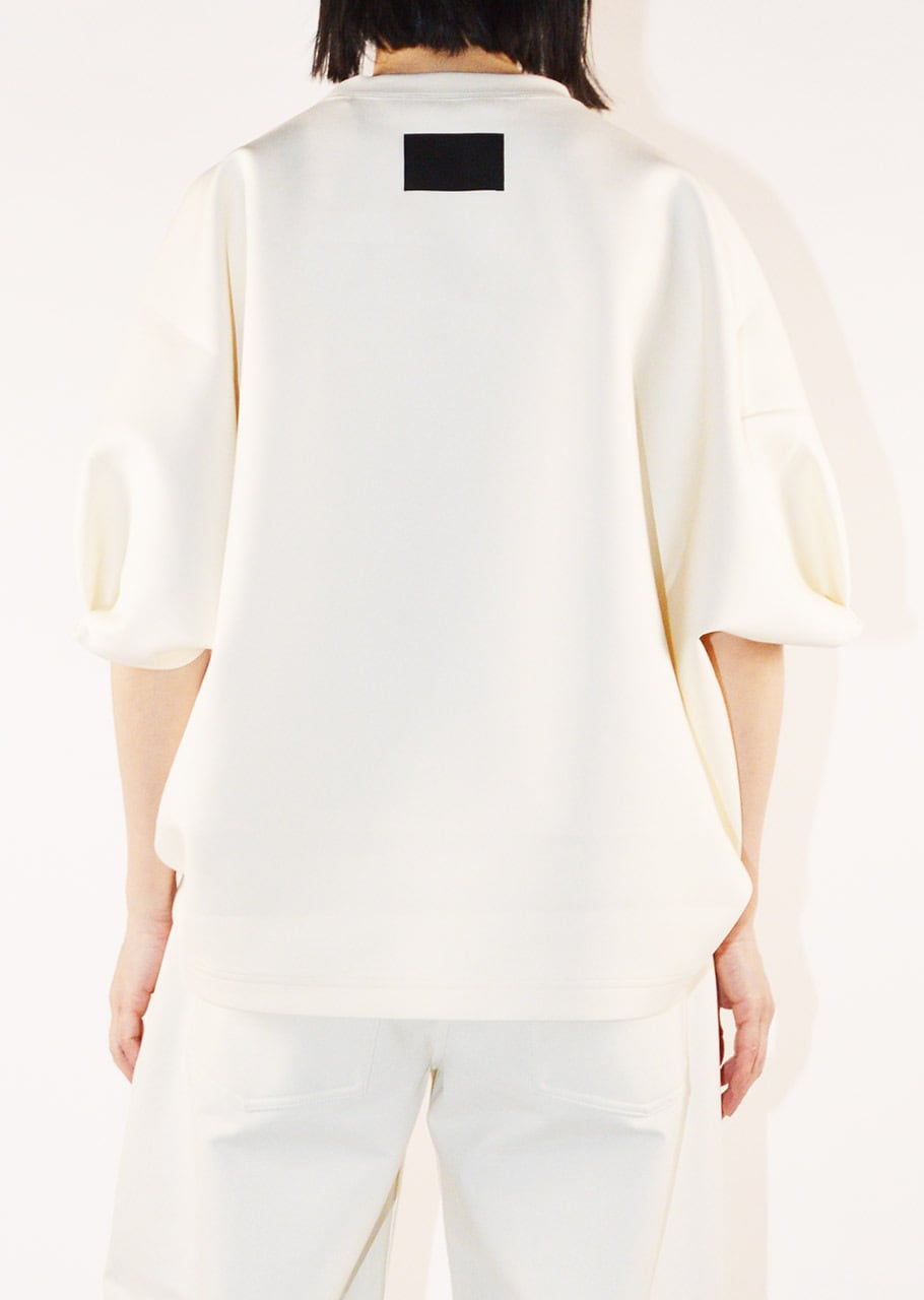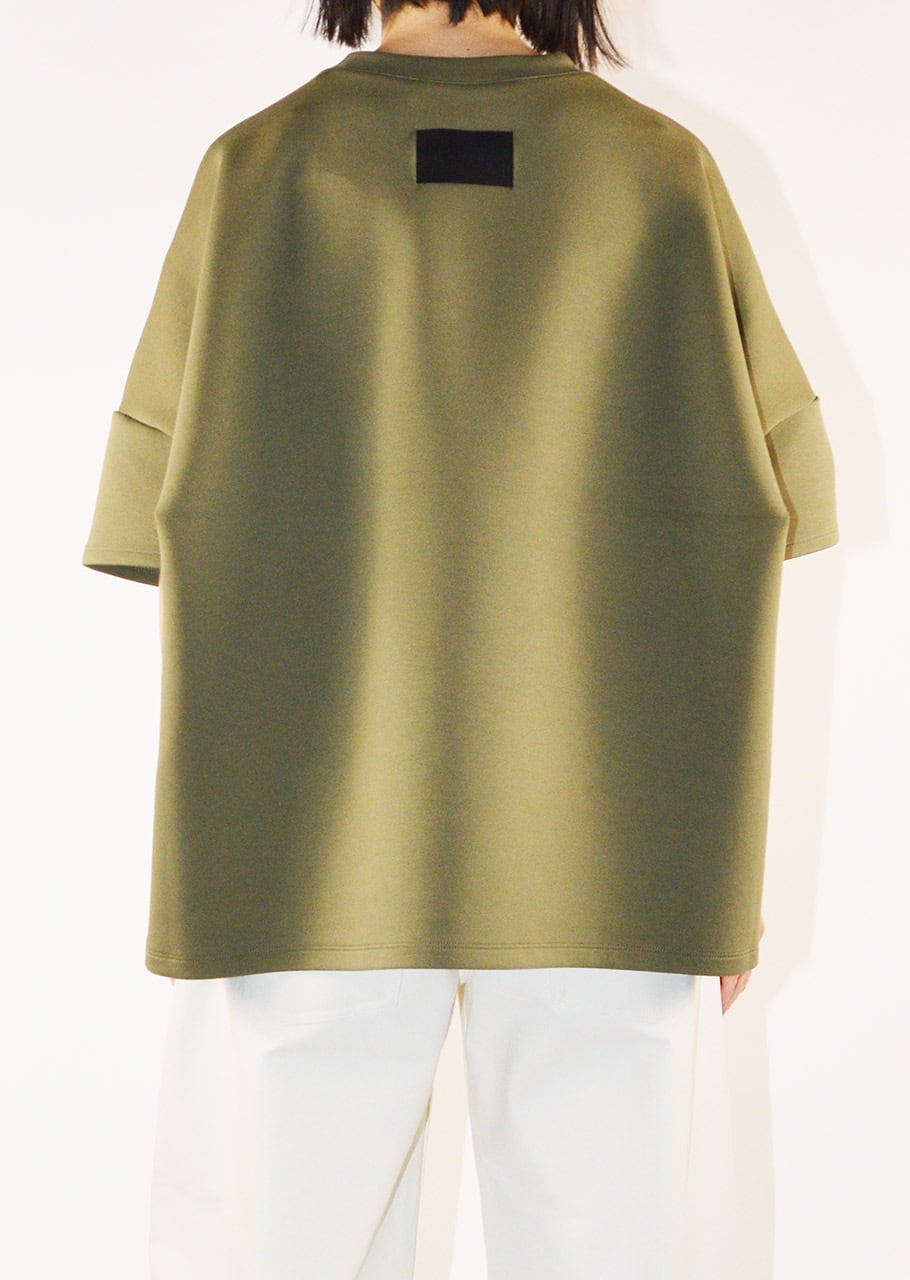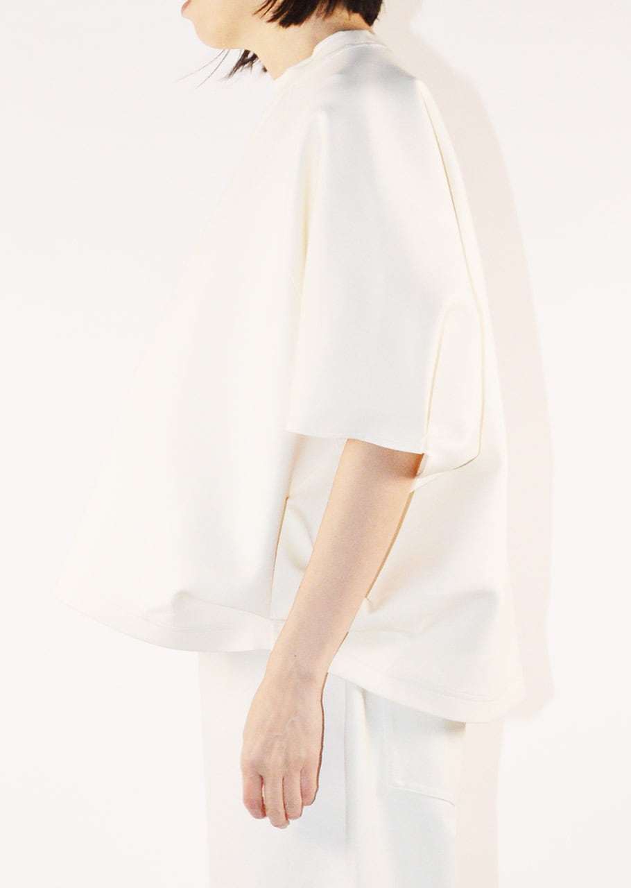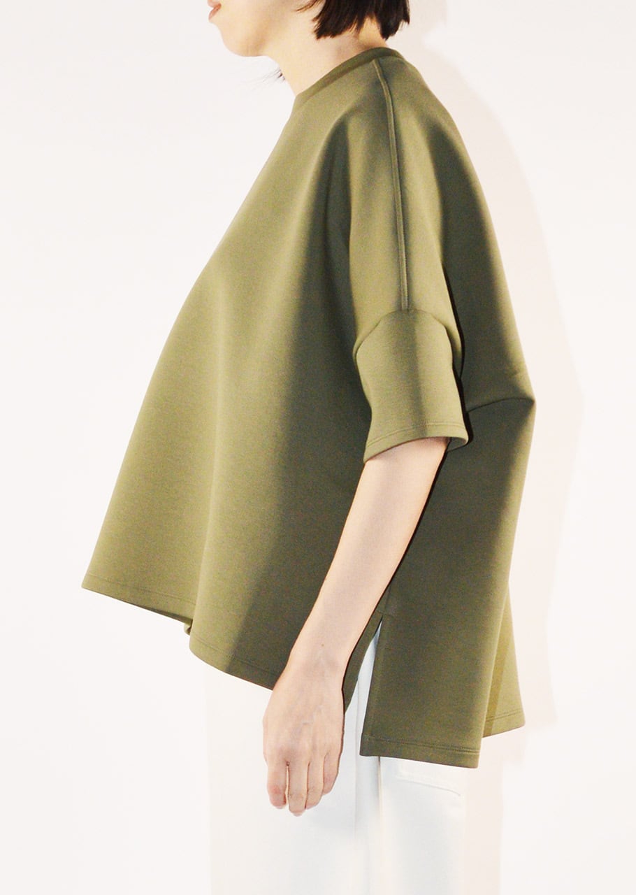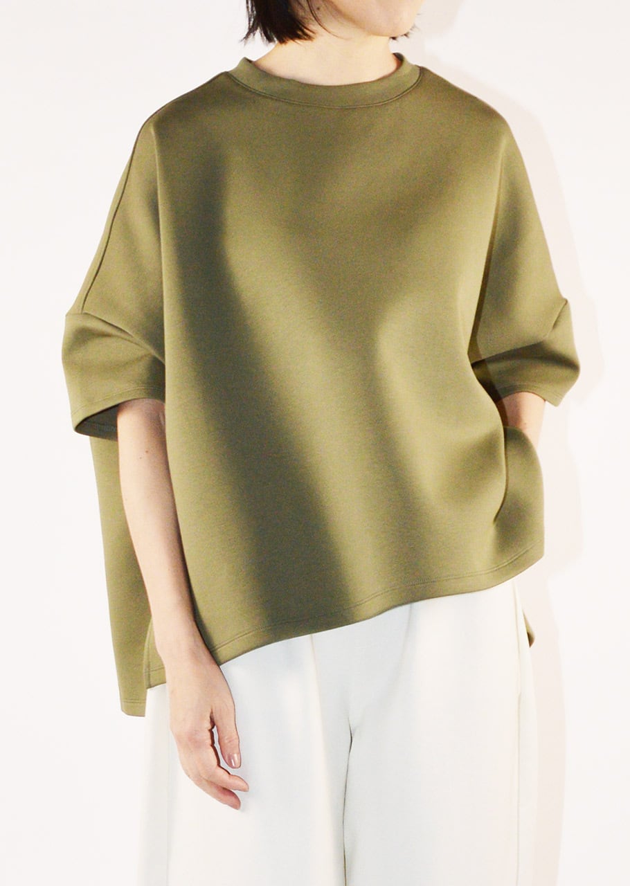 クルーネックのハーフスリーブカットソー。ワイドなボディとあえてすっきりさせた袖のデザインがユニークなバランスを生み出しています。アームホールのタックが後ろ身頃にふわりとした膨らみをもたらしさりげない立体感をプラス。裾はカーブを描いた後ろが長めのデザインで、自然な動きと抜け感を添えています。