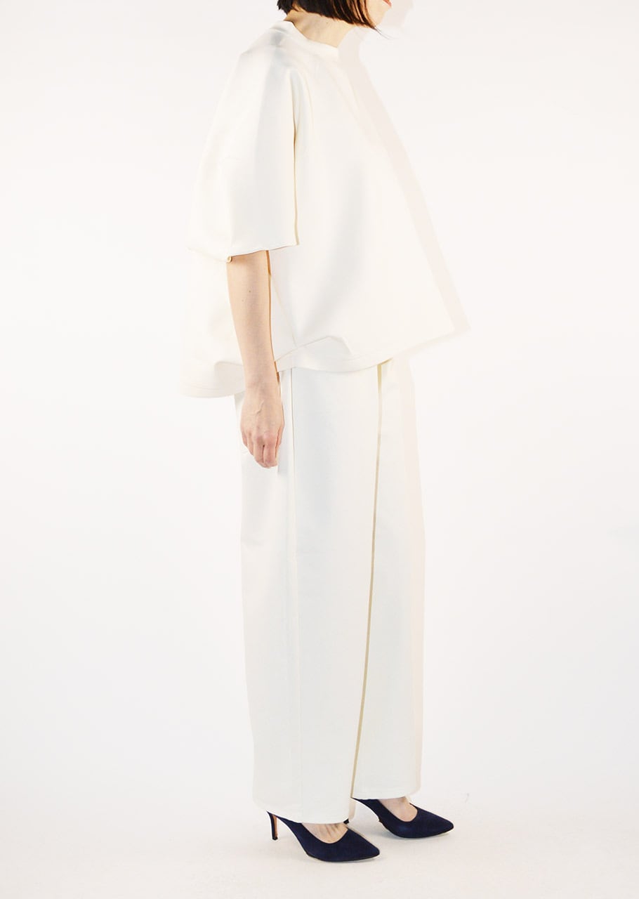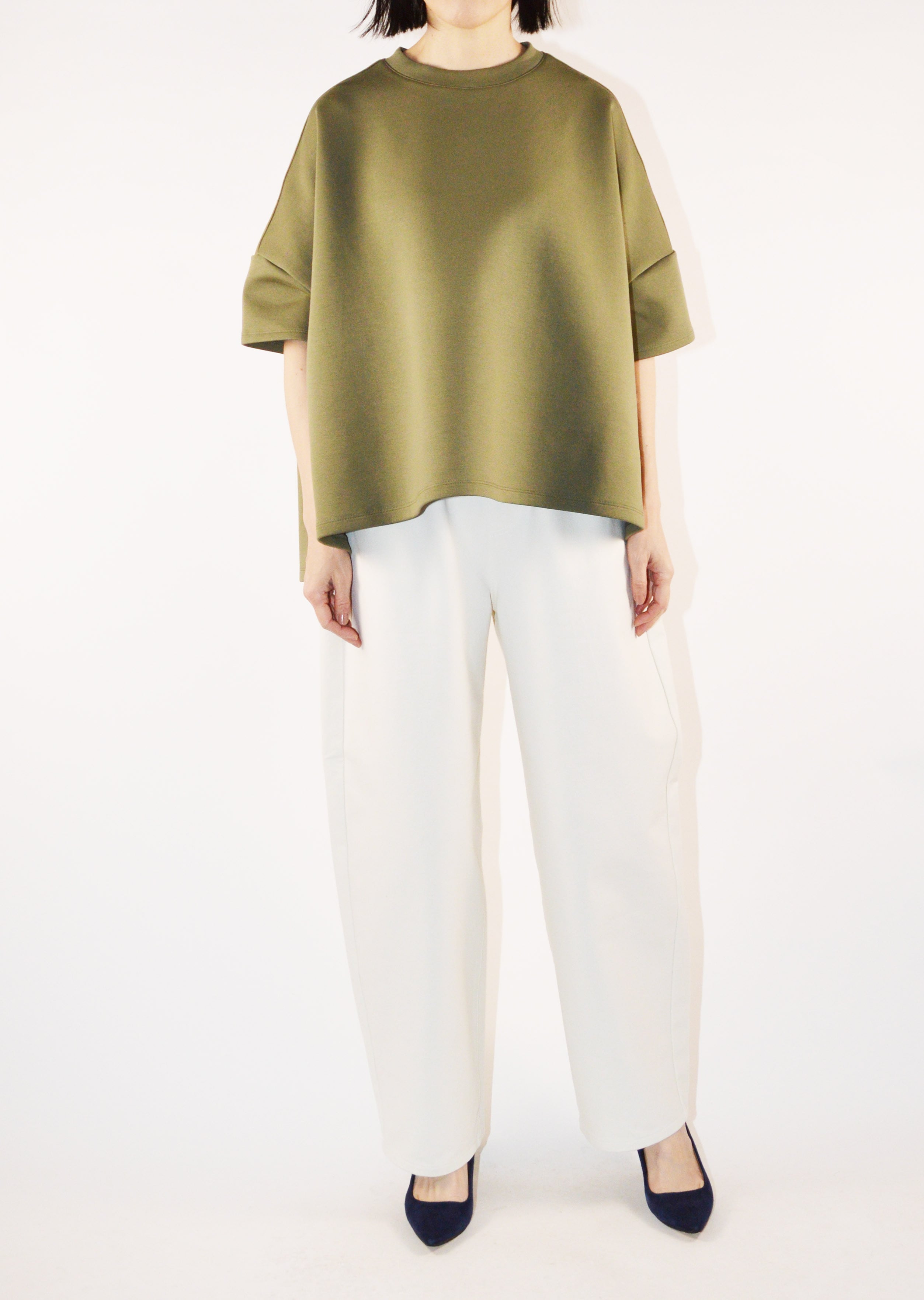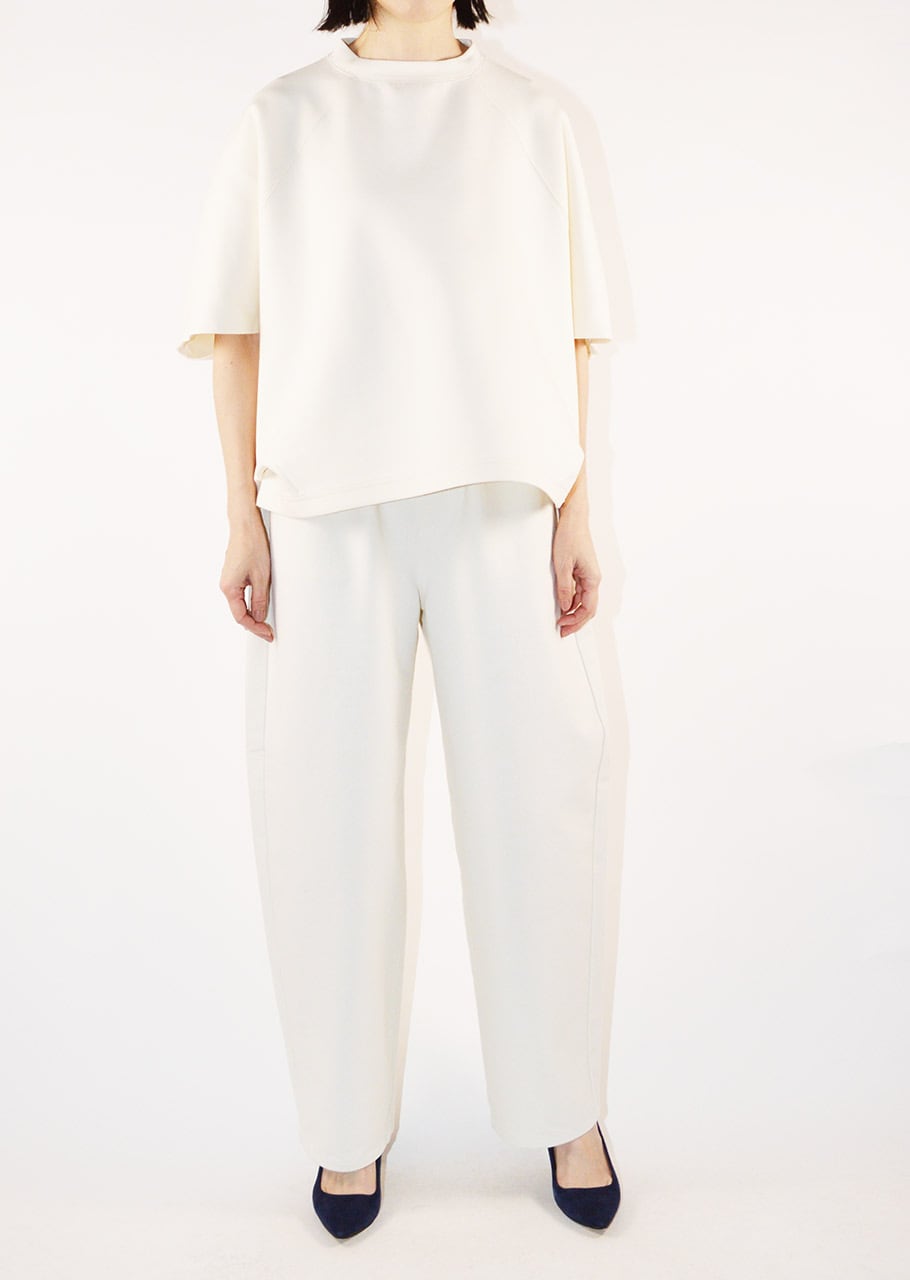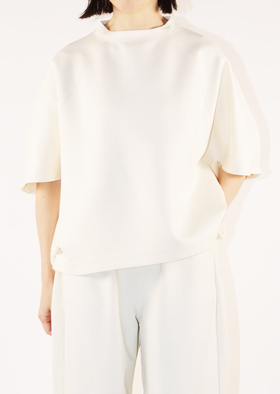 クルーネックのハーフスリーブカットソー。ワイドなボディとあえてすっきりさせた袖のデザインがユニークなバランスを生み出しています。アームホールのタックが後ろ身頃にふわりとした膨らみをもたらしさりげない立体感をプラス。裾はカーブを描いた後ろが長めのデザインで、自然な動きと抜け感を添えています。