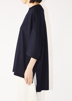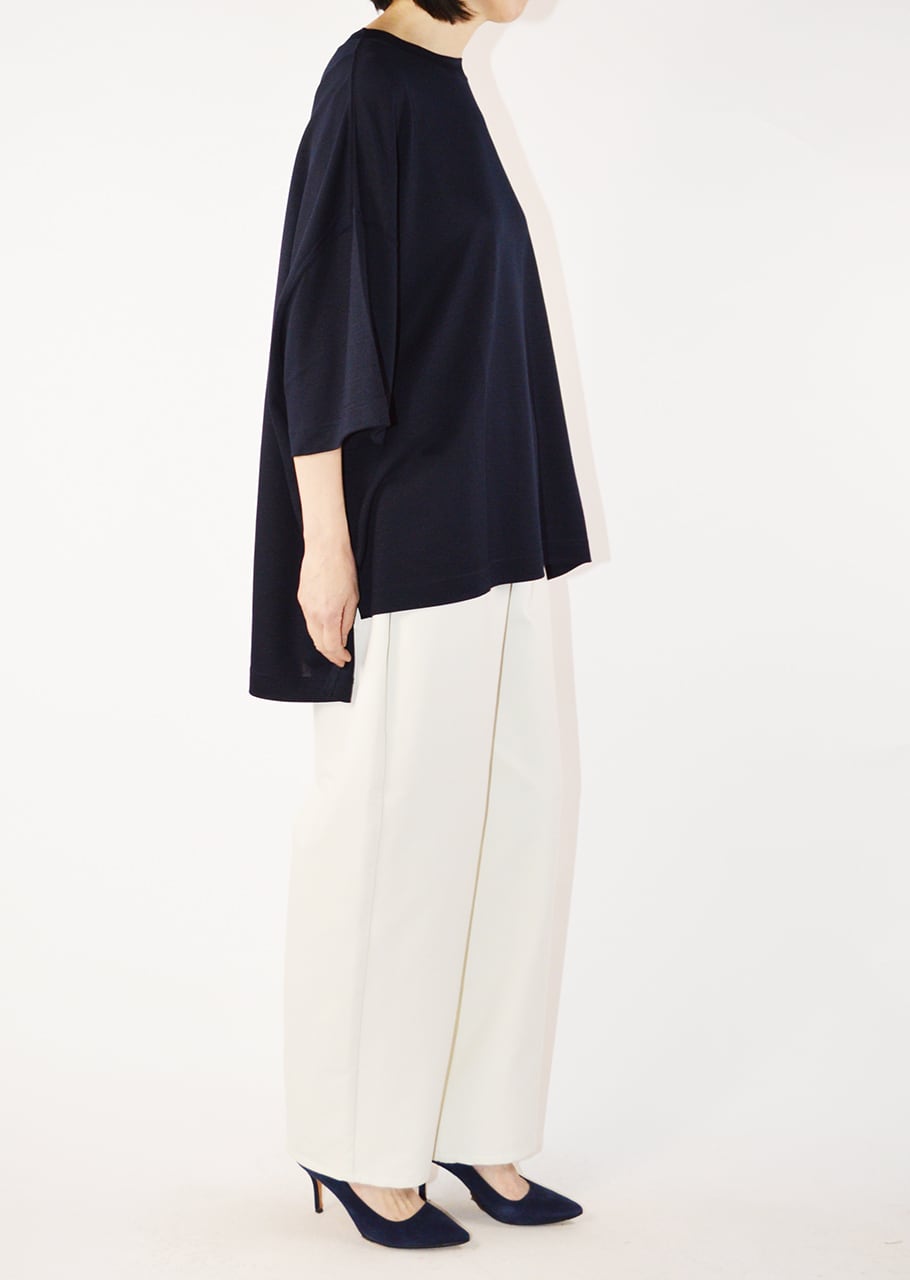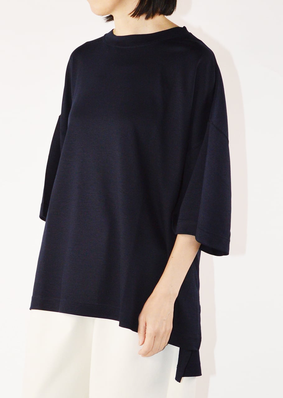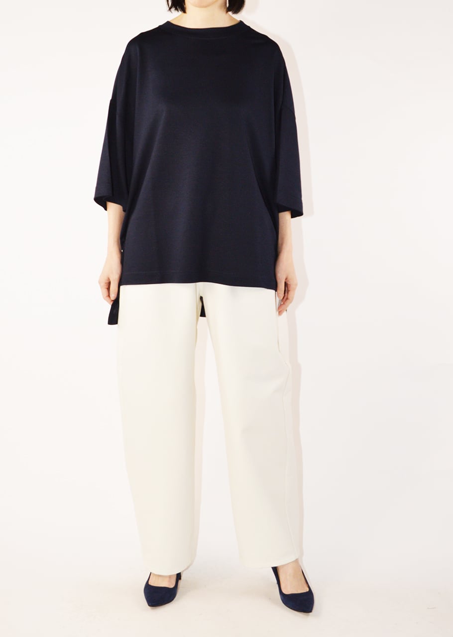 クルーネックのオーバーサイズTシャツ。たっぷりとした身幅で、着用時には身体が華奢に見えるバランスが魅力。前後差のある裾と、深めに入った脇スリットがシルエットに軽さと動きを加えます。一枚でスタイリングが決まる優秀なアイテムです。