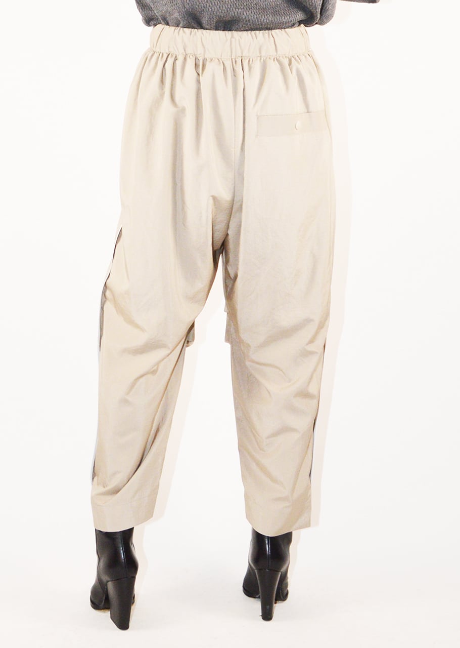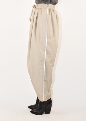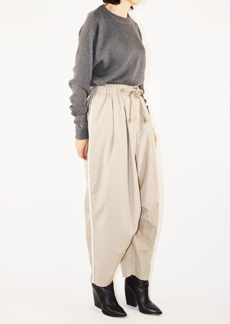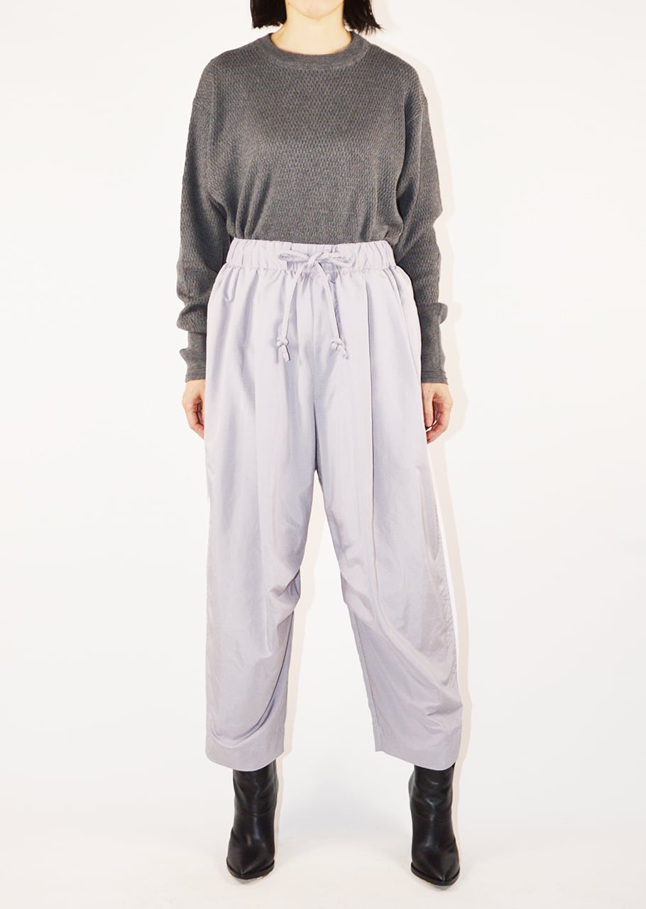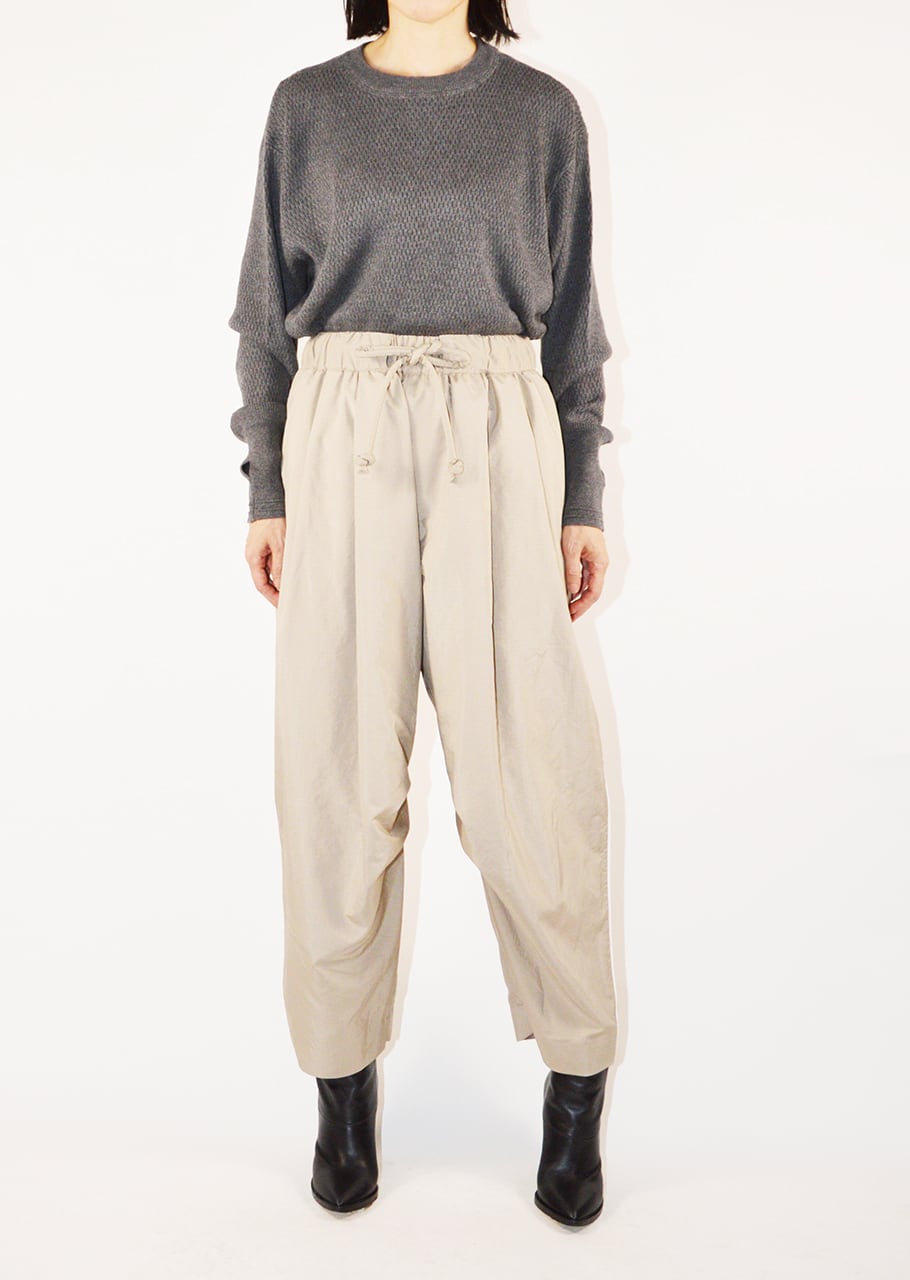 リサイクルポリエステル100%のファブリックを用いたイージーパンツです。格子状に繊維が織り込まれた強度のある素材としてアウトドア用品に使用される事の多い素材で、ウエスト部分にタックを施し、膝下から足首にかけ細くなるテーパードシルエット。ゆとりがあり動きやすいのはもちろん、立体的なパターン構造により正面から見た時には脚全体が細く見えるシルエット。ウエストの太いコードと両サイドのパイピングがアクセントとなっています。