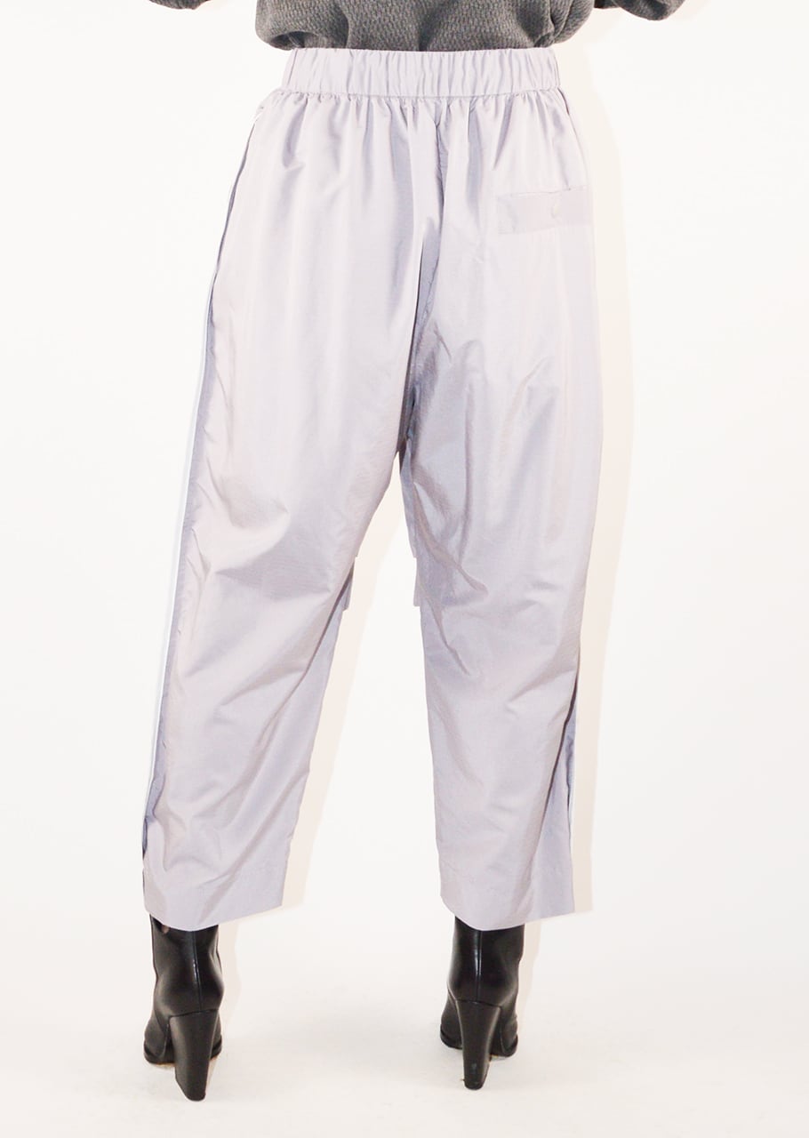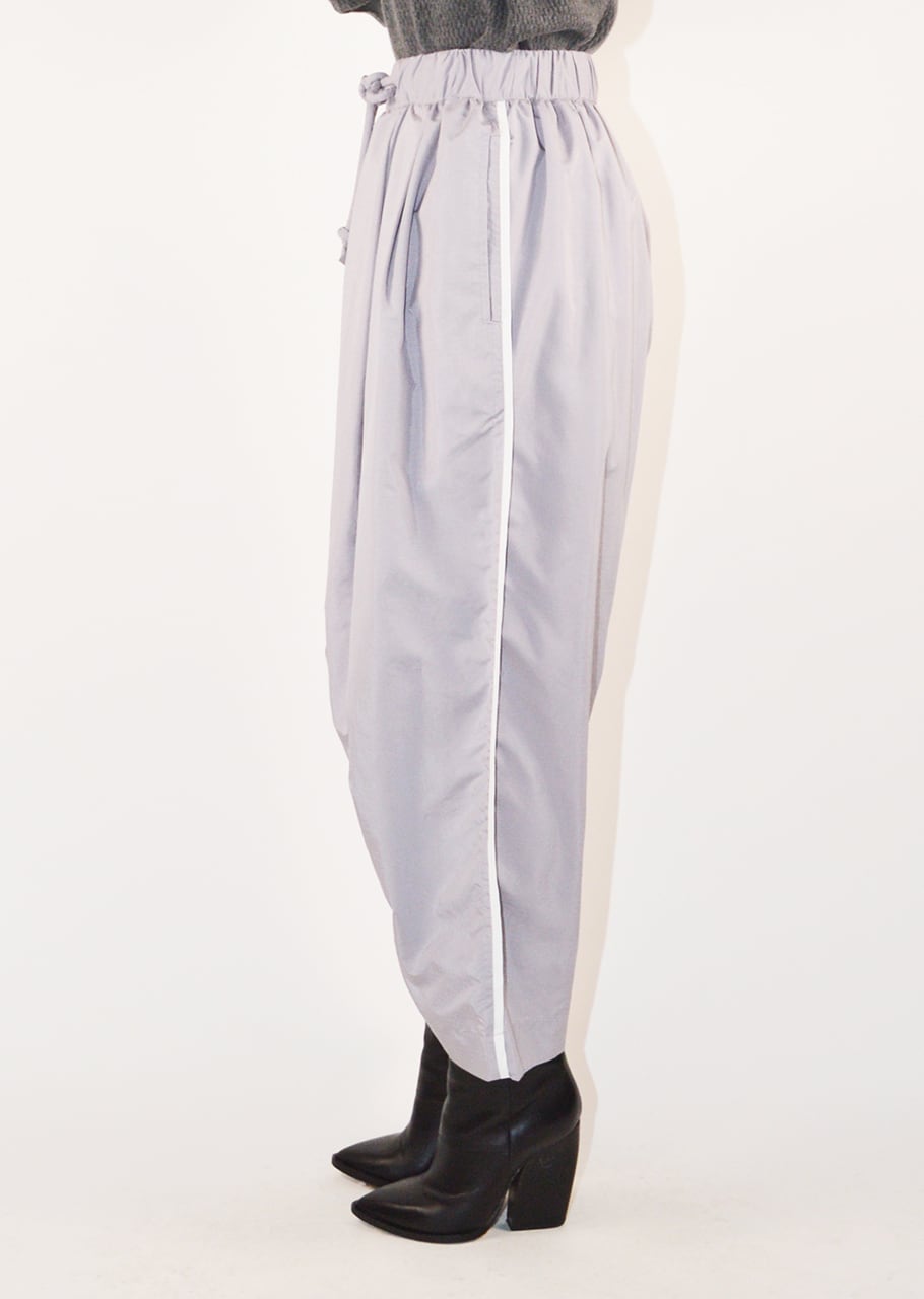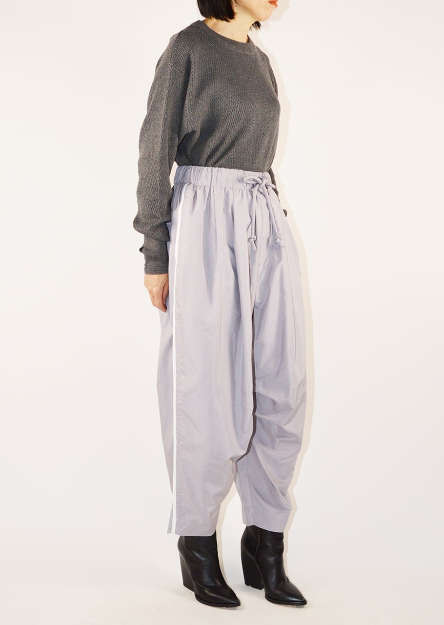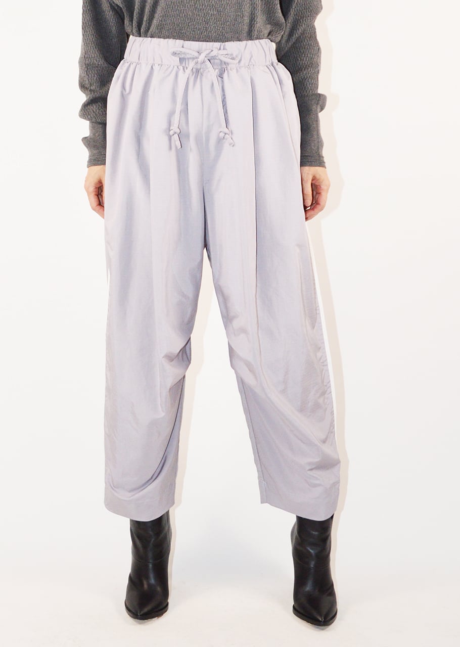 リサイクルポリエステル100%のファブリックを用いたイージーパンツです。格子状に繊維が織り込まれた強度のある素材としてアウトドア用品に使用される事の多い素材で、ウエスト部分にタックを施し、膝下から足首にかけ細くなるテーパードシルエット。ゆとりがあり動きやすいのはもちろん、立体的なパターン構造により正面から見た時には脚全体が細く見えるシルエット。ウエストの太いコードと両サイドのパイピングがアクセントとなっています。