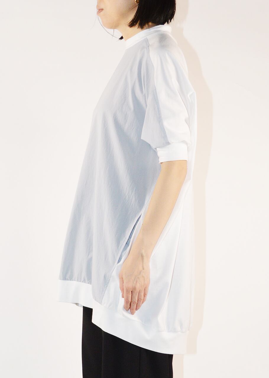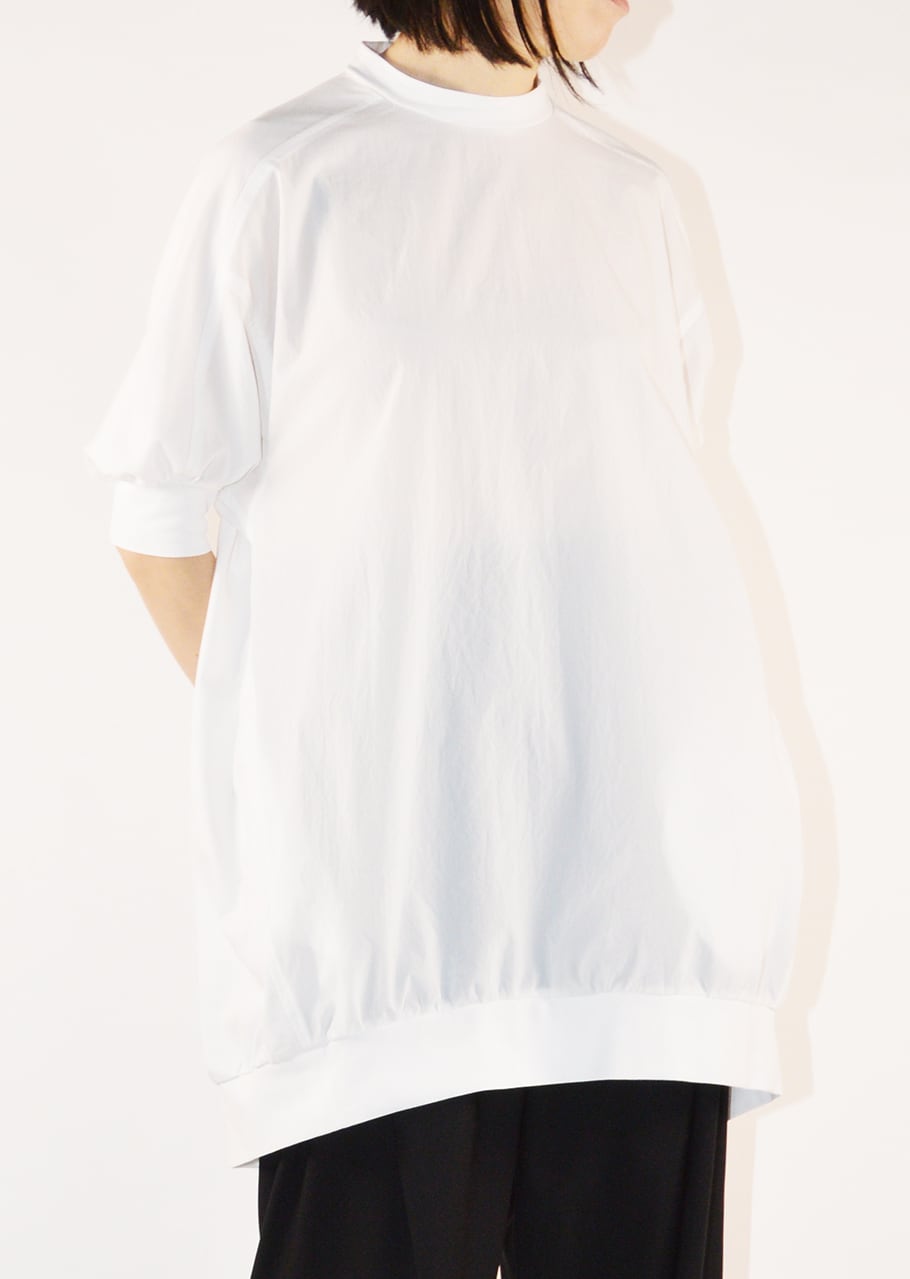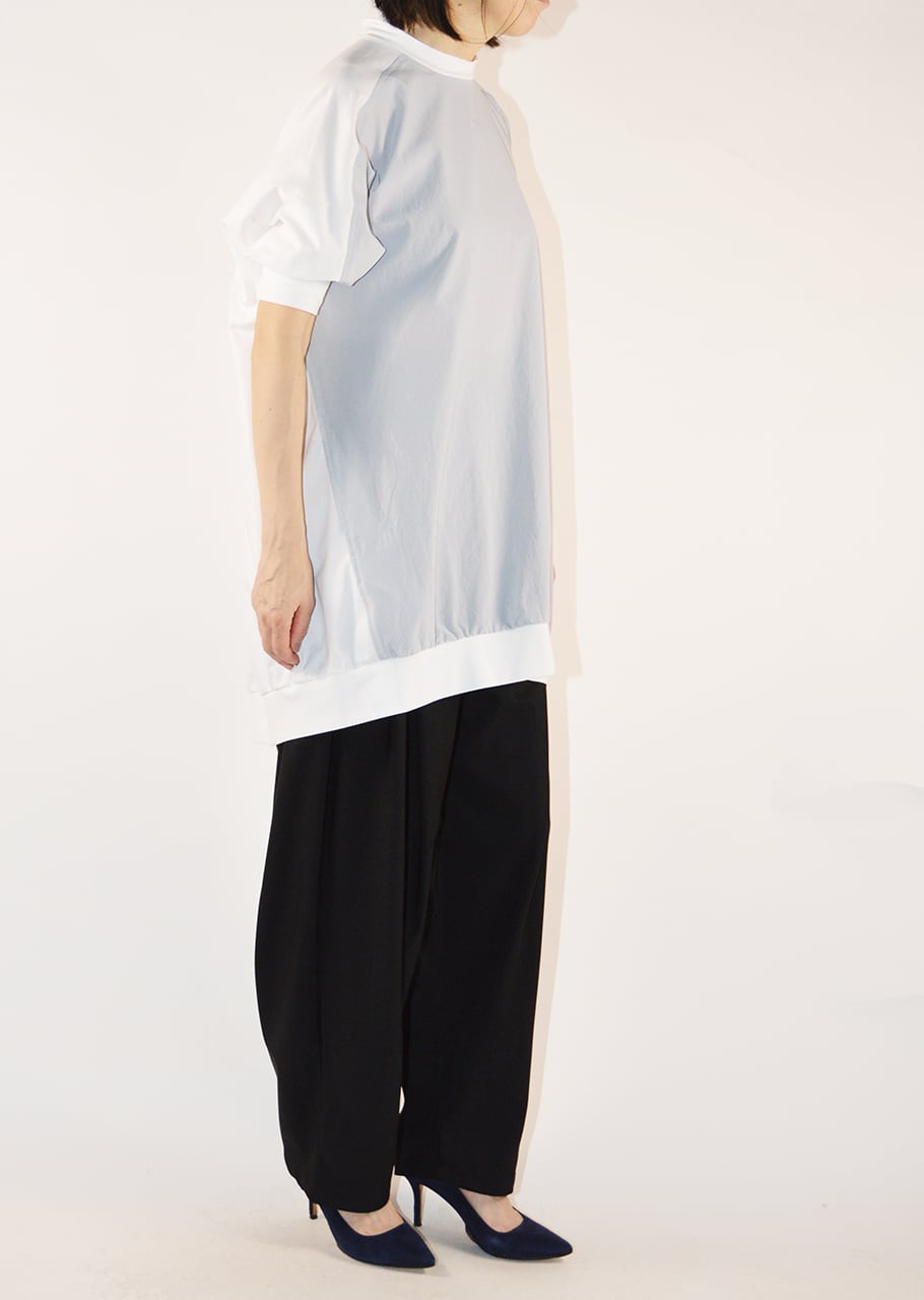 ゆったりとしたリラックスシルエットのライトウェイトなスウェットシャツ。前身頃は布帛、後身頃はジャージーという、シンプルながらユニークなデザインです。さらりとした着心地で大変着心地が良く、これ一枚で着るのはもちろん、インナーとしても存在感を発揮します。