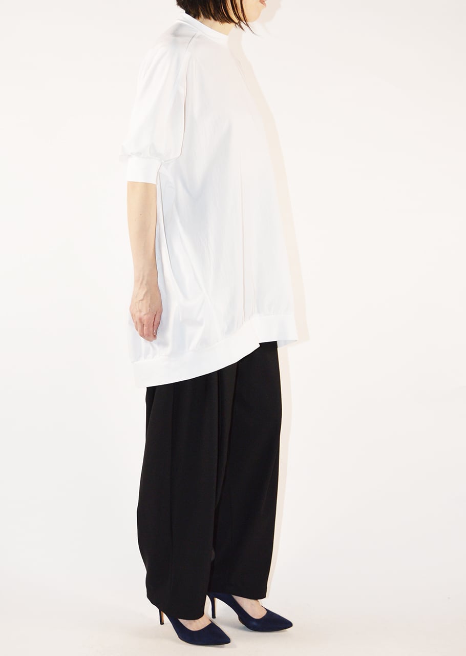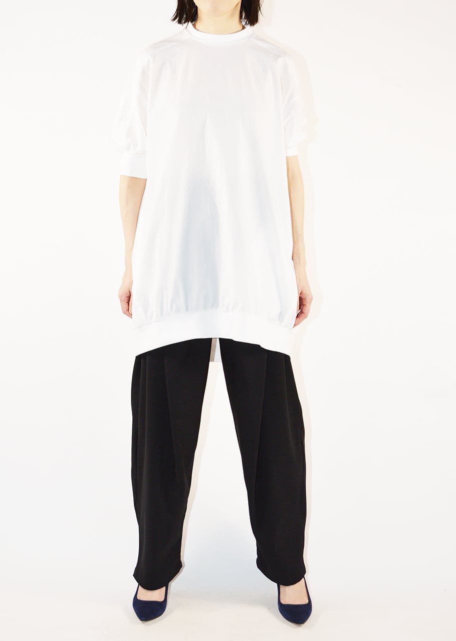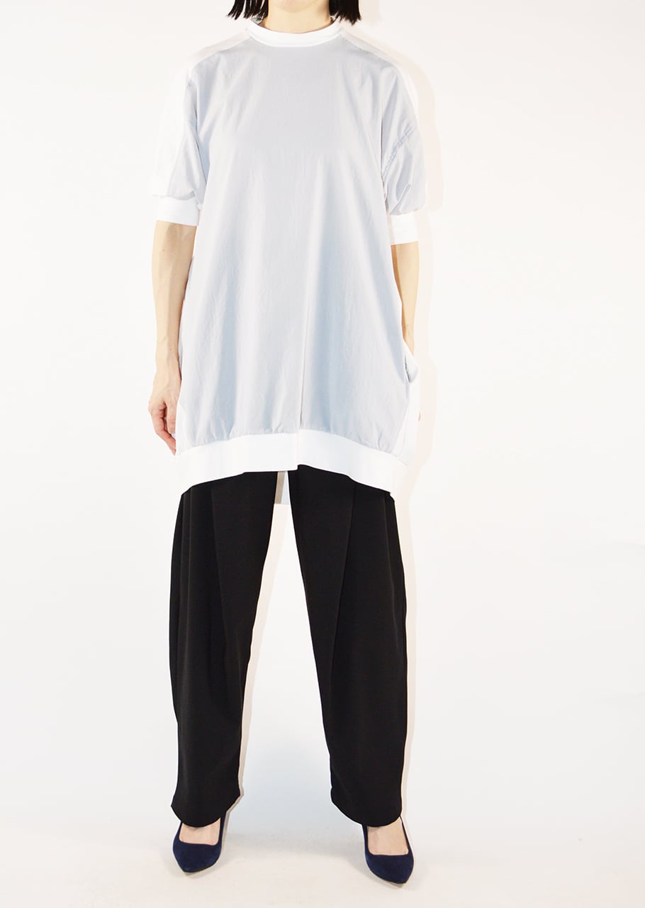 ゆったりとしたリラックスシルエットのライトウェイトなスウェットシャツ。前身頃は布帛、後身頃はジャージーという、シンプルながらユニークなデザインです。さらりとした着心地で大変着心地が良く、これ一枚で着るのはもちろん、インナーとしても存在感を発揮します。