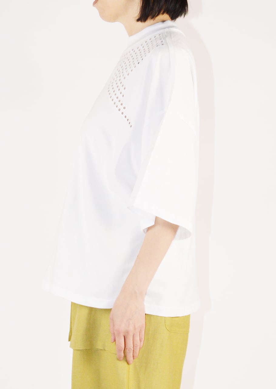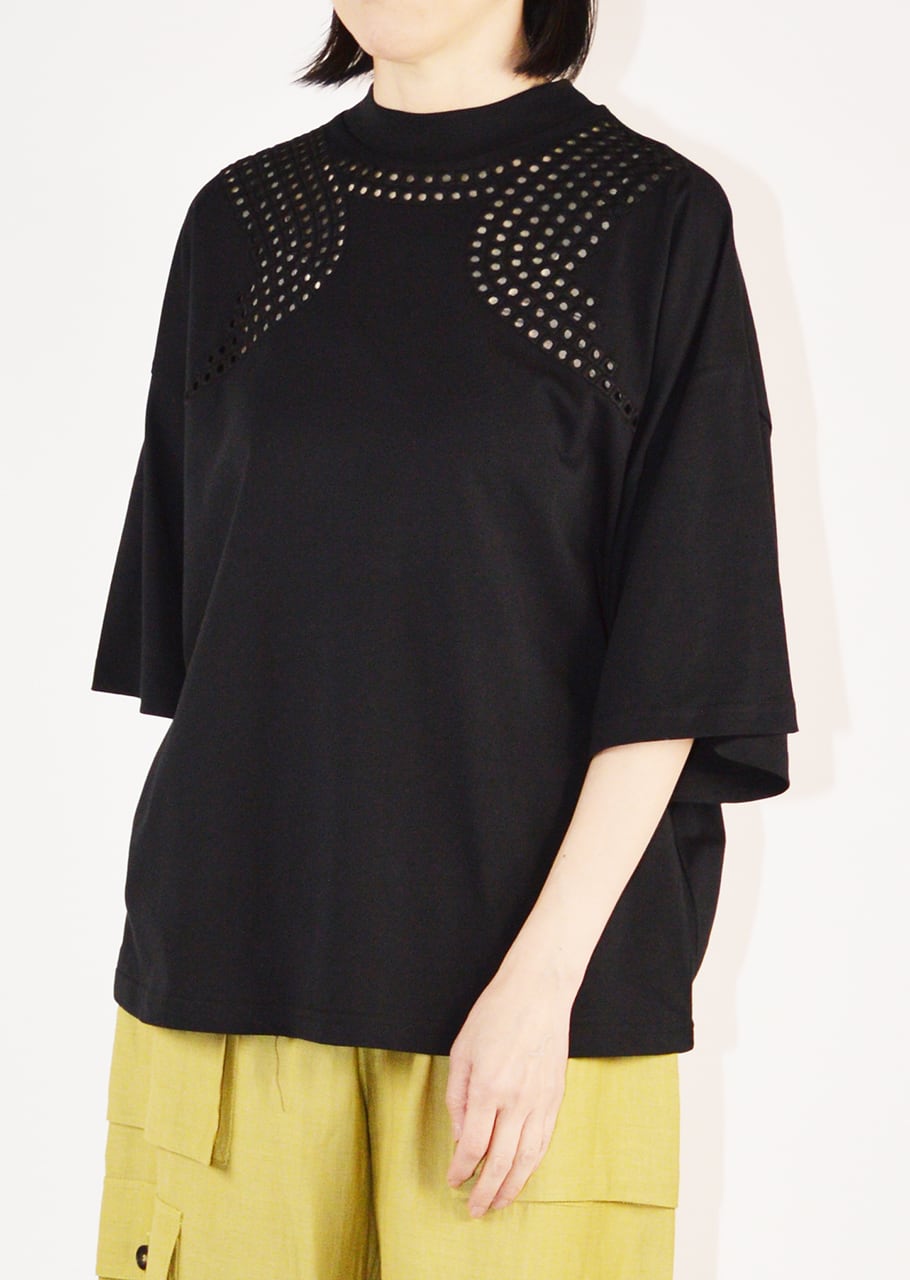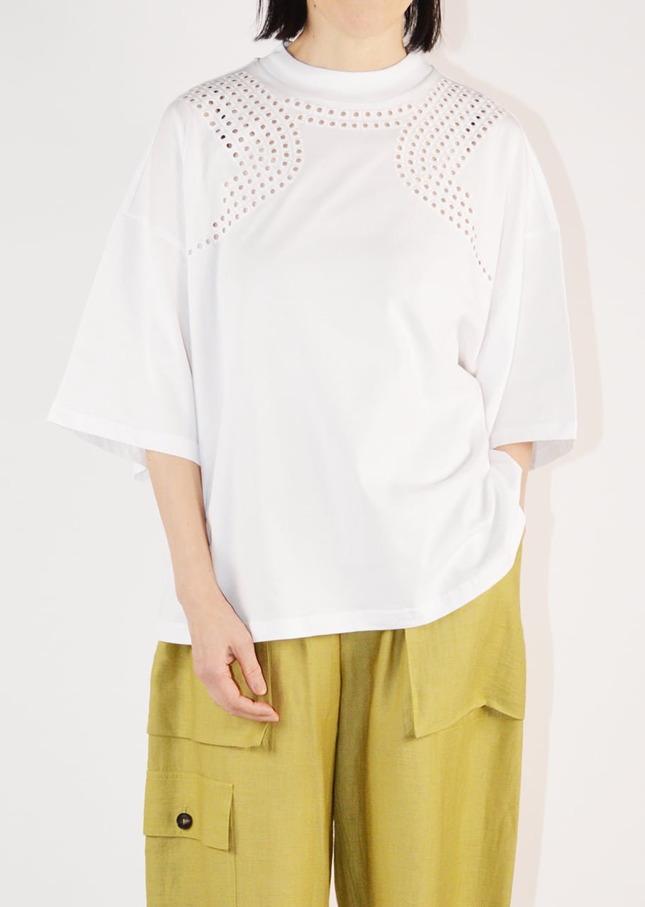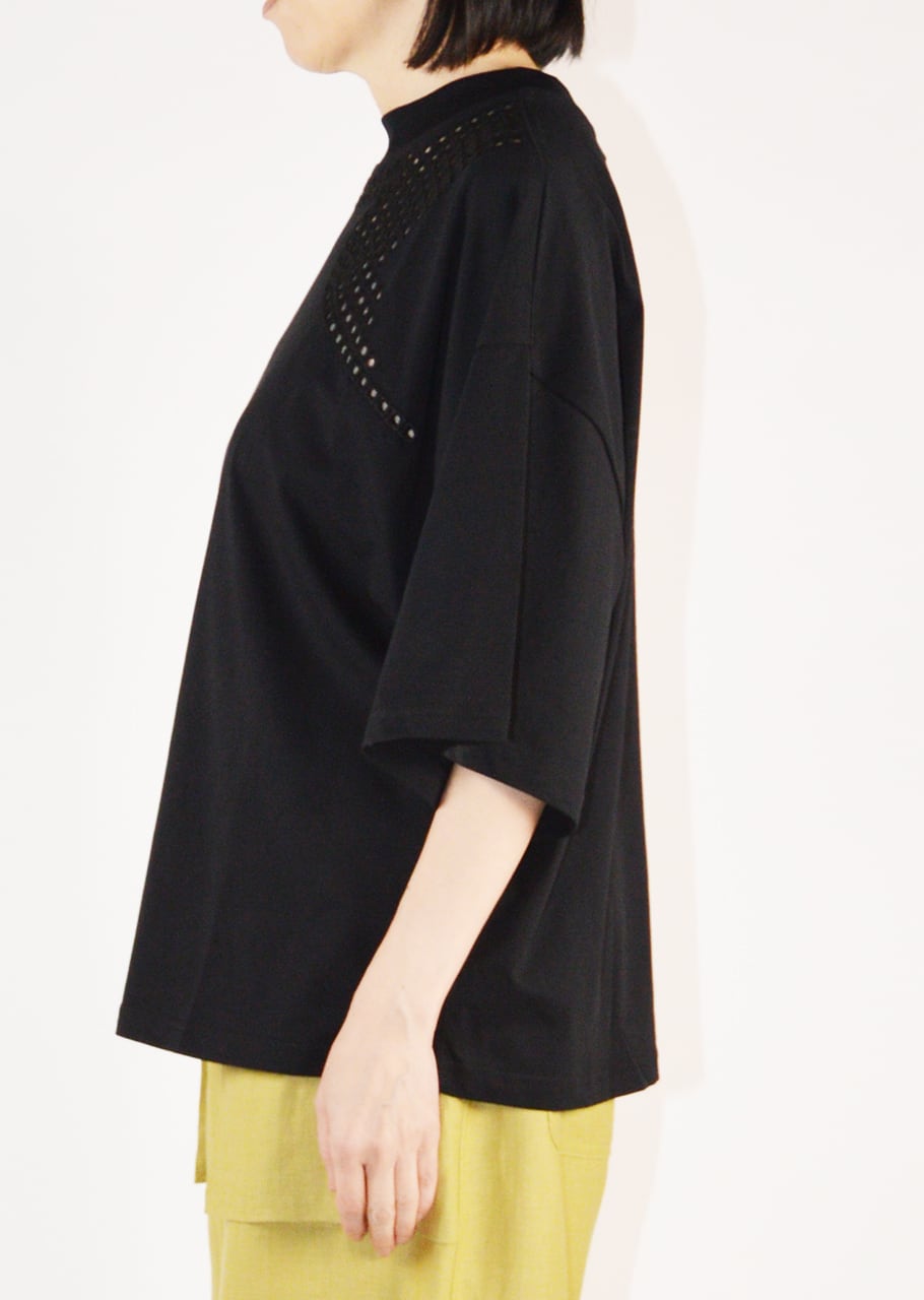 コットン100%のとても滑らかな肌触りのTシャツです。肩のメッシュ使いが大人っぽくフェミニンな印象です。 ややゆったりとしたシルエットでどんなプロポーションにもフィットし、着心地も抜群のアイテムです。