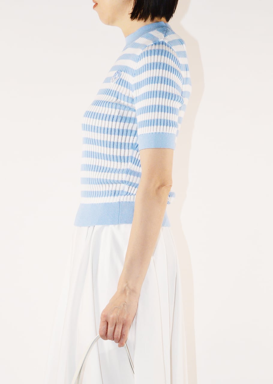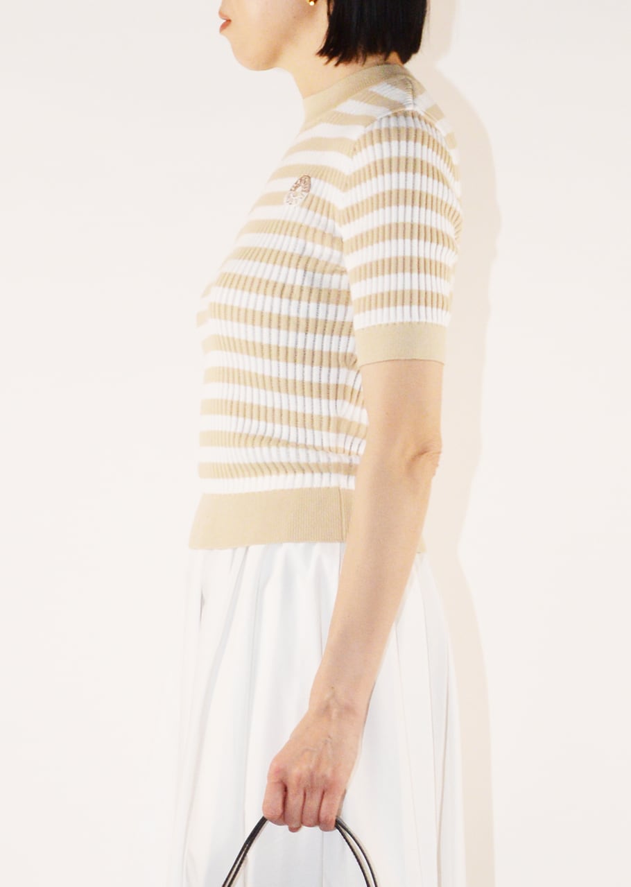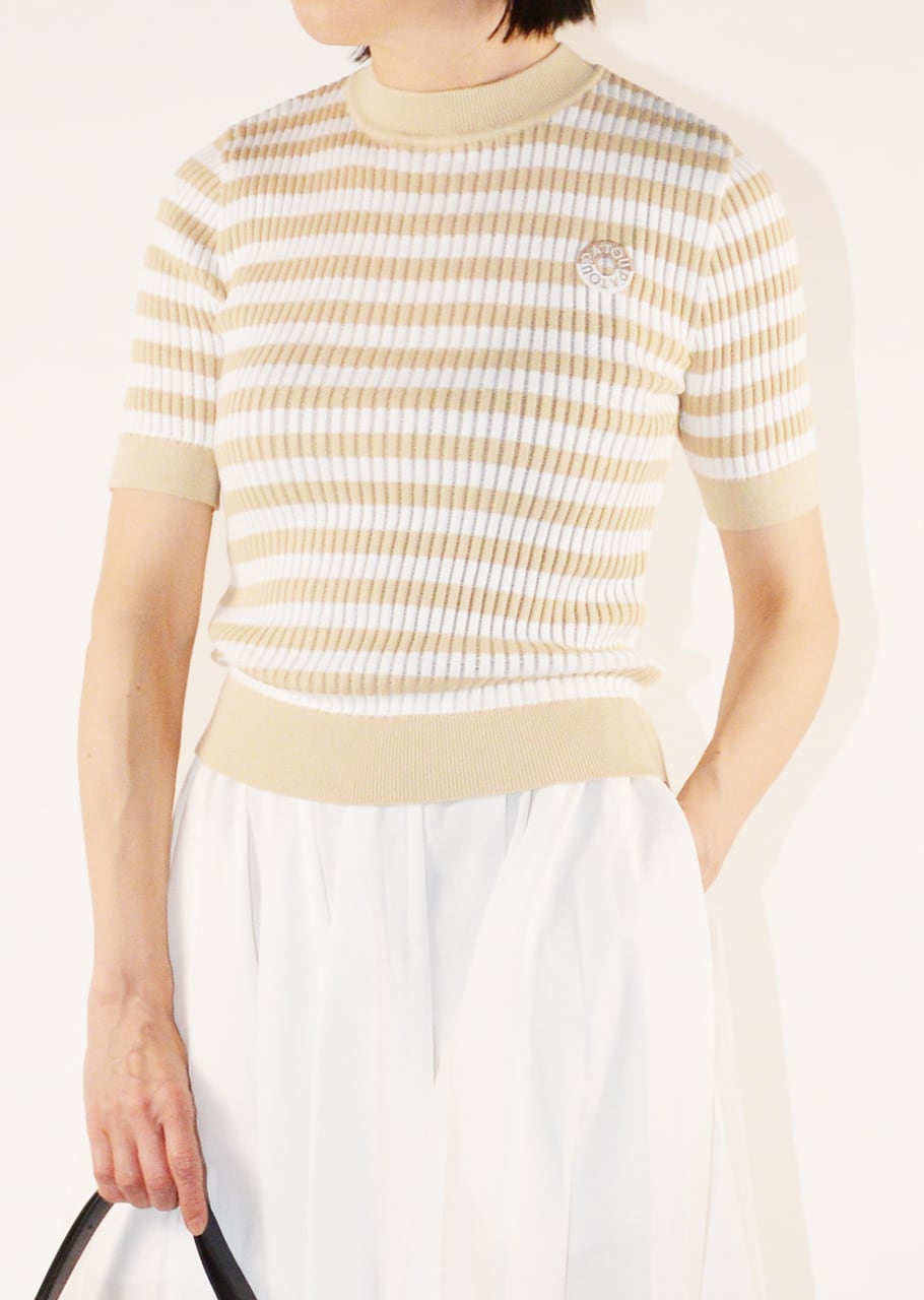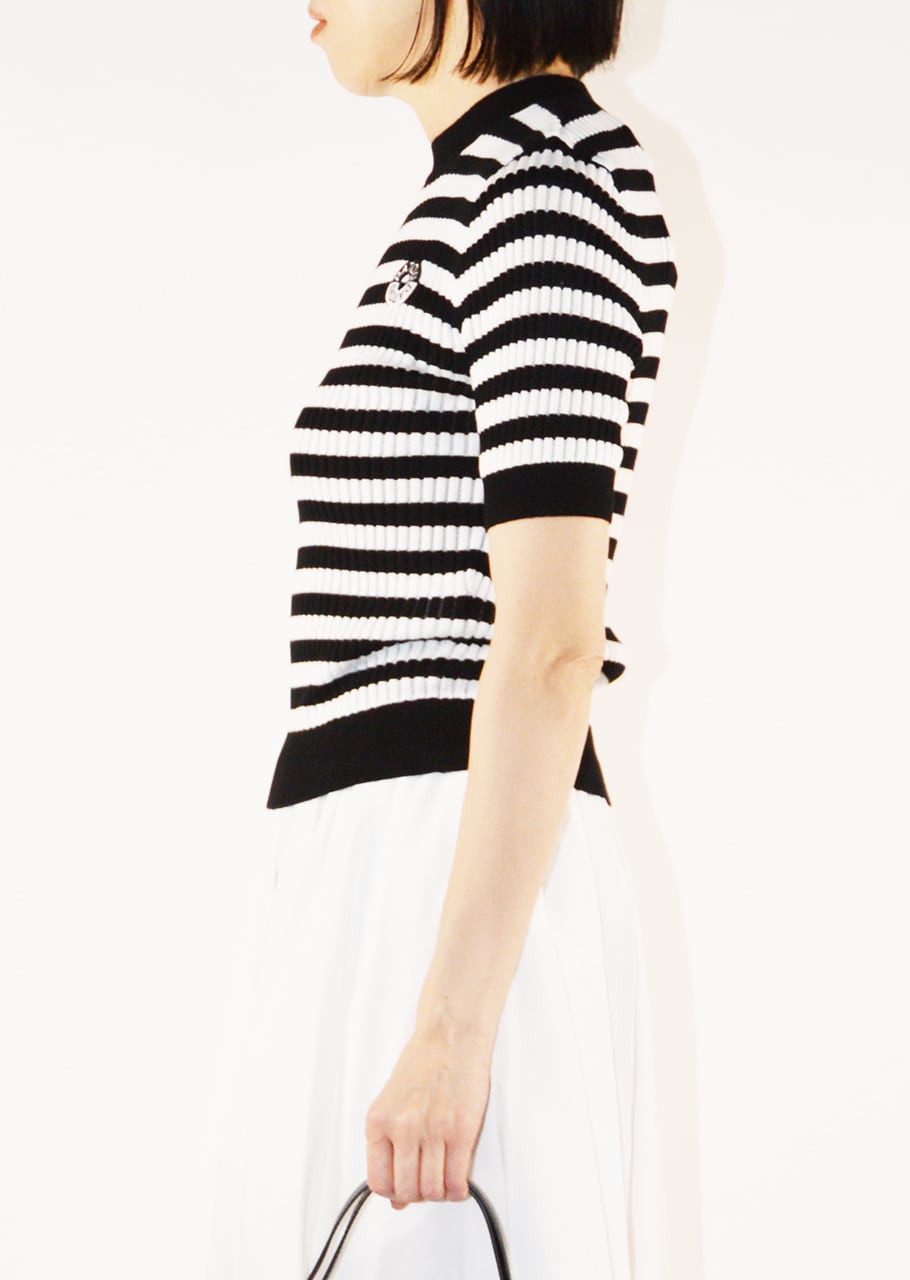 ボーダーが爽やかなリブ編みのショートスリーブニット。コンパクトなフォルムでボディラインをきれいに見せてくれるシルエット。ボーダーのカラーの選択次第でエレガントにもスポーティーにも着こなせるデザインです。