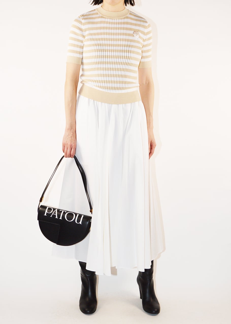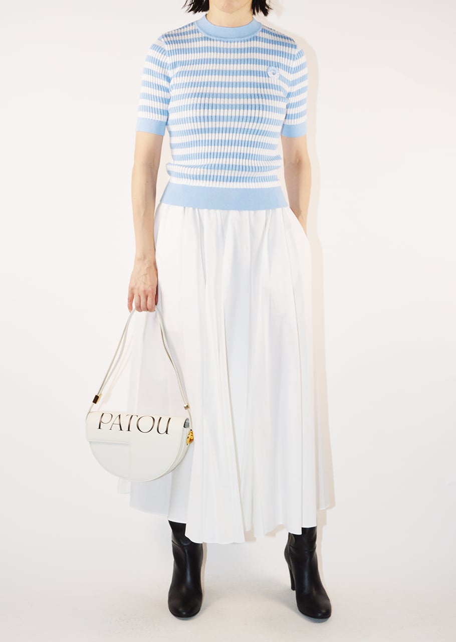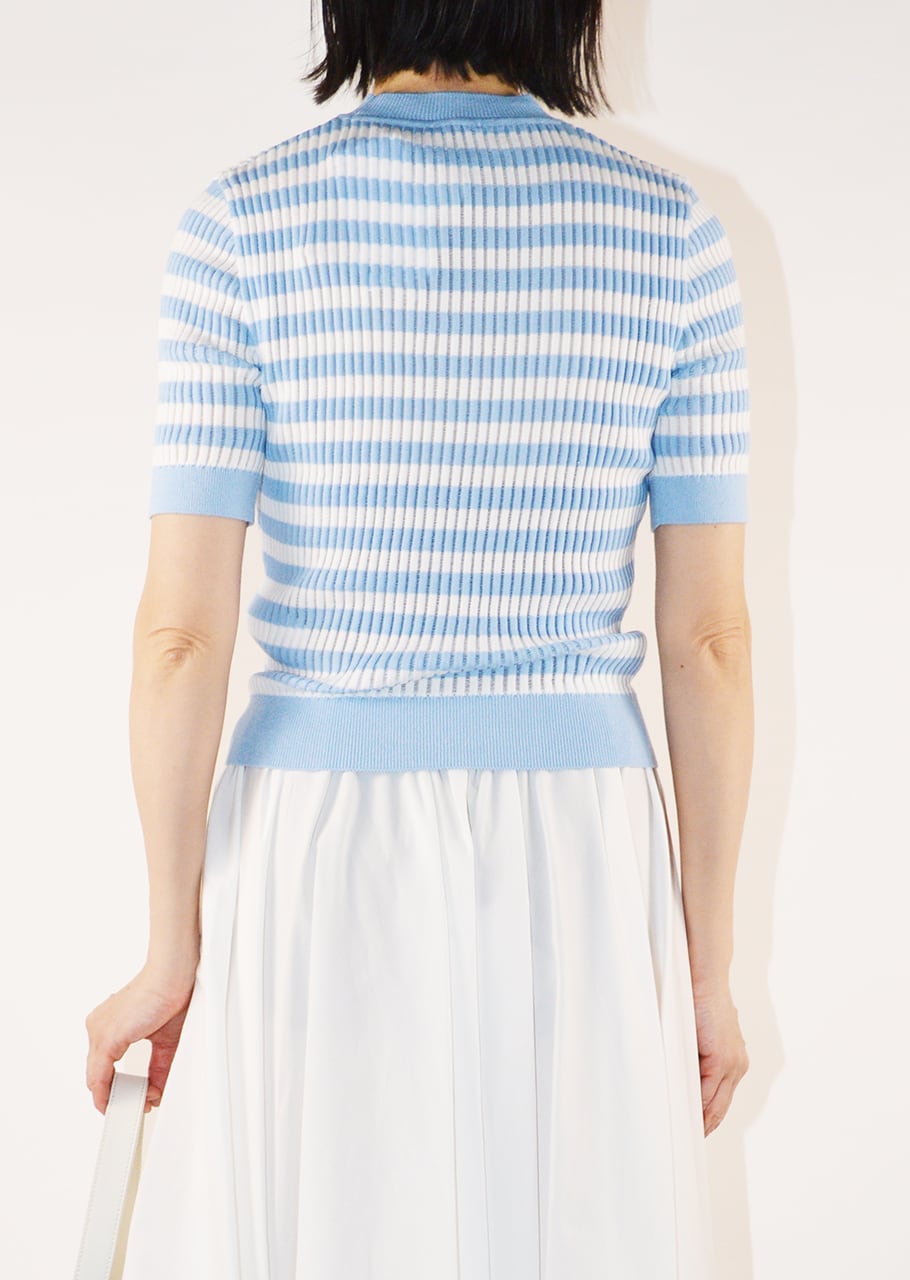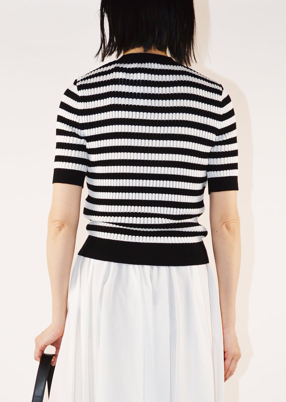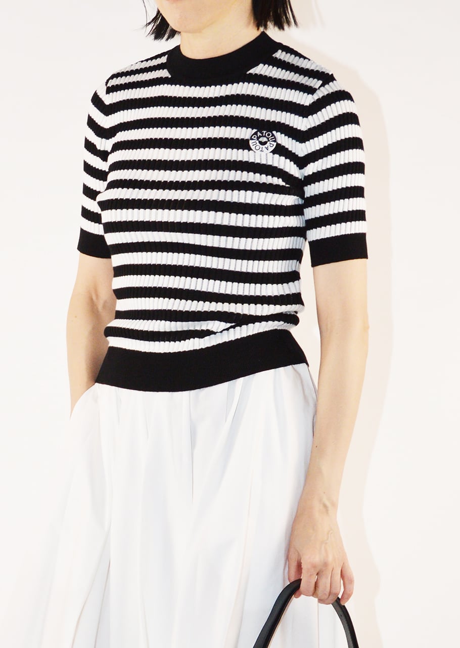 ボーダーが爽やかなリブ編みのショートスリーブニット。コンパクトなフォルムでボディラインをきれいに見せてくれるシルエット。ボーダーのカラーの選択次第でエレガントにもスポーティーにも着こなせるデザインです。