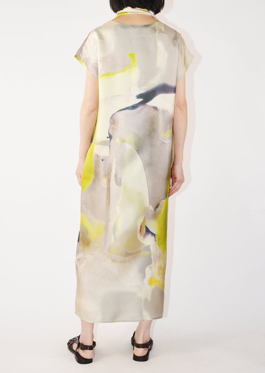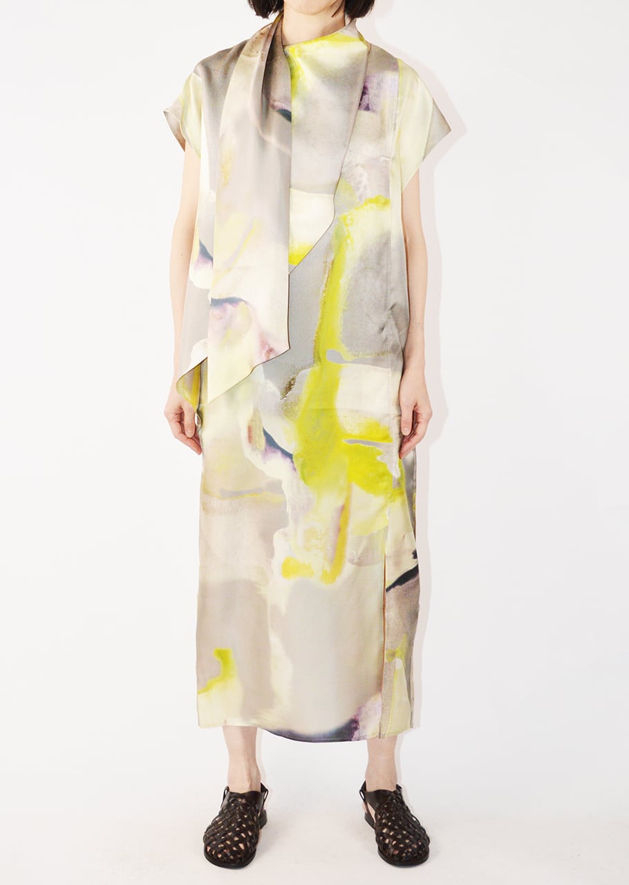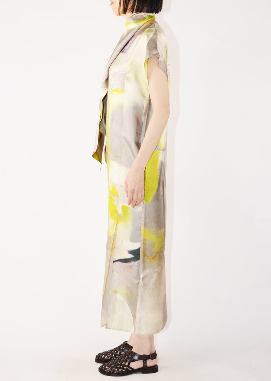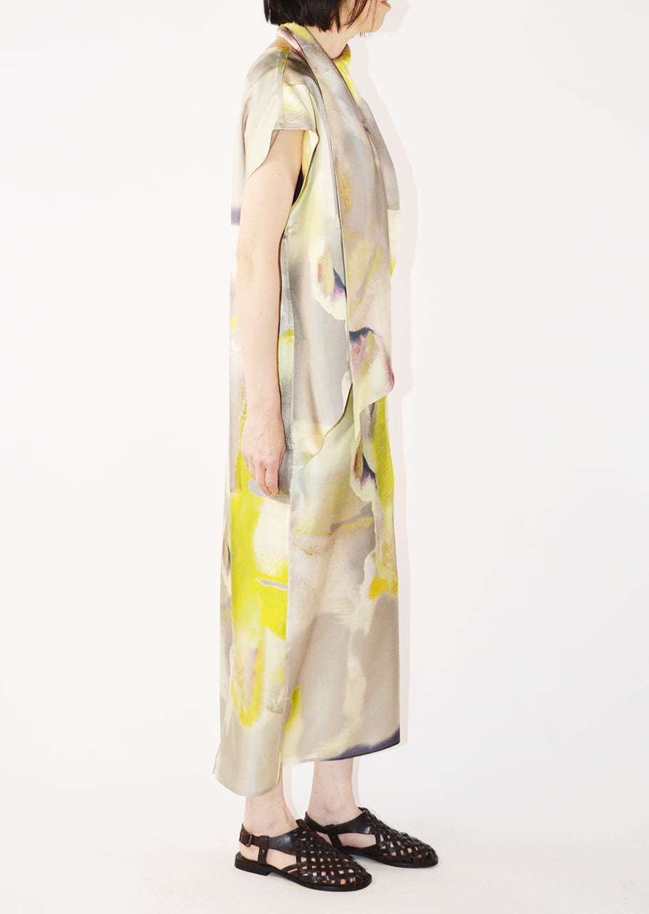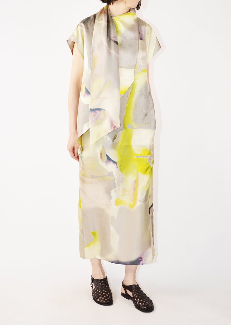 滑らかな素材にプリントをあしらったスリーブレスドレスです。リラックス感のあるシルエットで、着こなしにエレガントな表情をプラス。シックにもカジュアルにも活躍すること間違いなしのアイテム。大人の女性のスタイリングにおすすめの一枚です。