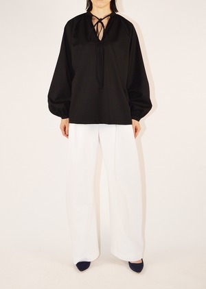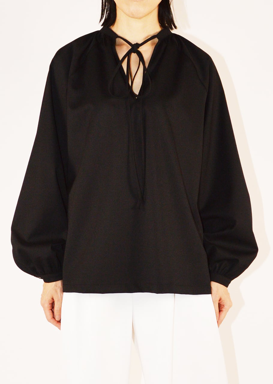 なめらかなウールポリエステル素材で仕上げたブラウスです。襟元のギャザーと長めのリボン、バルーンスリーブ、と、華のある要素が目を惹くアイテムです。付かず離れずのややゆったりとしたシルエットで、着心地の良さも魅力です。