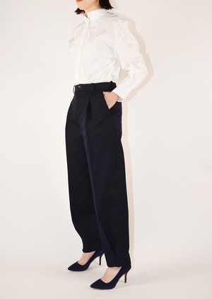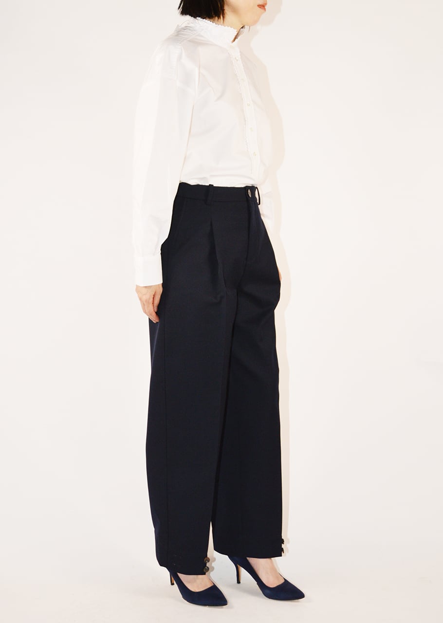 ヒップ周りには少しボリュームがあり、裾に向けて絞ったシルエットが美しいパンツです。腰回りはゆとりがあるので履き心地もよく、合わせるトップ次第でオンオフ問わず活躍します。表情のあるファブリックは上品かつこなれ感を表現。コーディネートのベースとして持っていたいアイテムです。裾のボタンを留めればまた違ったシルエットが楽しめる。