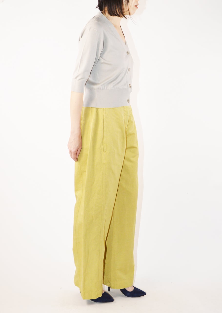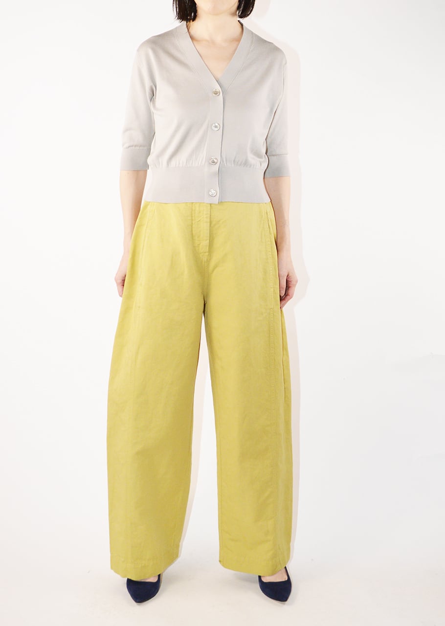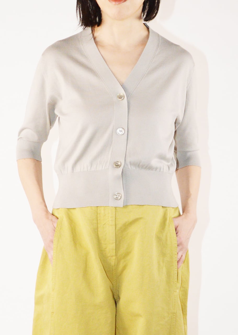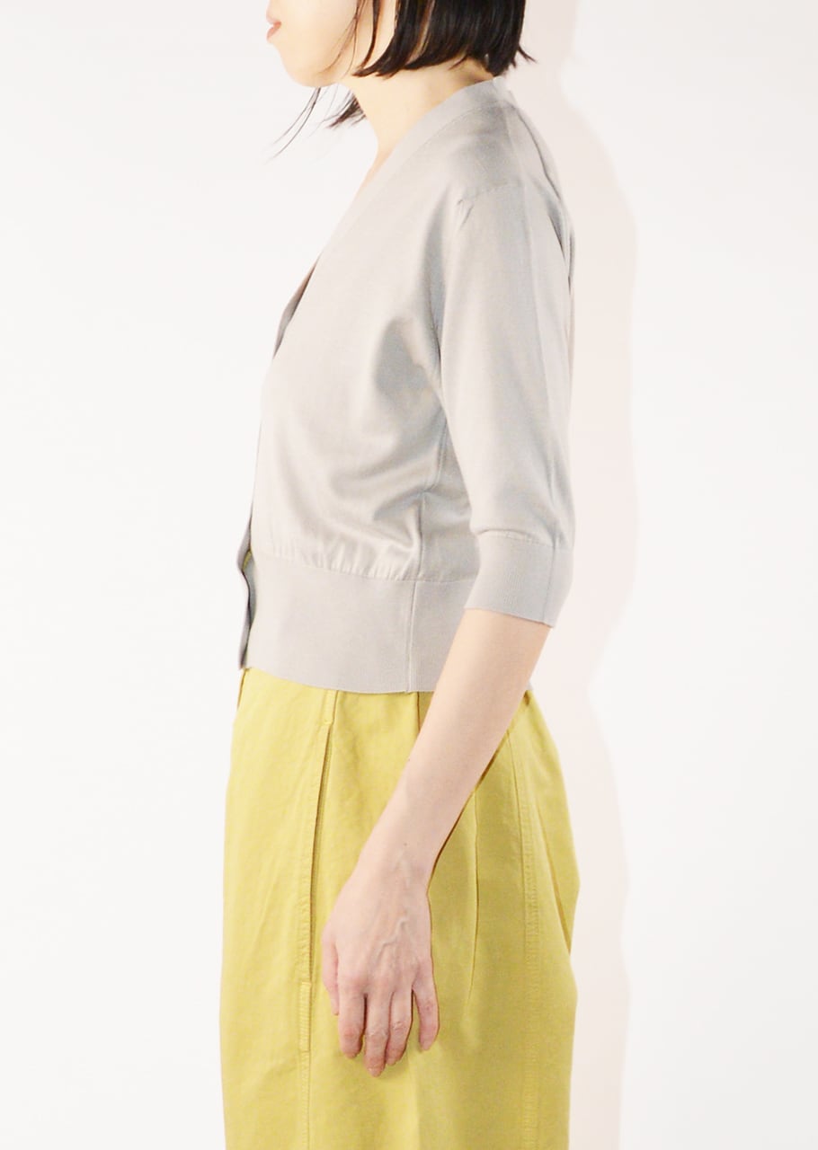 肘まで隠れる5分袖とすっきりとした短めの着丈のカーディガン。前立てから襟はハリを持たせることで端正な印象に。羽織りものとしてはもちろん、ボタンを留めて一枚で着て、ワイドパンツやフレアスカートと合わせるクラシカルなコーディネートもおすすめです。