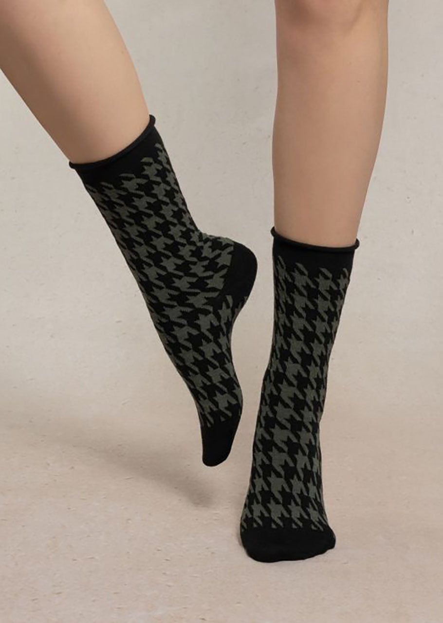 レトロなムード漂う千鳥格子柄が、足元に上品なアクセントを添えるウール混ソックス。シックなカラーに映えるコントラストの配色が、スタイリングに洗練された印象をプラス。肌ざわりの良さと程よい厚みで、秋冬のデイリースタイルに取り入れたい一足。