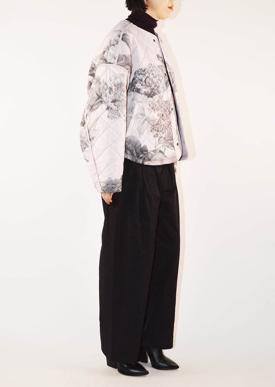 ノーカラーでジャケットのようにすっきりと着こなせるデザイン。一枚で無地とプリントの異なる表情を堪能できる一着。その日のスタイリングで着こなしを楽しんで。