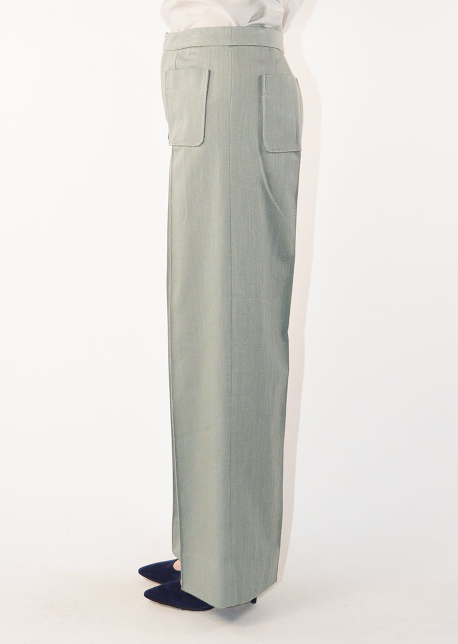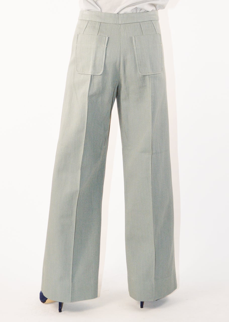 ややフレアしたストレートカットのコットンパンツ。フロントとバックにある二つずつのパッチポケットがポイントです。レッグラインに沿ってセンタープレスが施されており、カジュアルすぎない端正な印象です。