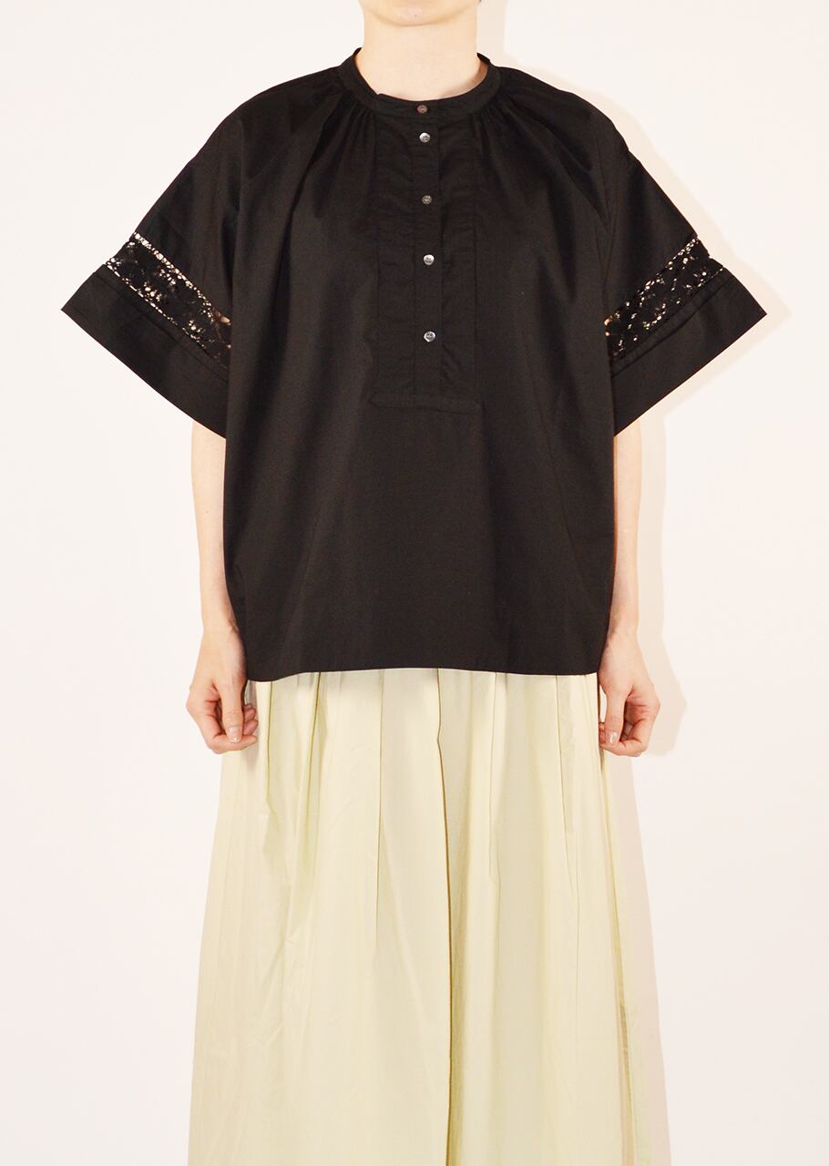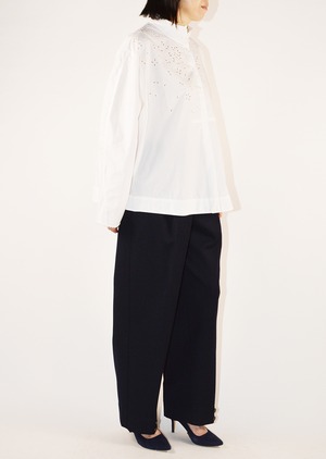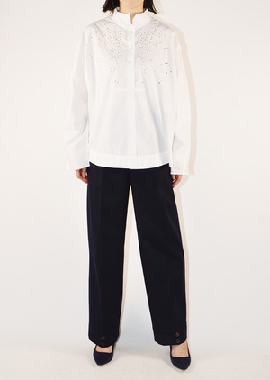 SOEURのコアアイテムのひとつ、女性らしく上品なコットンポプリンブラウス。フロント部分にはスカラップ刺繍を施したロマンチックなデザインですが、甘くなり過ぎず、一枚でもインナーにも、オンオフ問わず使えるアイテムです。