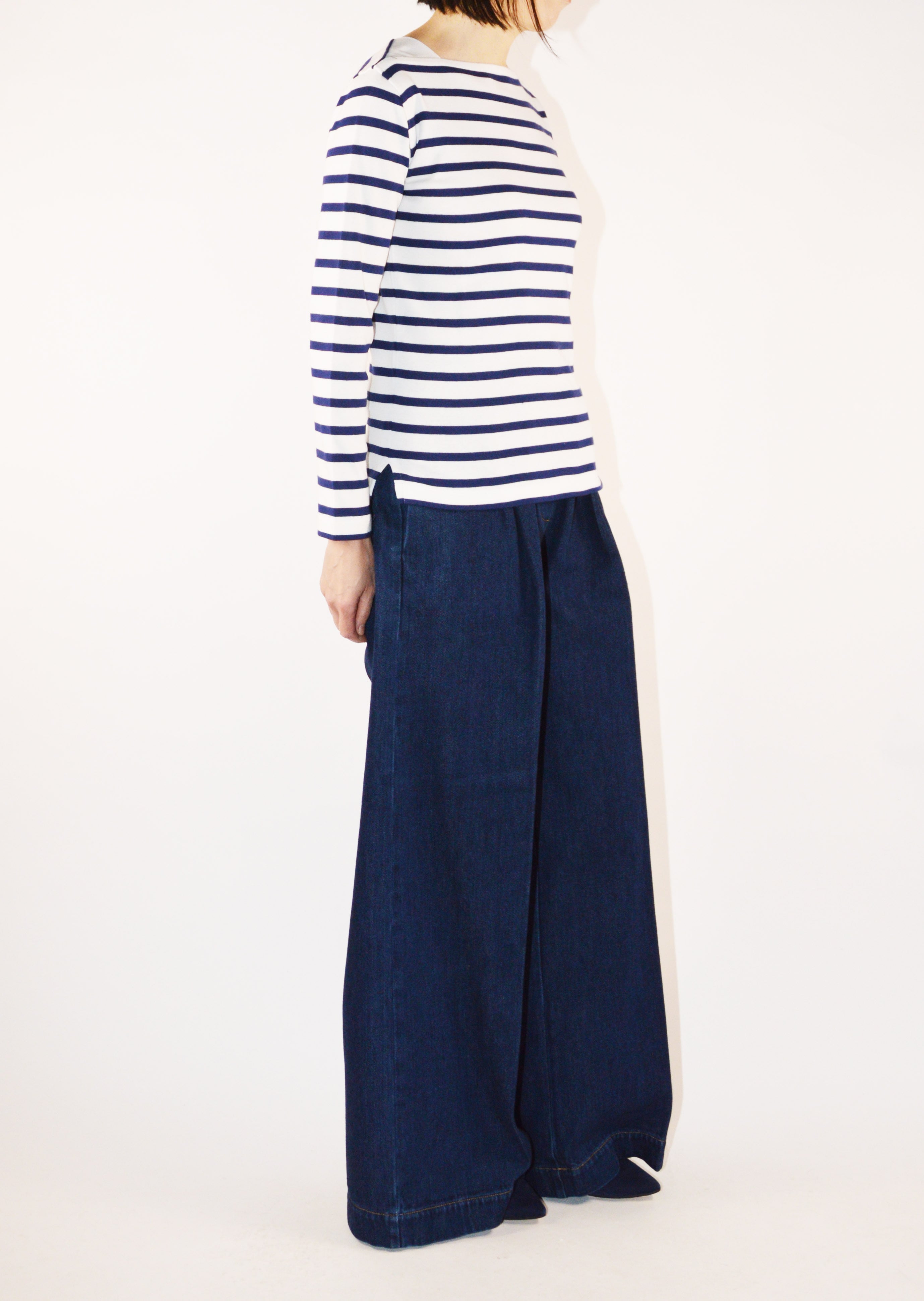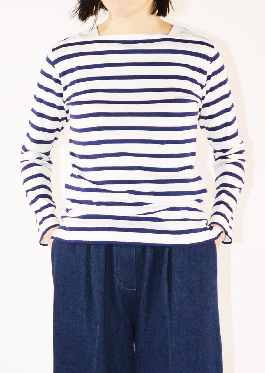 ホワイト×ネイビーブルーがフレッシュなコットンジャージーのトップです。ブランドのシグネチャーアイテムで、洗練されたネックライン(ガセット仕上げのボートカット)、高密度のオーガニックコットンジャージを用い、女性らしい存在感が際立っています。カジュアルになりすぎず、一枚でもインナーにも、オンオフ問わず使えるアイテムです。