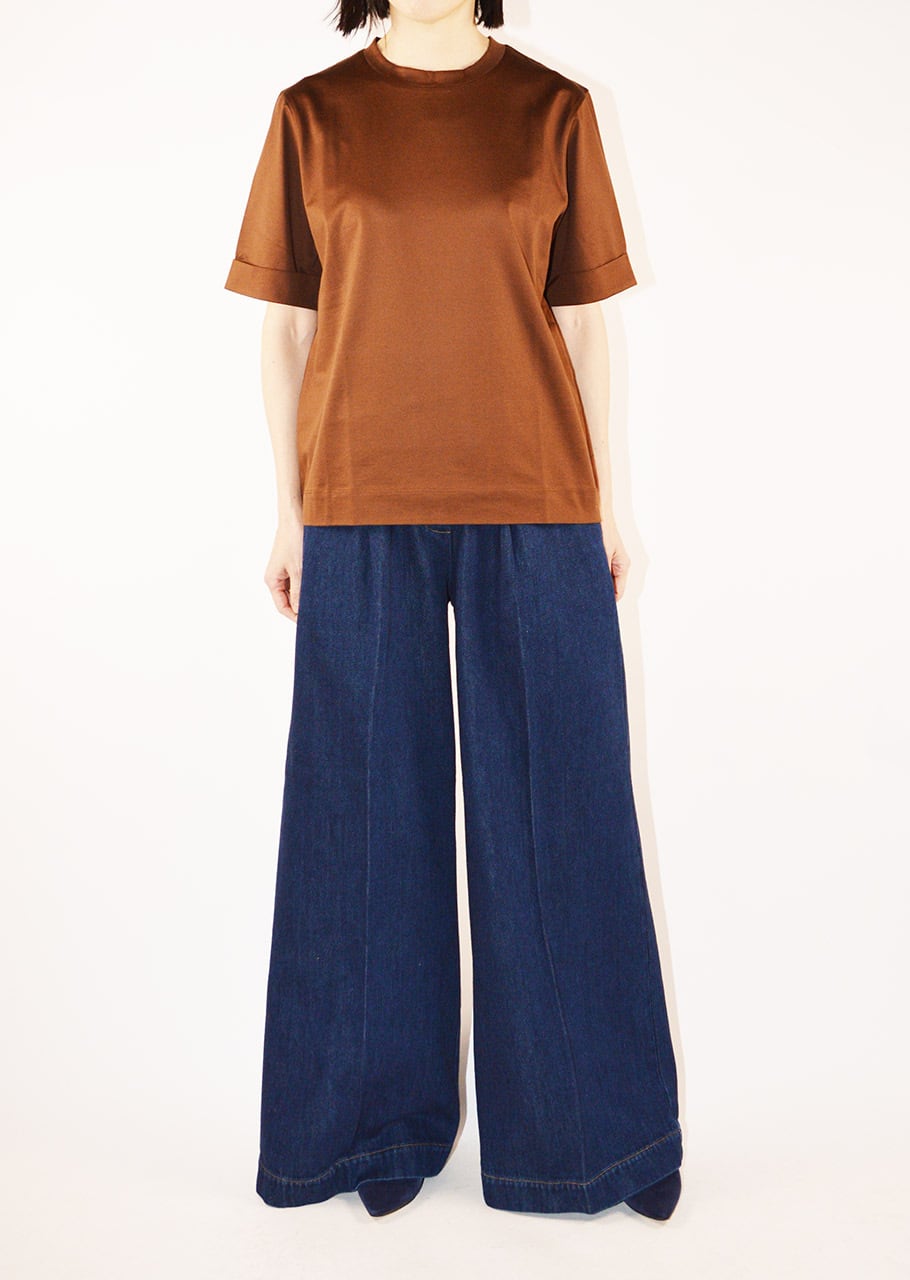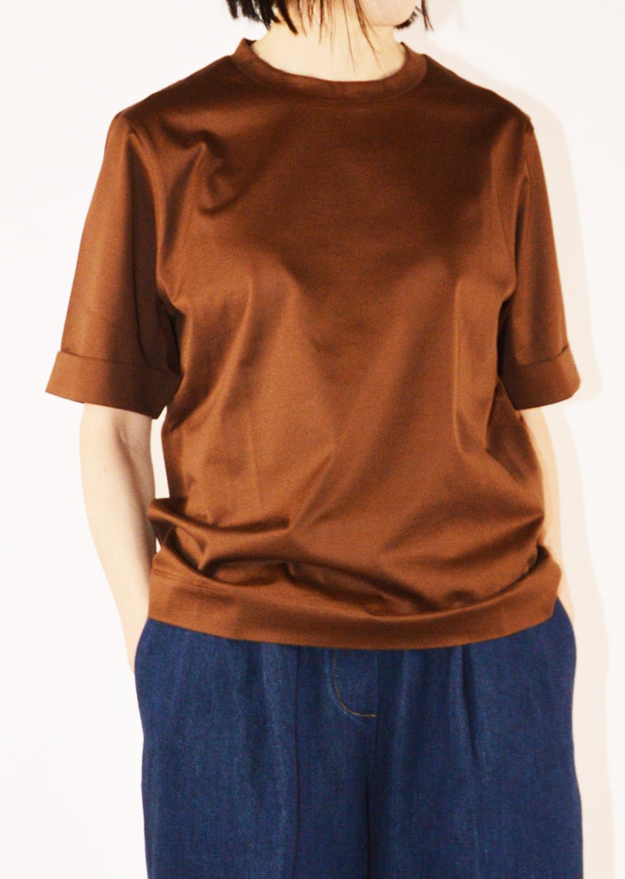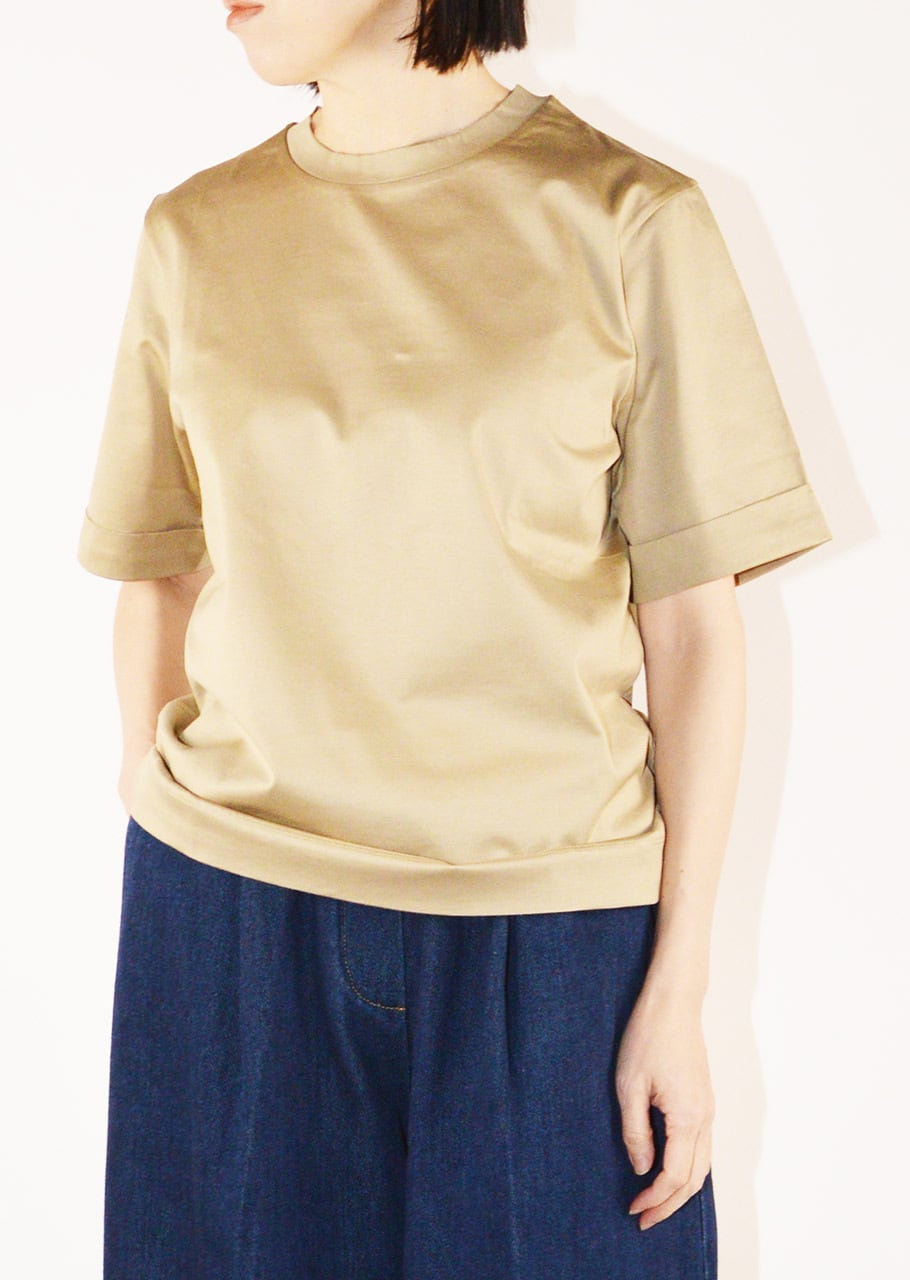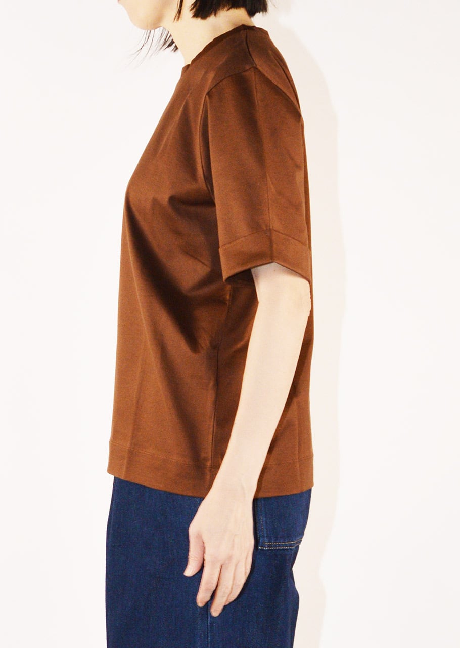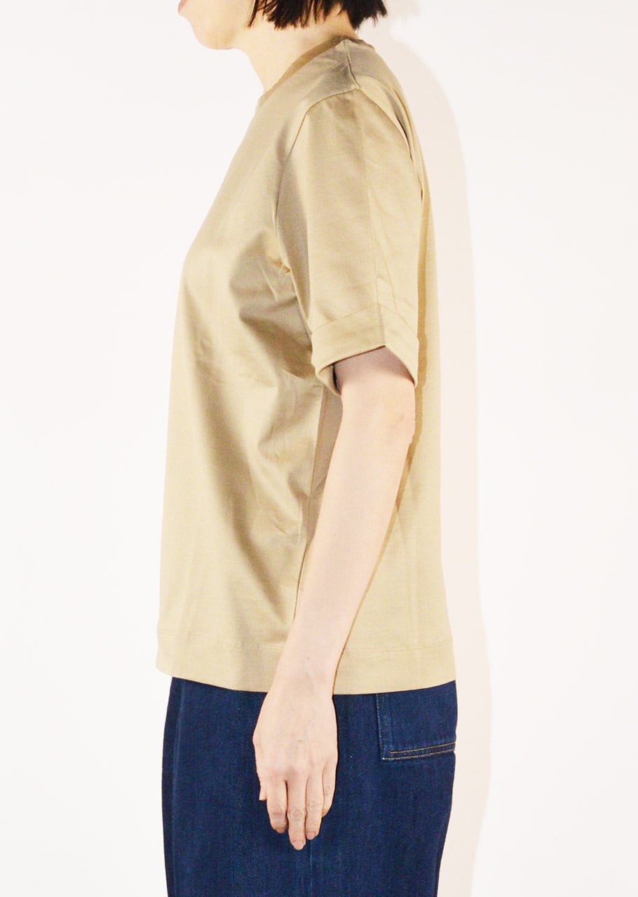 ブランドのコアアイテムのひとつ、女性らしく上品なコットンクルーネックTシャツ。ストレートシルエットに折り返し付きの袖、ラウンドネック、とシンプルでありながらなめらかなマーセライズドコットンが上品な印象のアイテムです。一枚でも、またジャケットのインナーにも、オンオフ問わず使えるアイテムです。