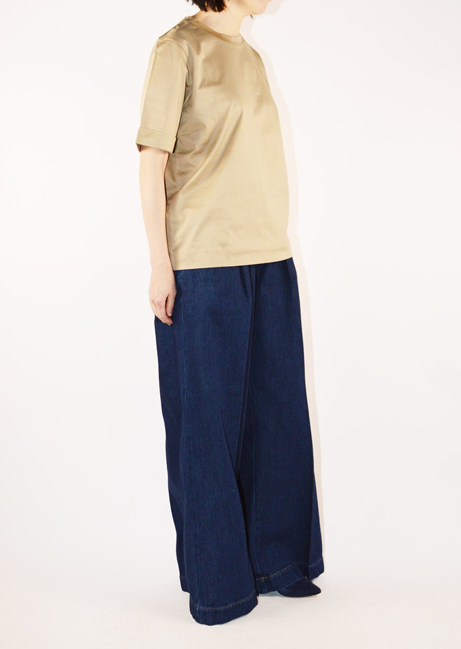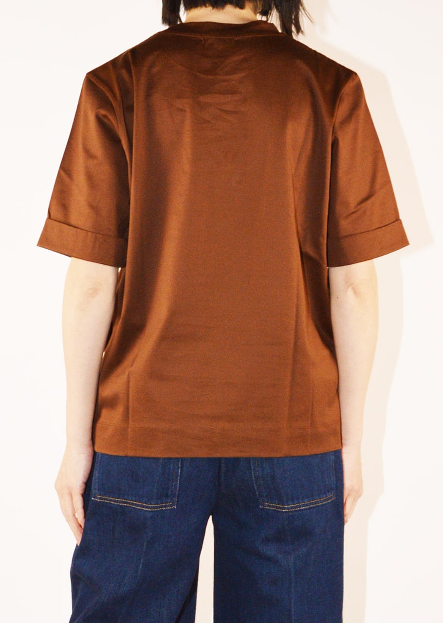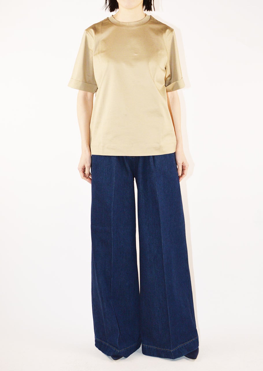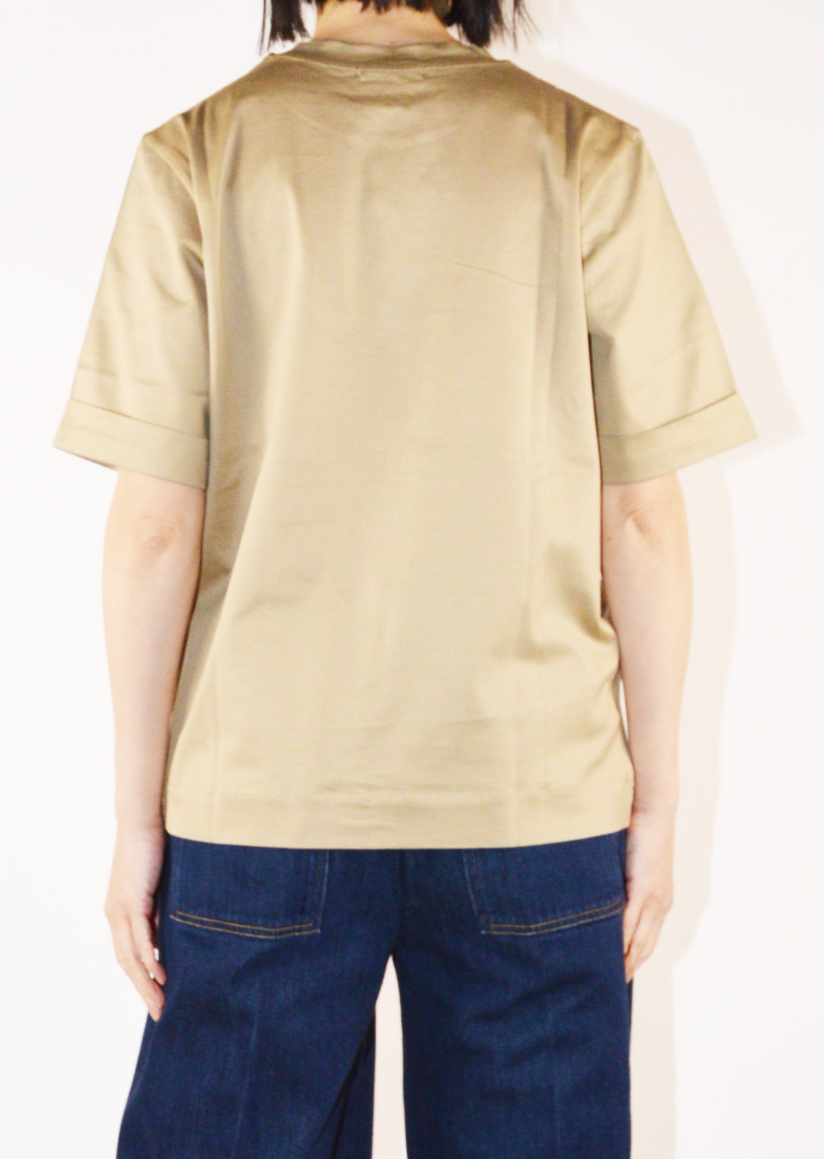 ブランドのコアアイテムのひとつ、女性らしく上品なコットンクルーネックTシャツ。ストレートシルエットに折り返し付きの袖、ラウンドネック、とシンプルでありながらなめらかなマーセライズドコットンが上品な印象のアイテムです。一枚でも、またジャケットのインナーにも、オンオフ問わず使えるアイテムです。