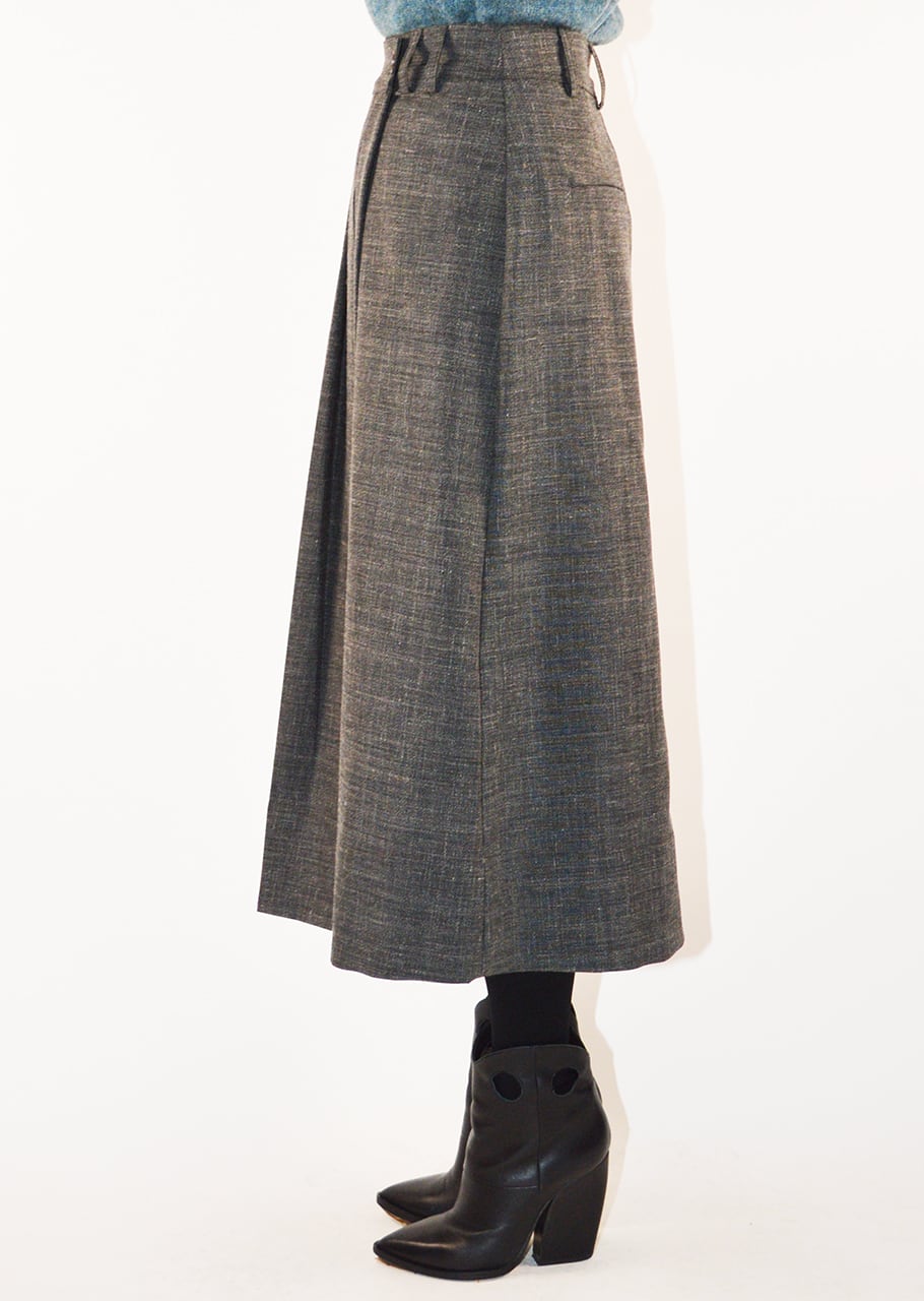 カーキバージンウールのラップスカート。ハイウエスト、サイドのボリュームが生むすっきりとした落ち感が魅力です。バージンウールは暖かさとしなやかな柔らかさがあり、秋冬シーズンを暖かく過ごすのにマストなアイテムです。