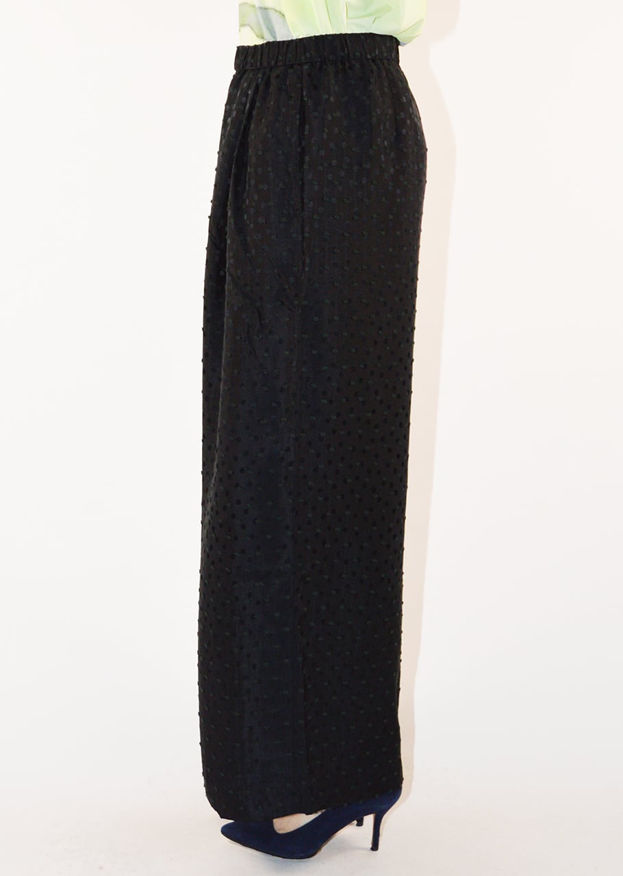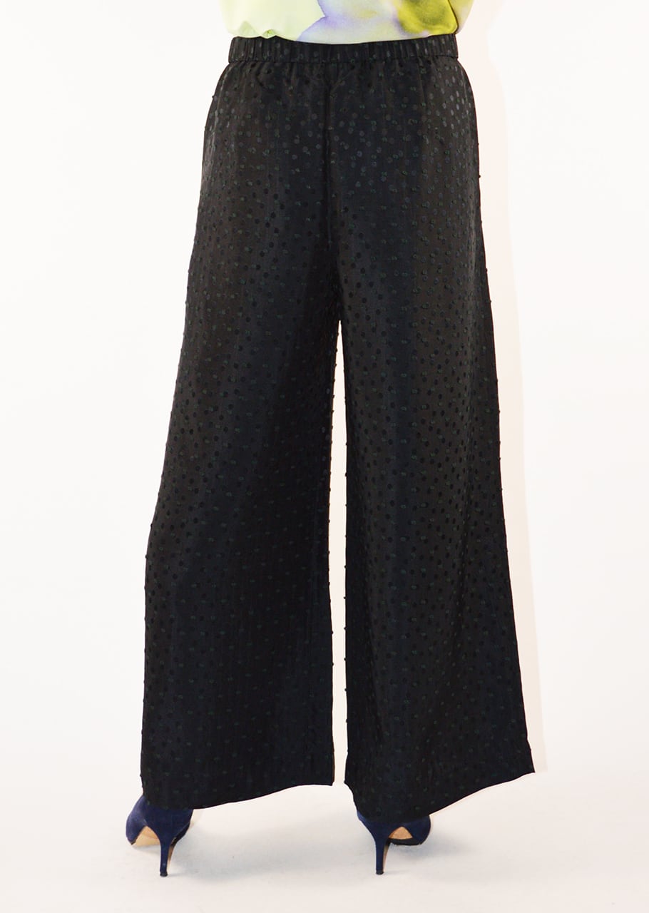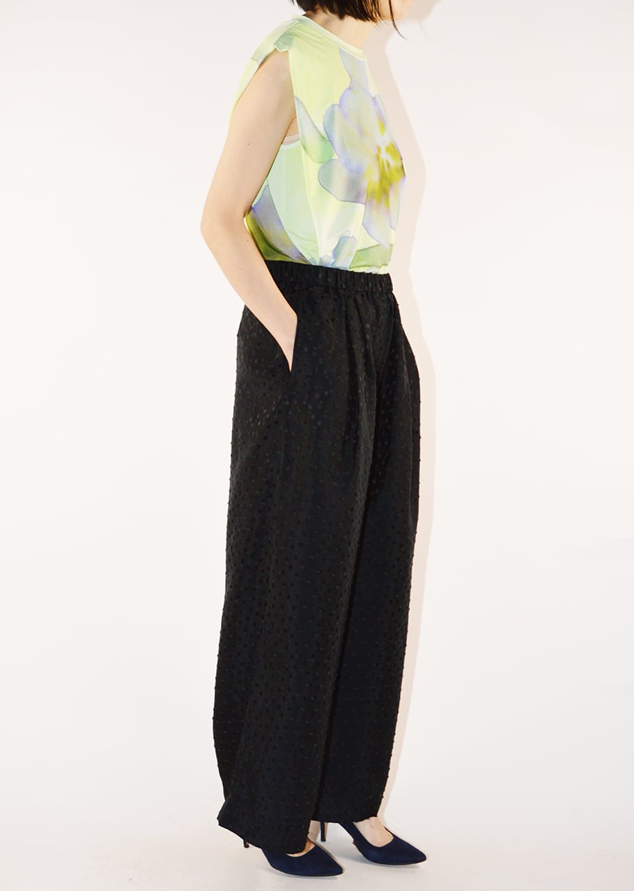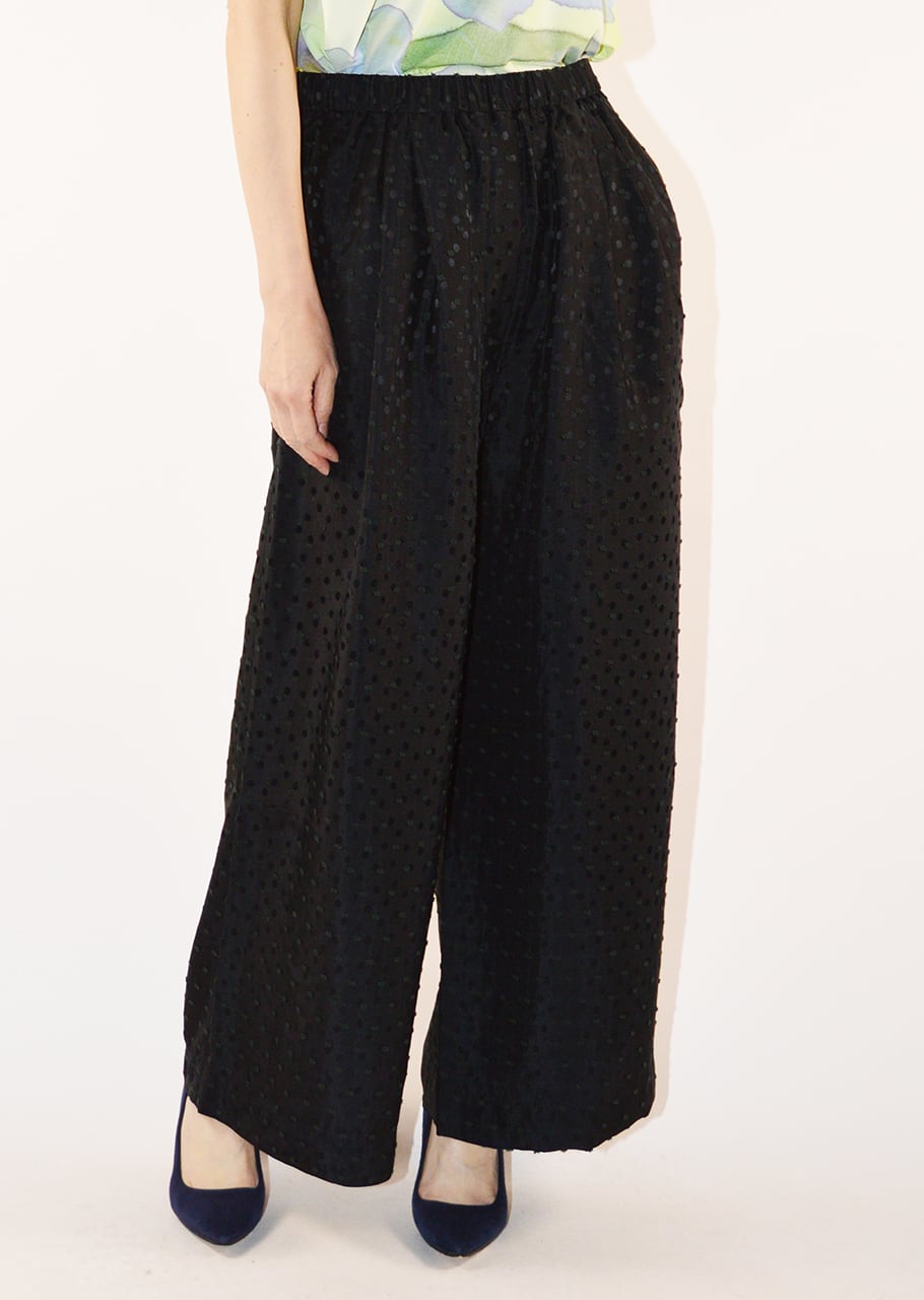 やわらかな素材を用い、ブラックを軽やかに表現したパンツです。軽くて滑らか、さらりとした風合いが魅力。 全体に施されたドットモチーフがポイントです。フロントには2タック入りで、レッグラインを拾わないワイドシルエット。イージーな着脱をサポートするゴムウエストもポイント、リラックスして着こなすことができます。