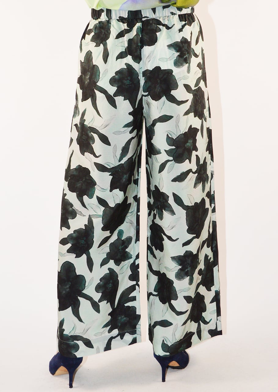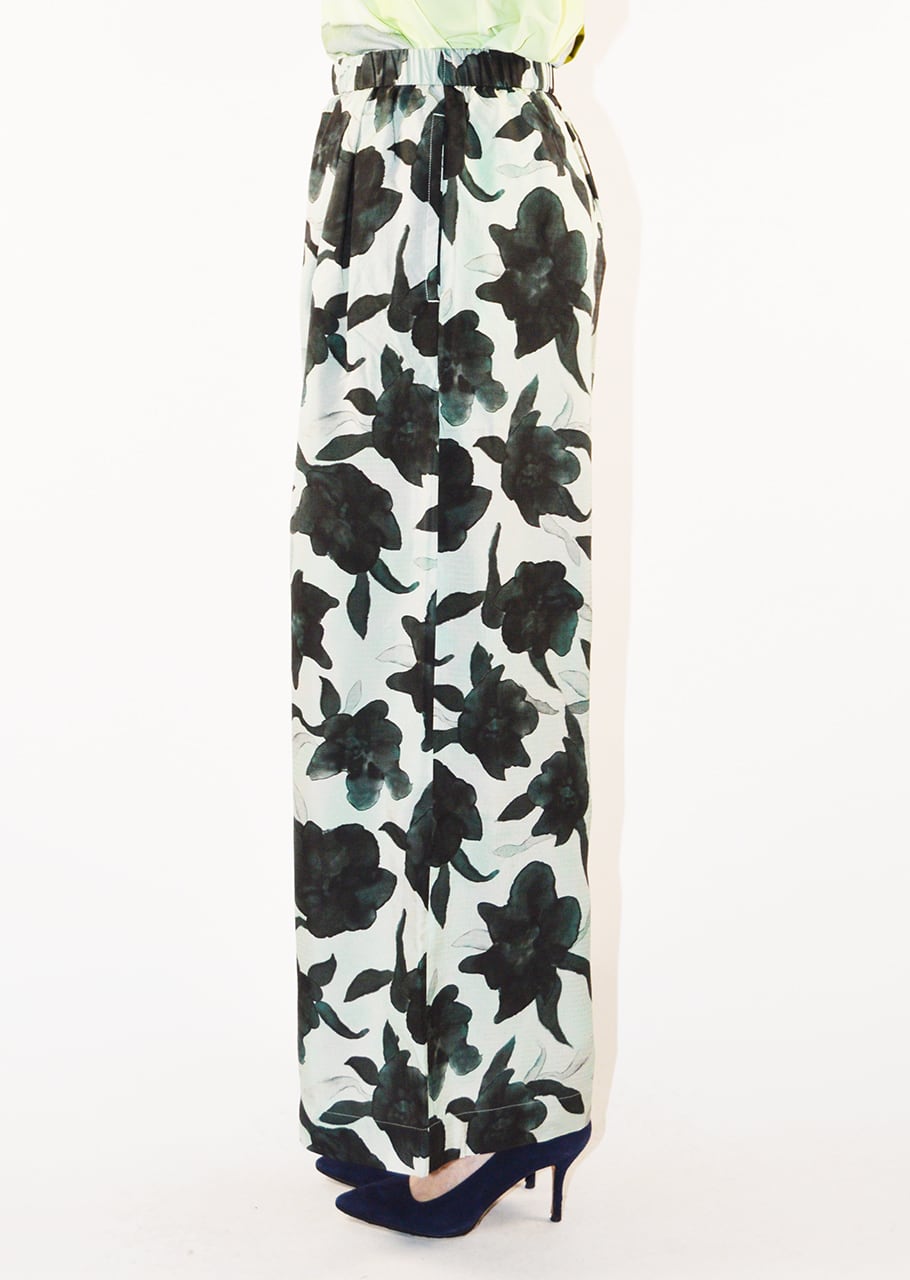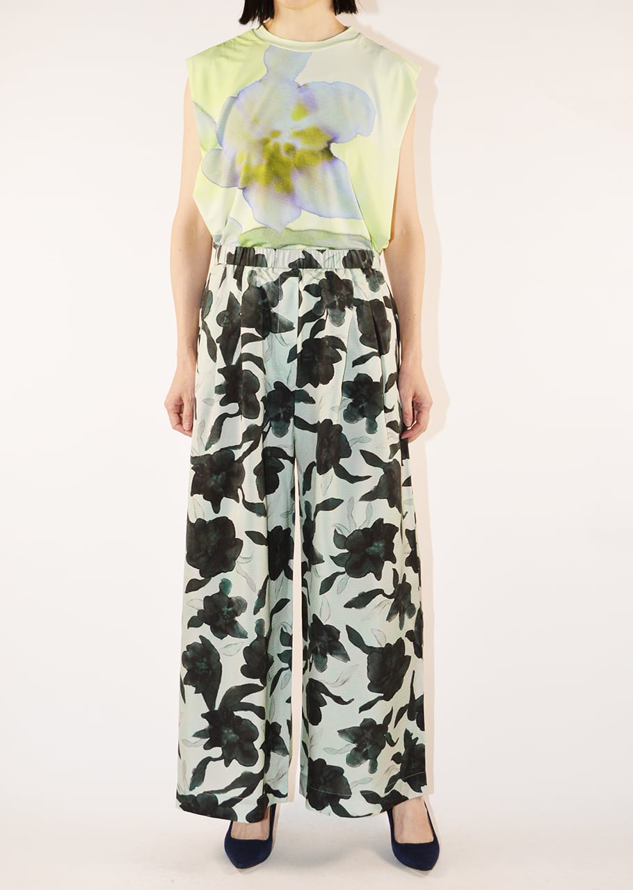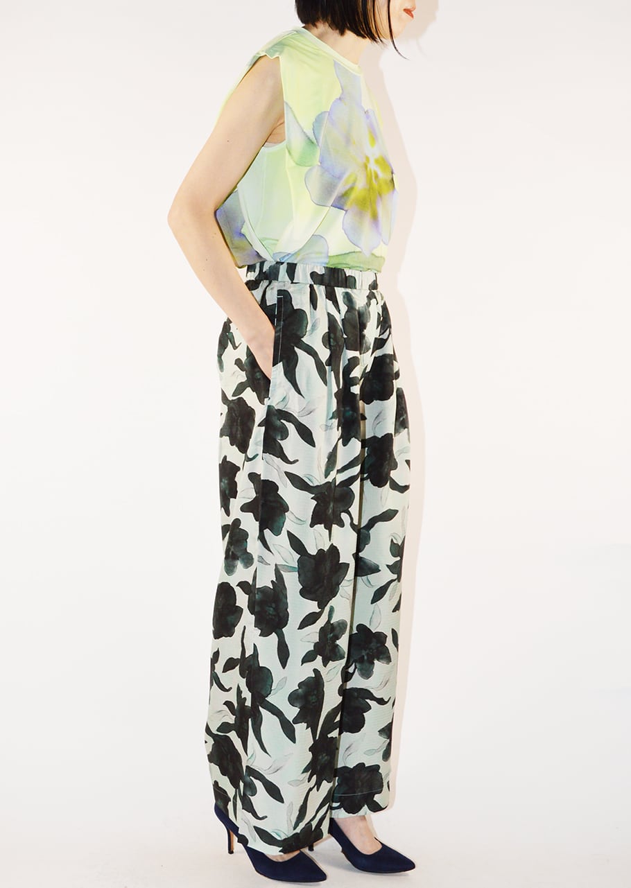やわらかな素材を用い、ブラックを軽やかに表現したパンツです。軽くて滑らか、さらりとした風合いが魅力。 ブランドオリジナルのフラワープリントがポイントです。フロントには2タック入りで、レッグラインを拾わないワイドシルエット。イージーな着脱をサポートするゴムウエストもポイント、リラックスして着こなすことができます。