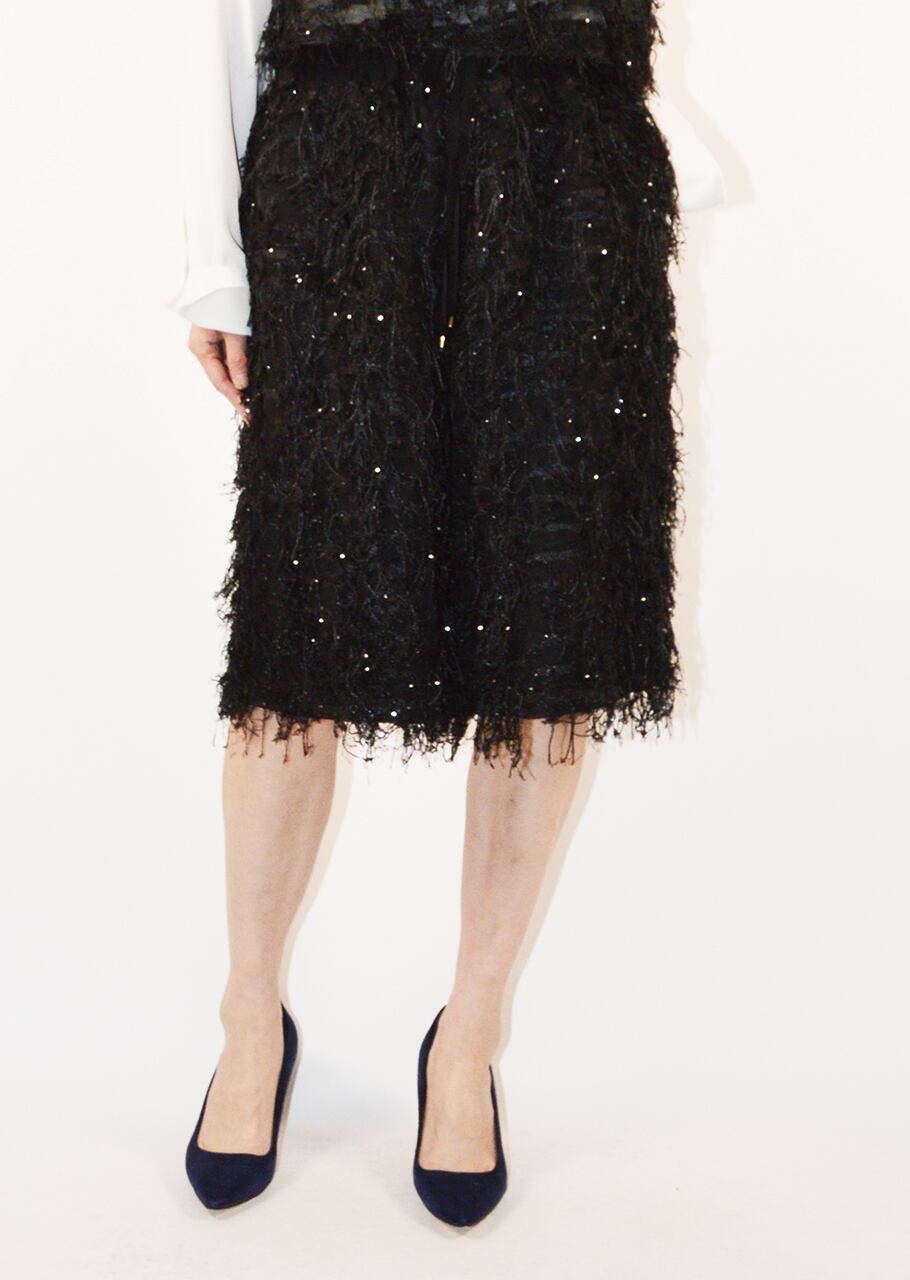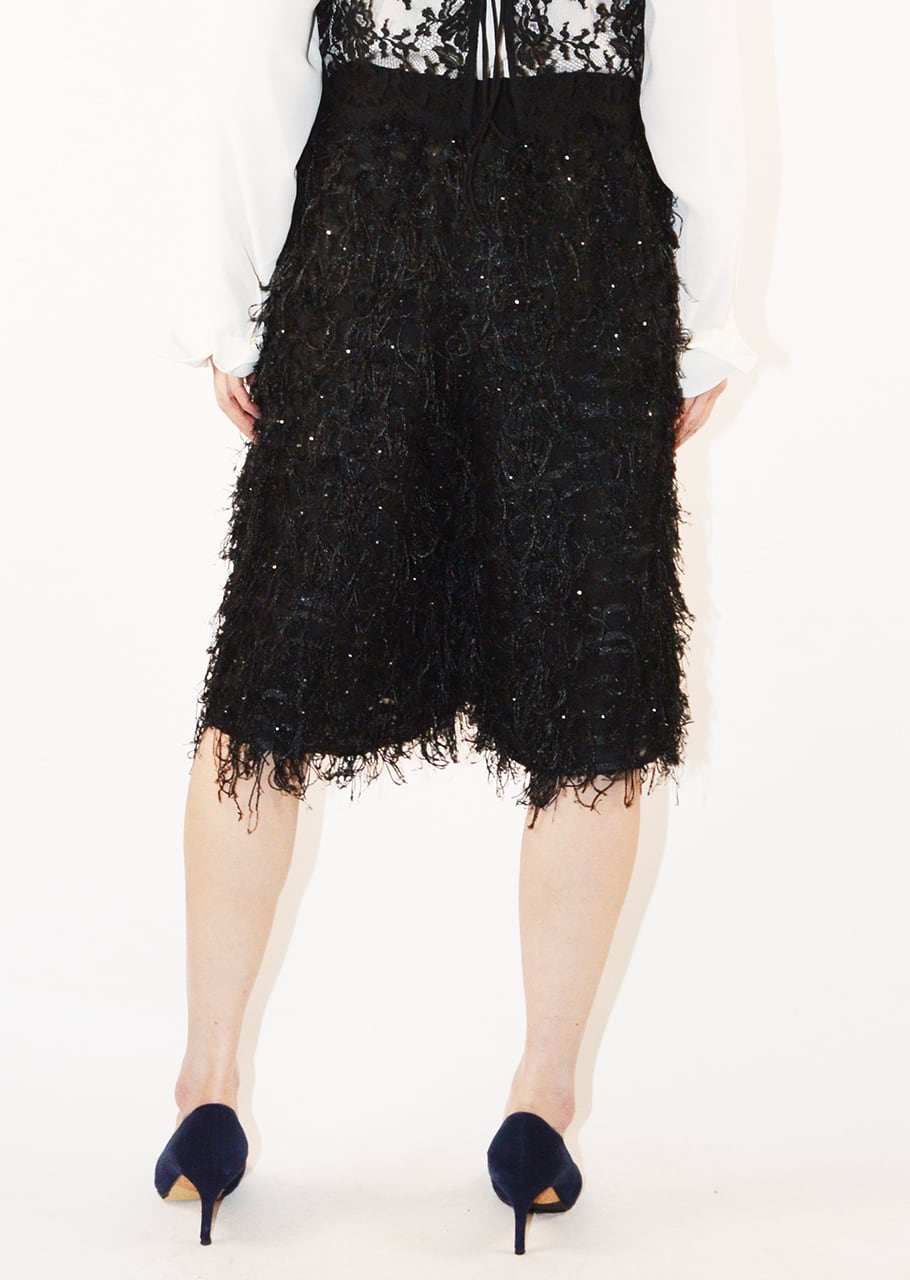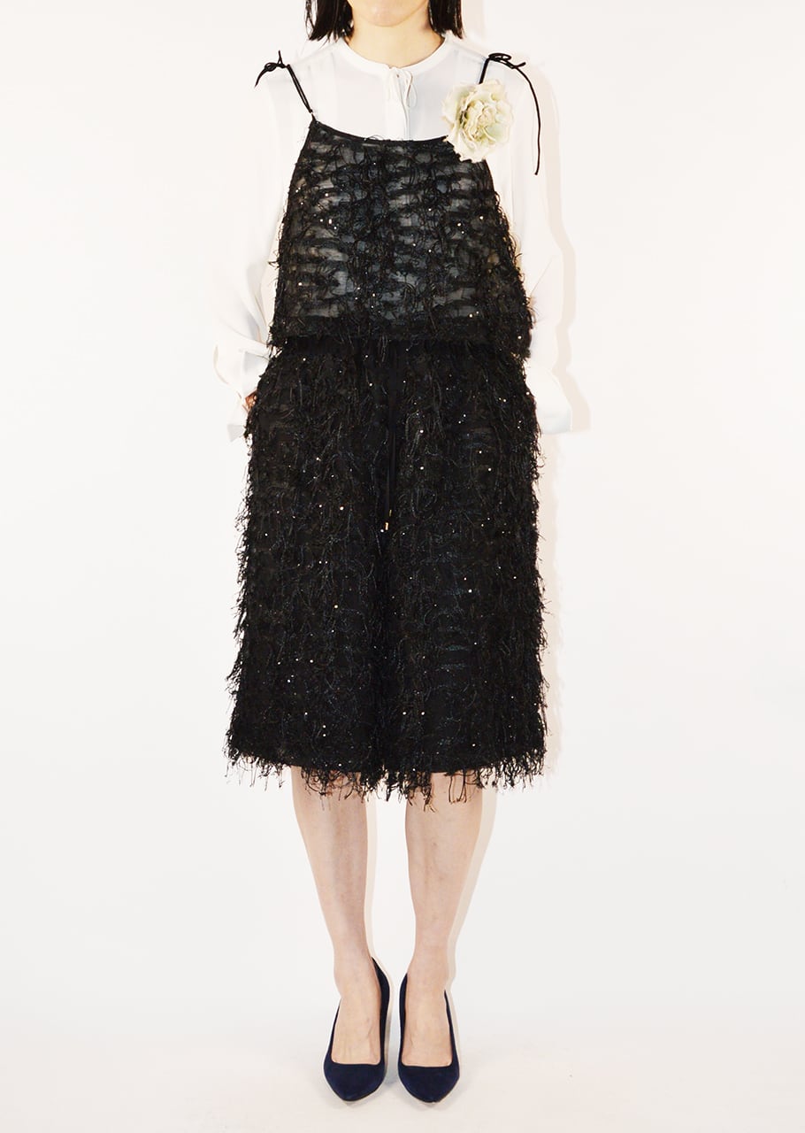イタリアSOLUZIONI社のカットジャカードを使用、カット部分は手間をかけて丁寧に処理することで表面のムラや引っかかりを抑えたパンツです。メッシュ状のシアーな生地に繊細なフリンジを施し、小さなスパンコールが動くたびにさりげなく輝きます。イージーなゴムウエスト部分は、ドローコードでフィット感の調節が可能。