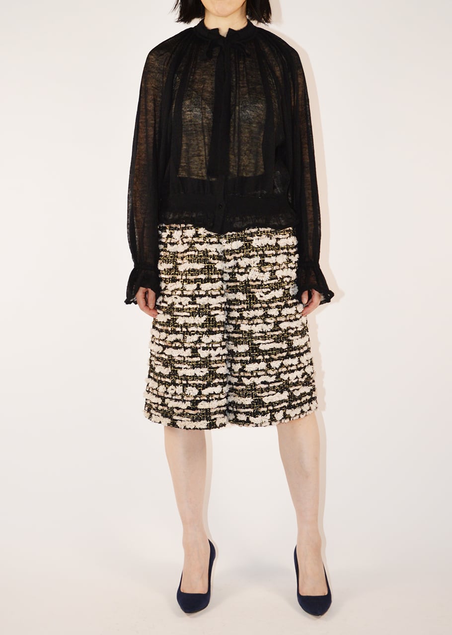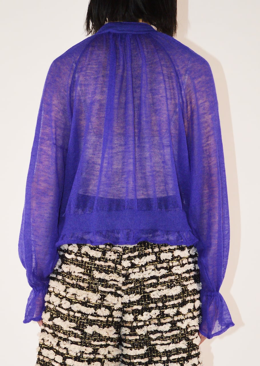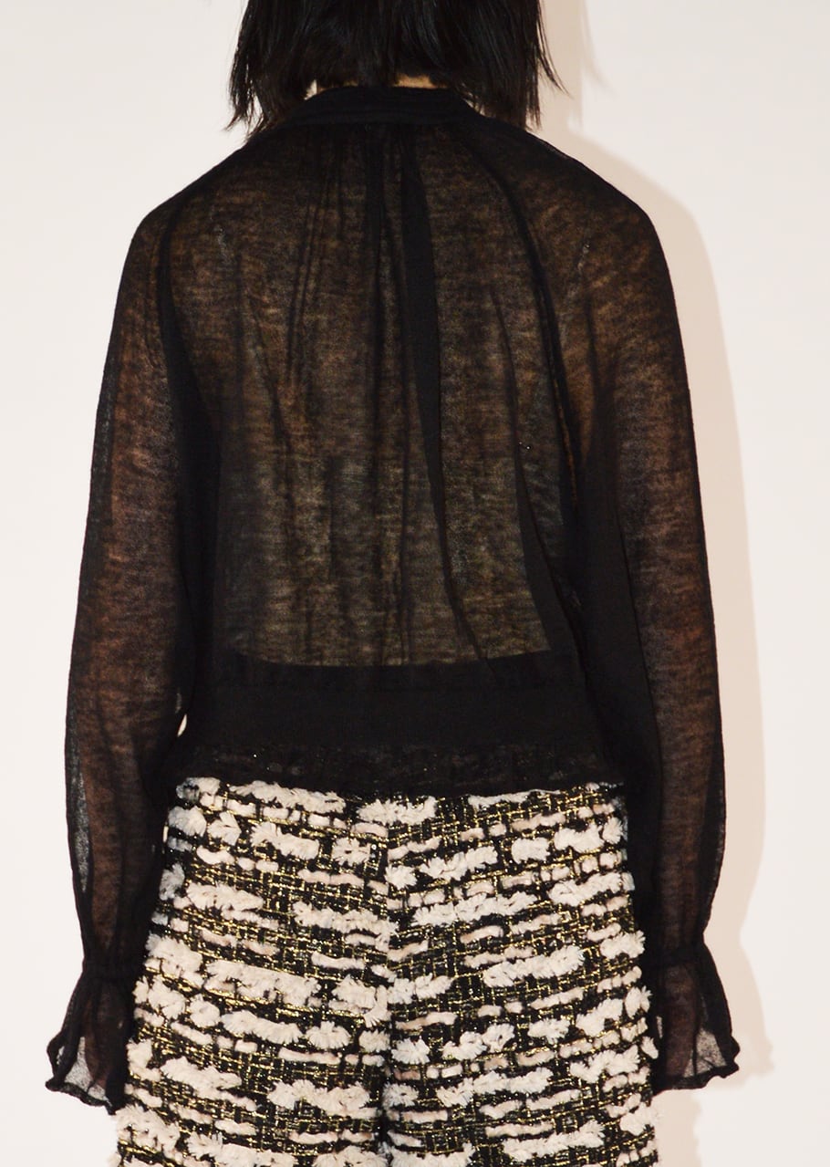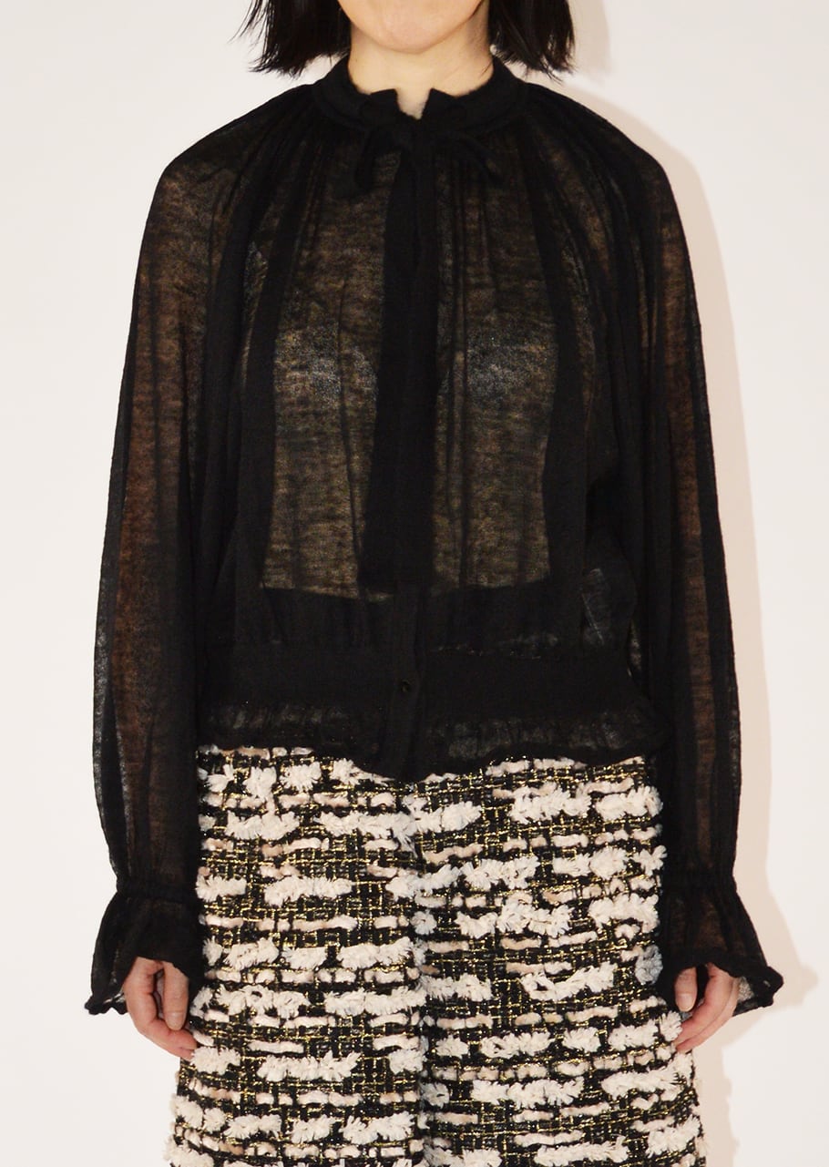 通常は流通しない高級モヘアを使用、モヘアならではの光沢と発色だけでなく、ニットとは思えないほどの繊細と軽さを表現したカーディガンです。糸が細いため肌触り良く、シアーな風合いを楽しむことができます。