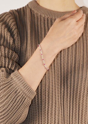 やわらかく手首に馴染むシルバーチェーンにカラークリスタルをあしらったブレスレット。控えめな華やかさがデイリーな装いにぴったりなアイテムです。