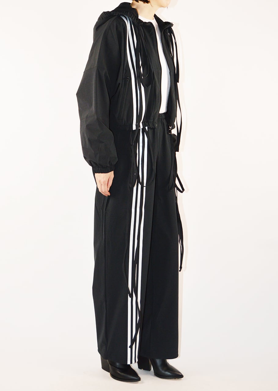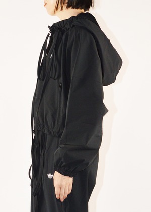 フェミニンなドレープ感が目を引くトラックトップ。ショートレングス&オーバーサイズのシルエットで、大きめのフードにはやや長めのドローコードをあしらい、リボンを大胆に結べるように仕上げています。