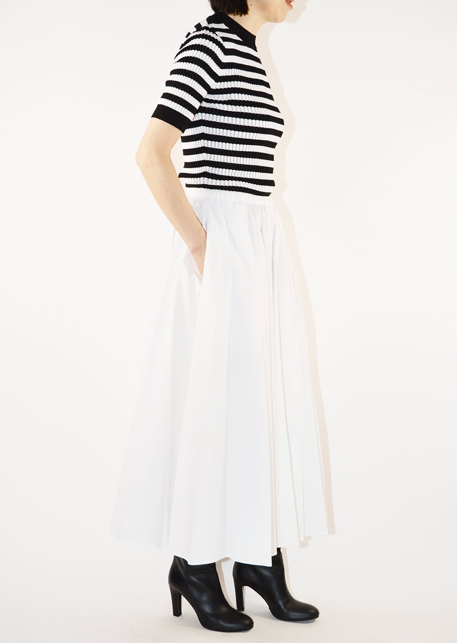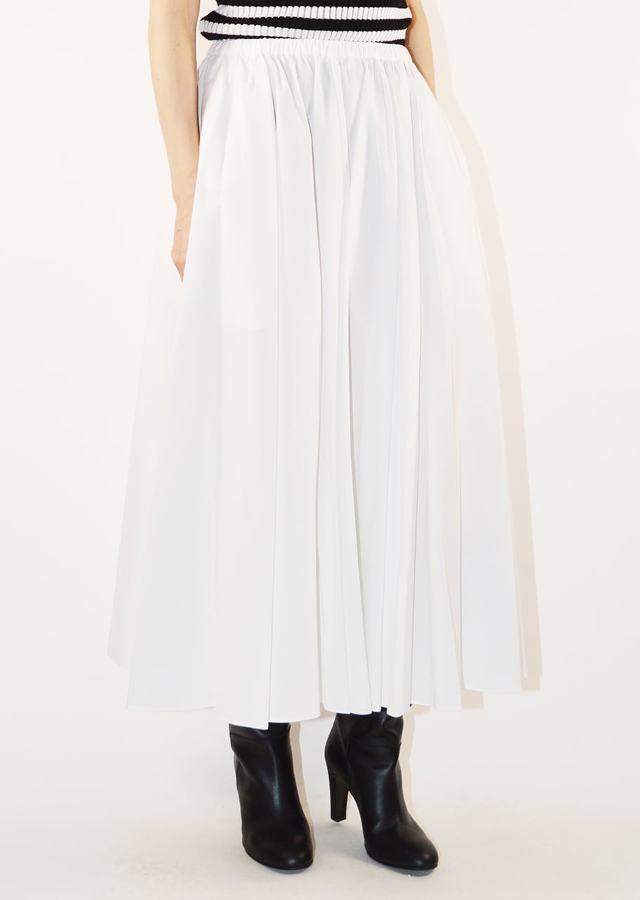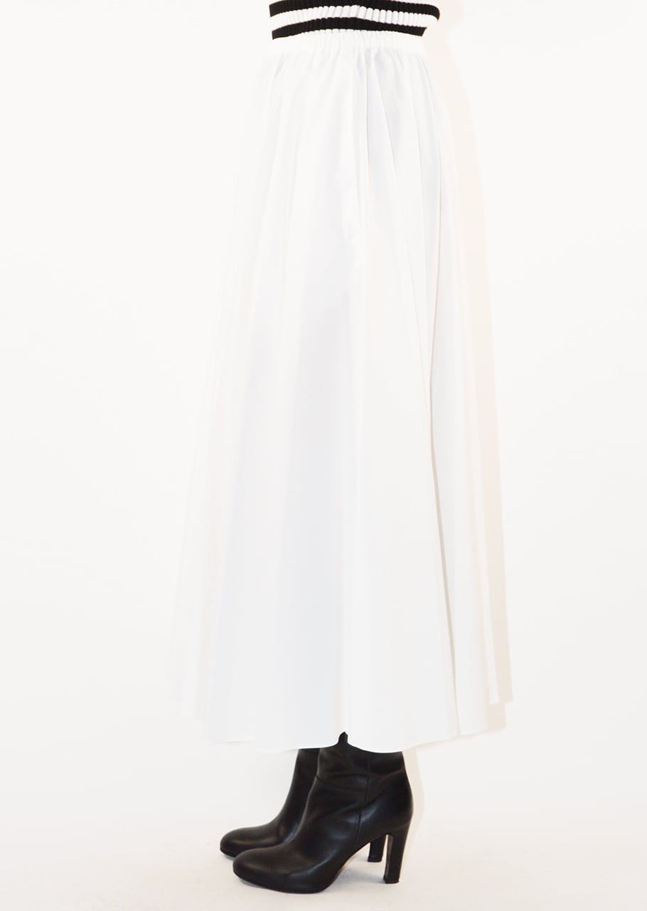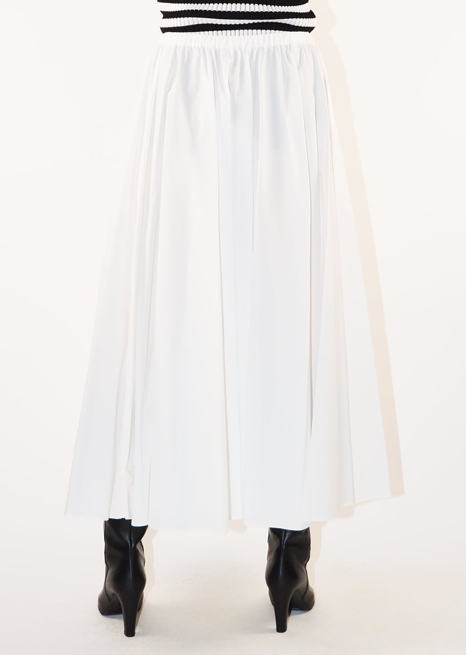 オーガニックコットン100%のギャザースカート。ウエストに施されたランダムなタックとギャザーがによって裾に向かったきれいなボリュームをうみ出しています。柔らかな素材なのでボリューム感も軽快に履けるのもポイント。上品なミディ丈でバランスよく取り入れられます。